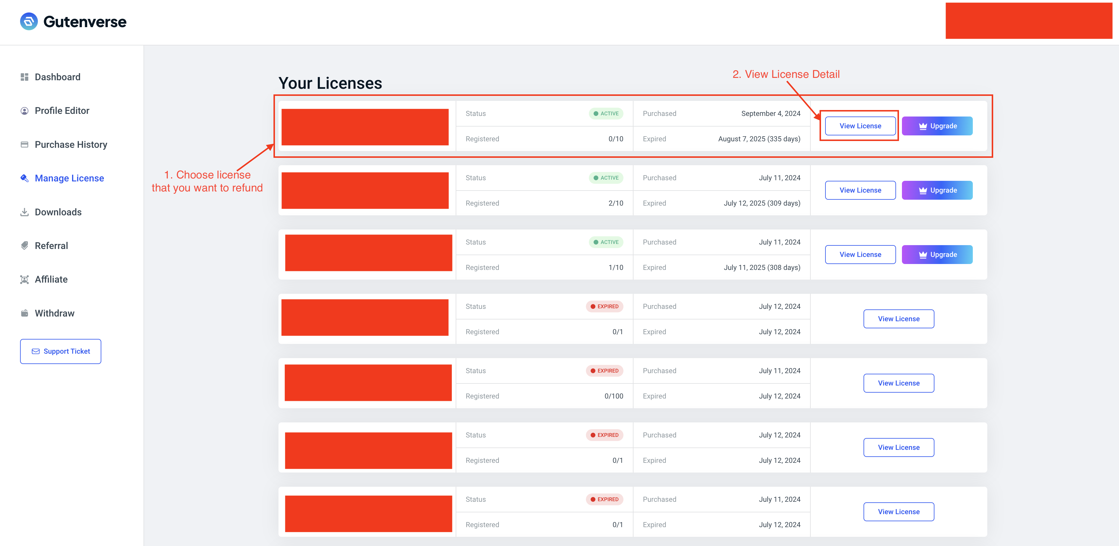 3. Then choose the license that you want to refund and click “View License” button to view license detail.