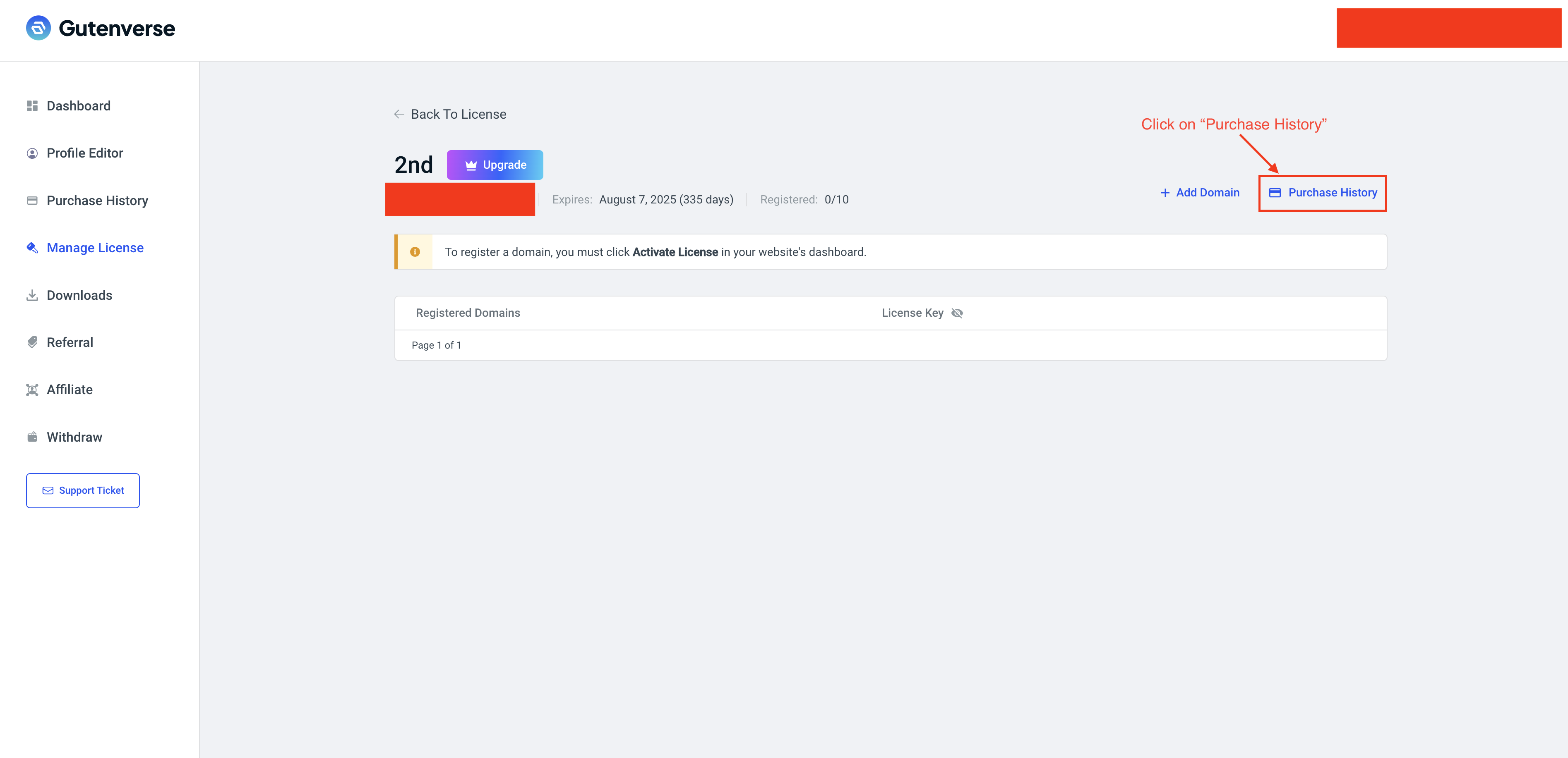 4. In License Detail, click on “Purchase History” to access purchase history of the license.