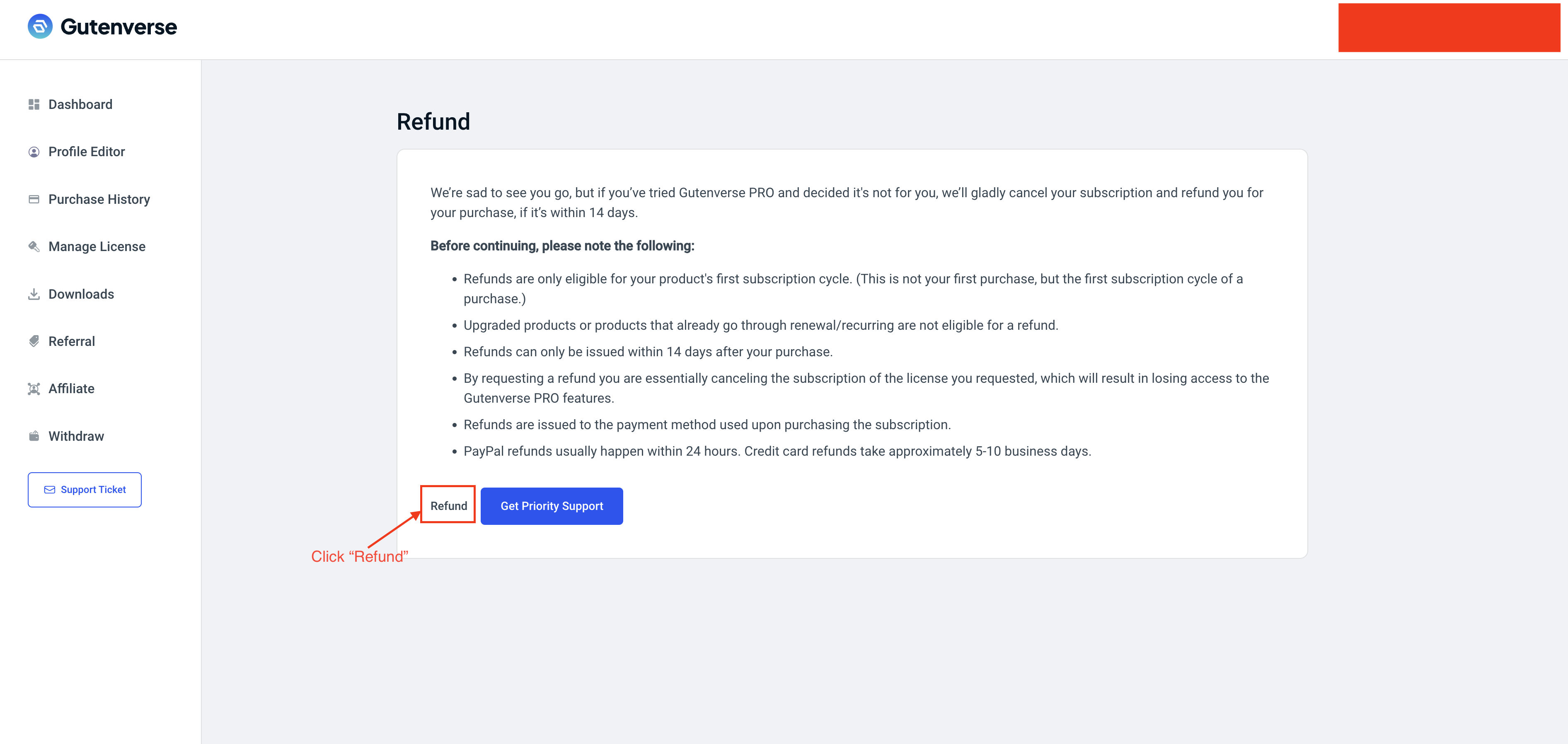 7. After reading all the notices, you can click the ‘Refund’ button to proceed with the refund process, or click the ‘Get Priority Support’ button if you’re still unsure.