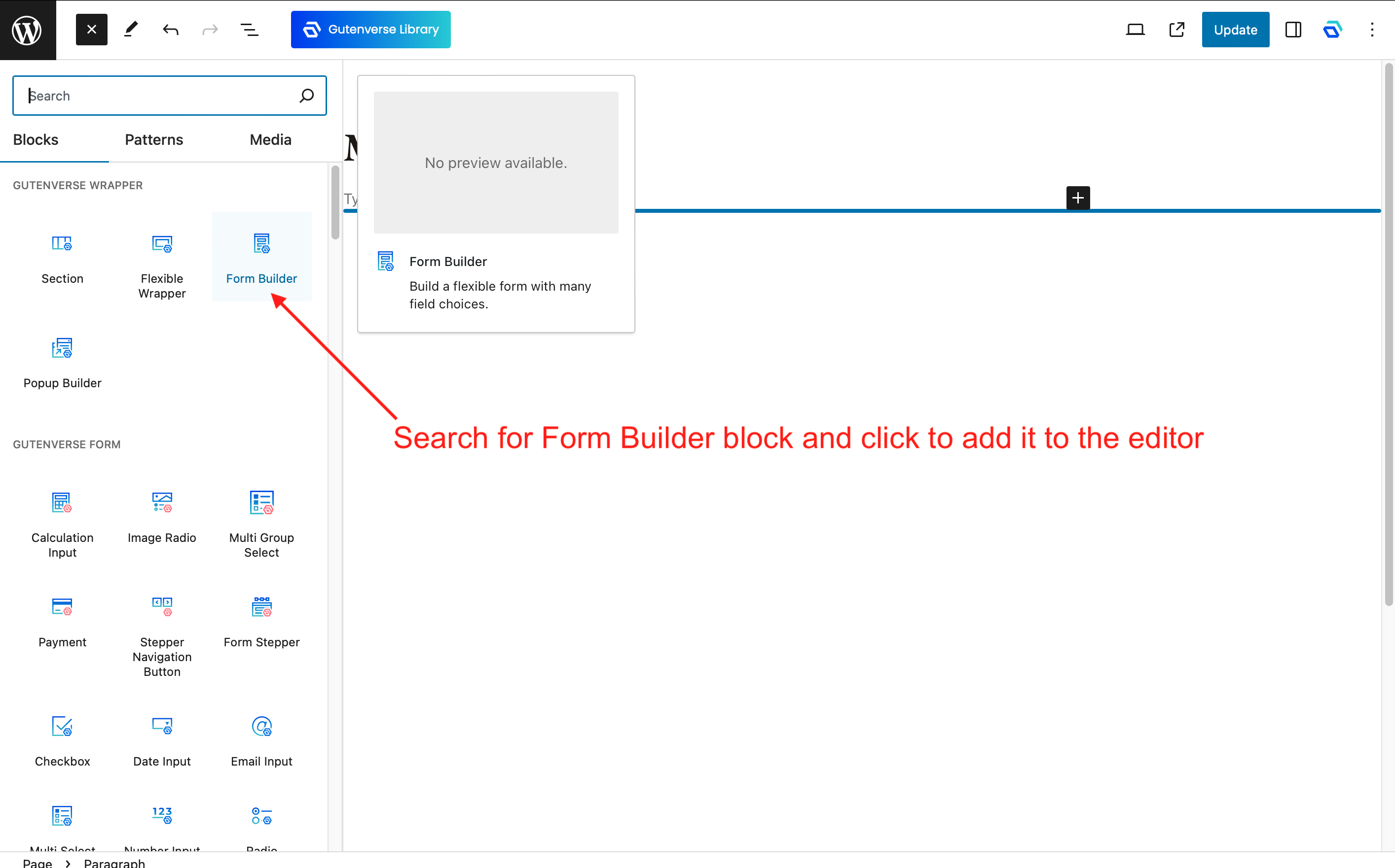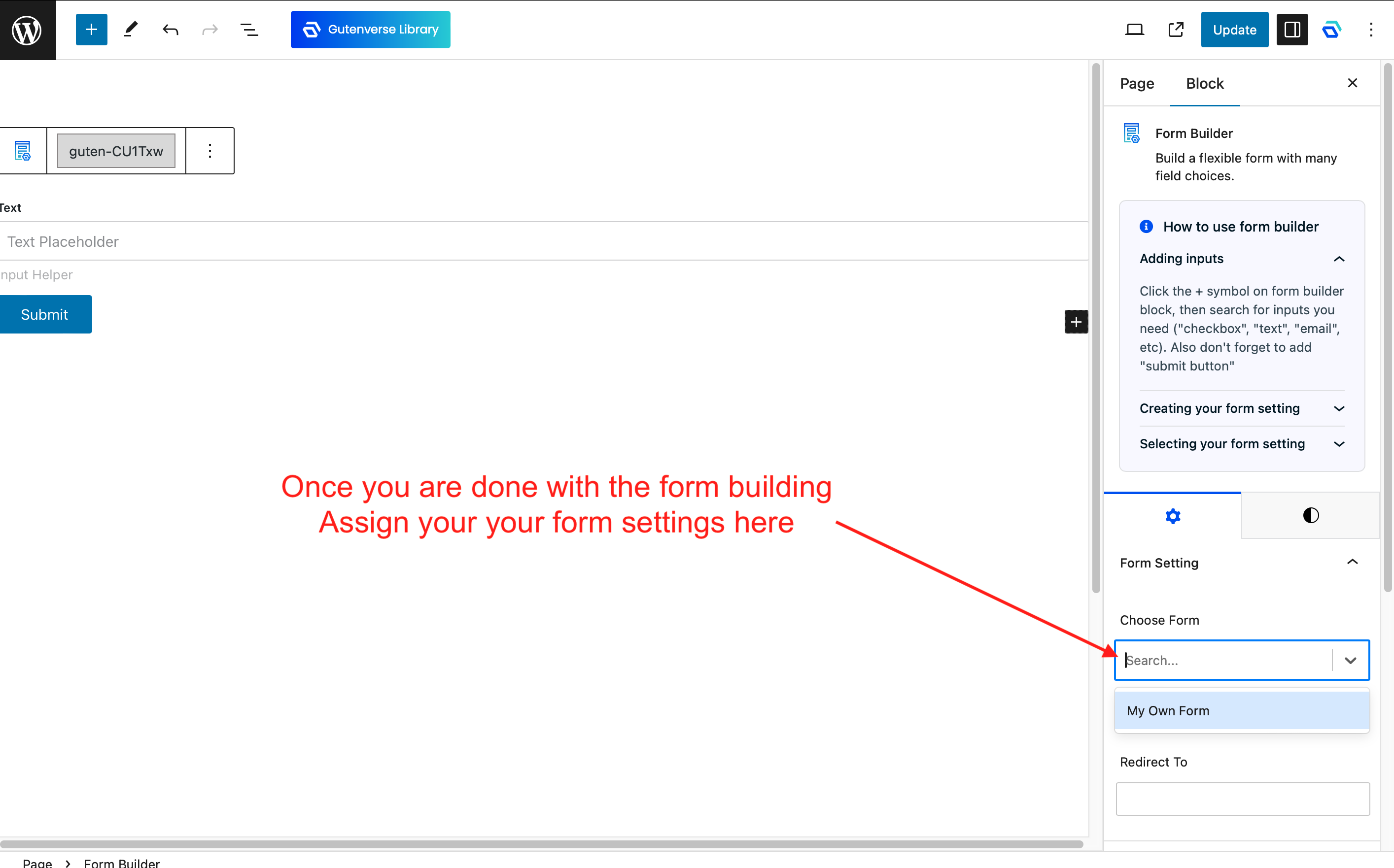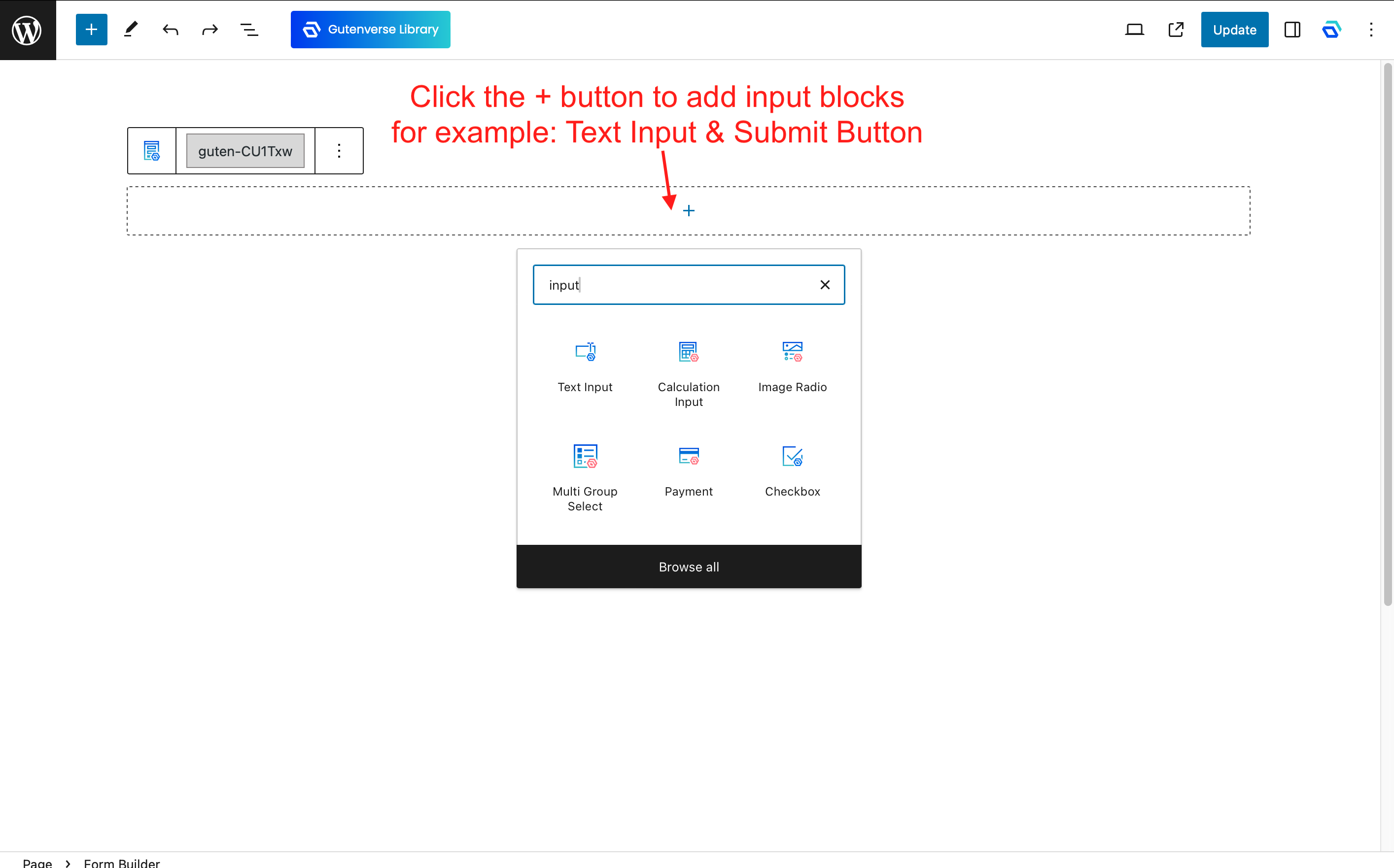 2. Once the form builder block is added, click on the block + icon to add input blocks such as Text Input and Submit Button