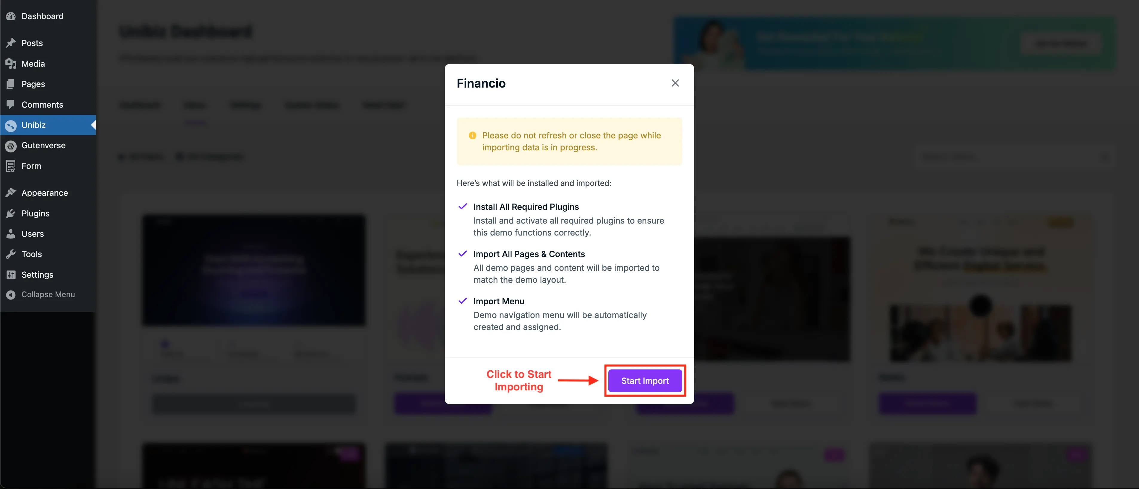 Unibiz offers two ways to import demos: via the setup wizard or from the dashboard. Follow the steps below to get your site ready quickly.