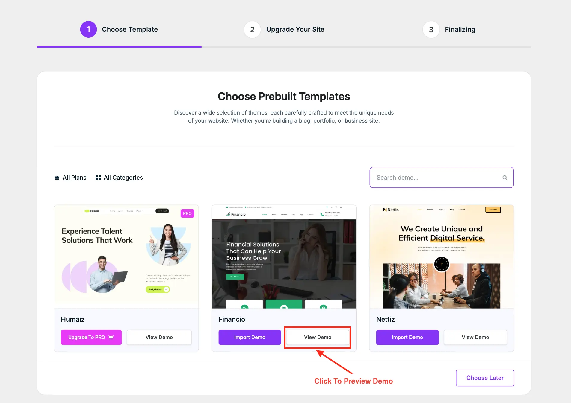 Once you’re inside the setup wizard, on the first step of the wizard, select the demo you want to import. Use the filter or search feature to find your preferred theme or template. To ensure it’s the right one, click View Demo to preview it before importing.