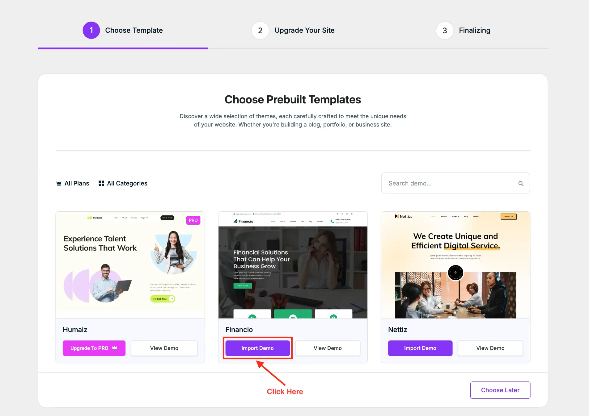 From the demo list page, select the demo you want to import. Use the filter or search feature to find your preferred theme or template. To ensure it’s the right one, click View Demo to preview it before importing.