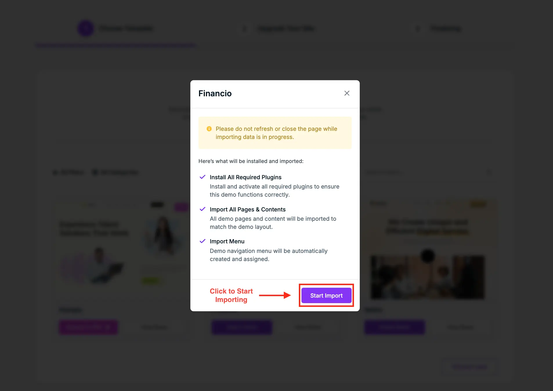 To install demos, click Import Demo to confirm your selection. Then, click Start Import to begin installing the chosen demo on your site.