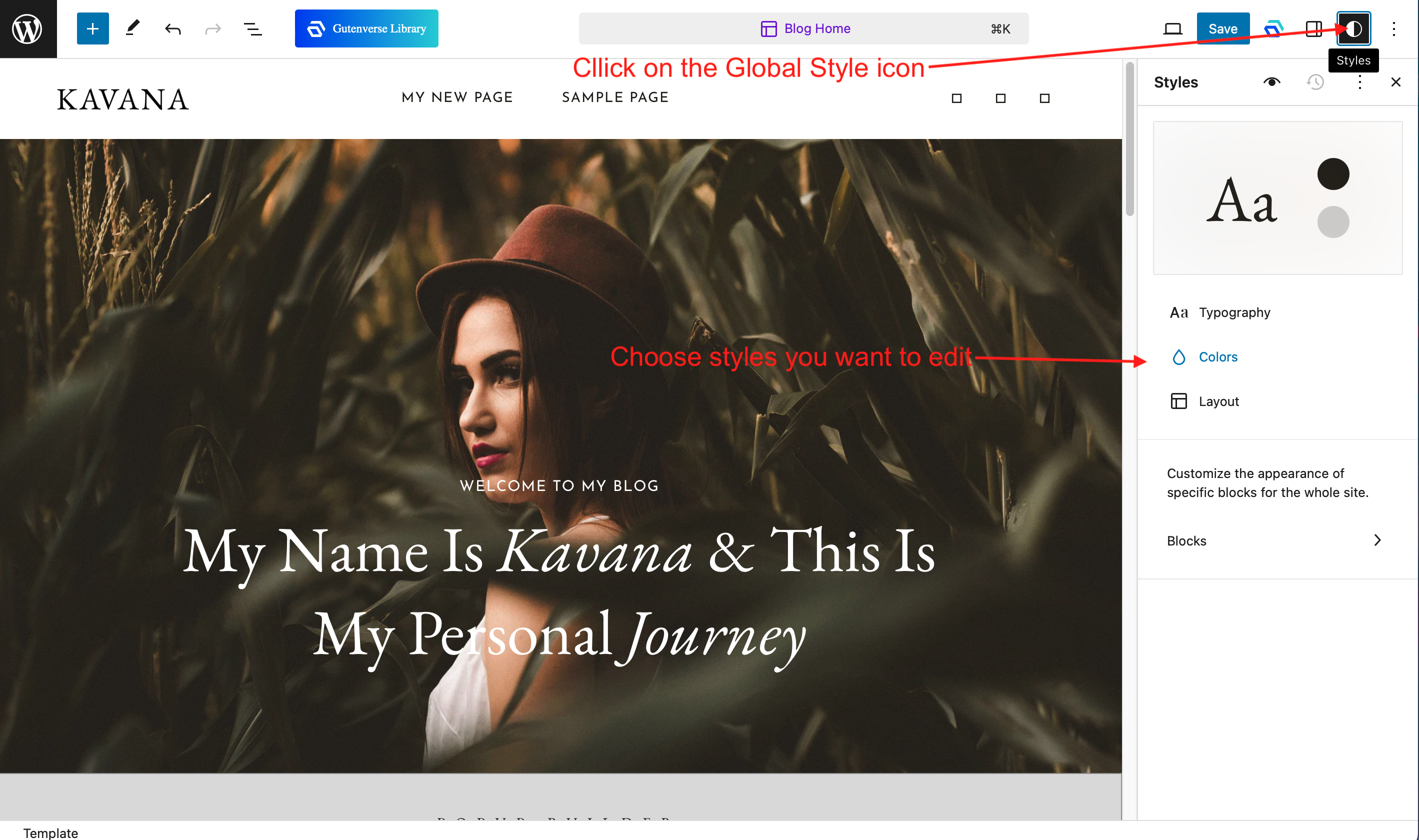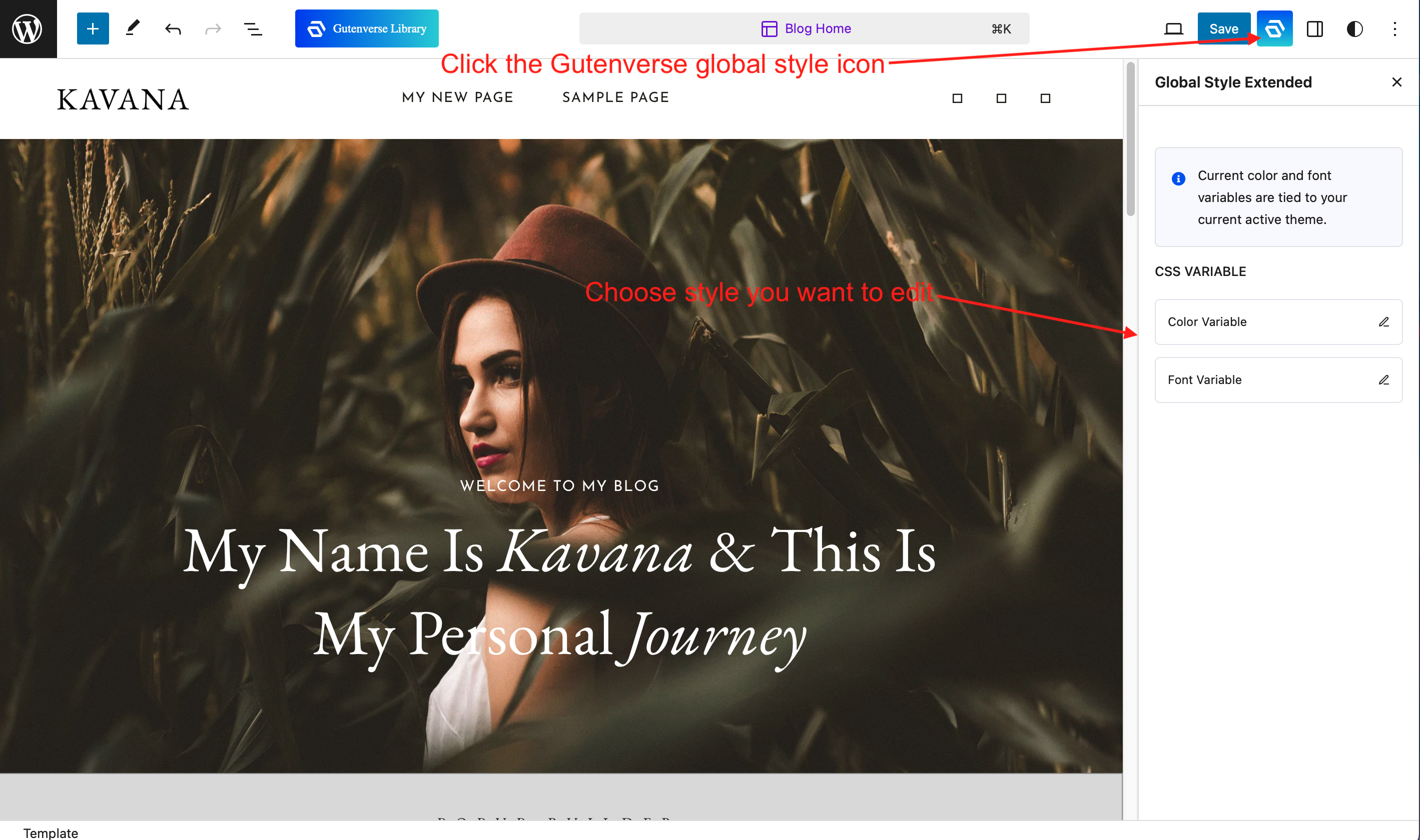 3. On the top right corner of the editor, click on the Gutenverse Global Style icon.