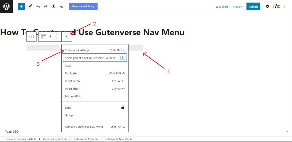 Click on the Nav Menu Block -> Option icon -> “Show more settings” to configure Gutenverse Nav Menu. Then a new tab will appear.