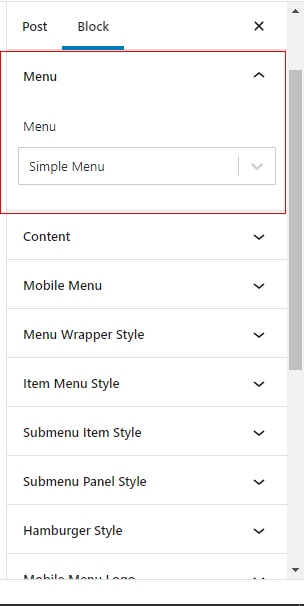 On this tab, you can see there are several sections that we can configure to manage or edit our Gutenverse Nav Menu. In the Menu section, you can choose the menu that you’ve made, in this example the menu is called Simple Menu.