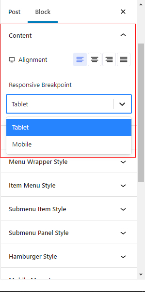 In the content section, you can adjust the menu alignment and responsive breakpoints.