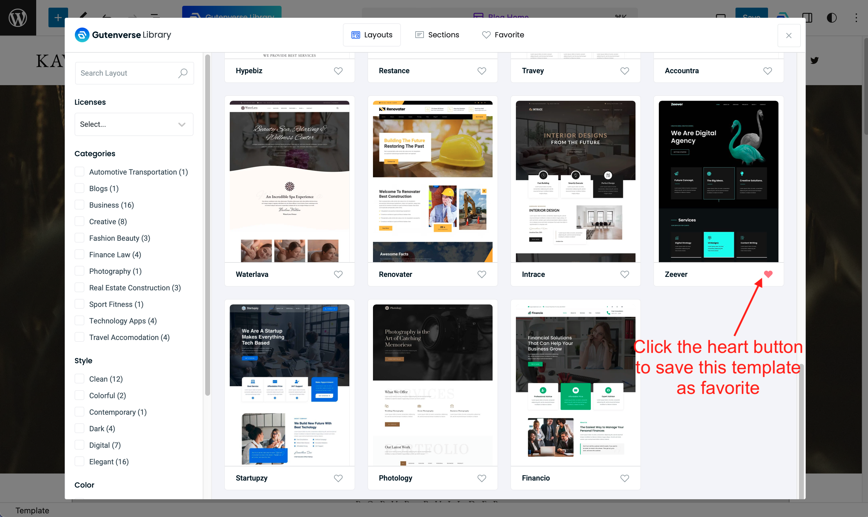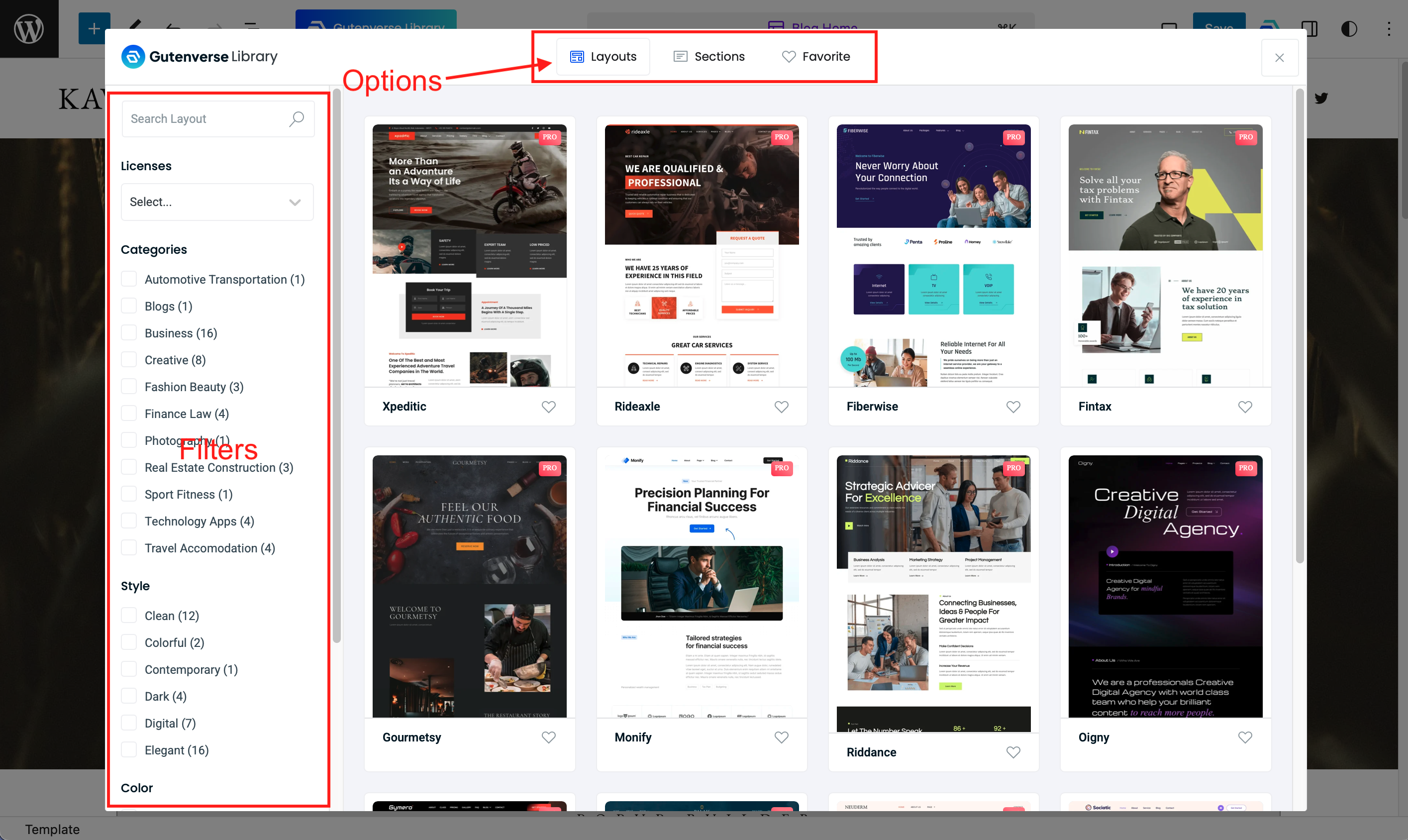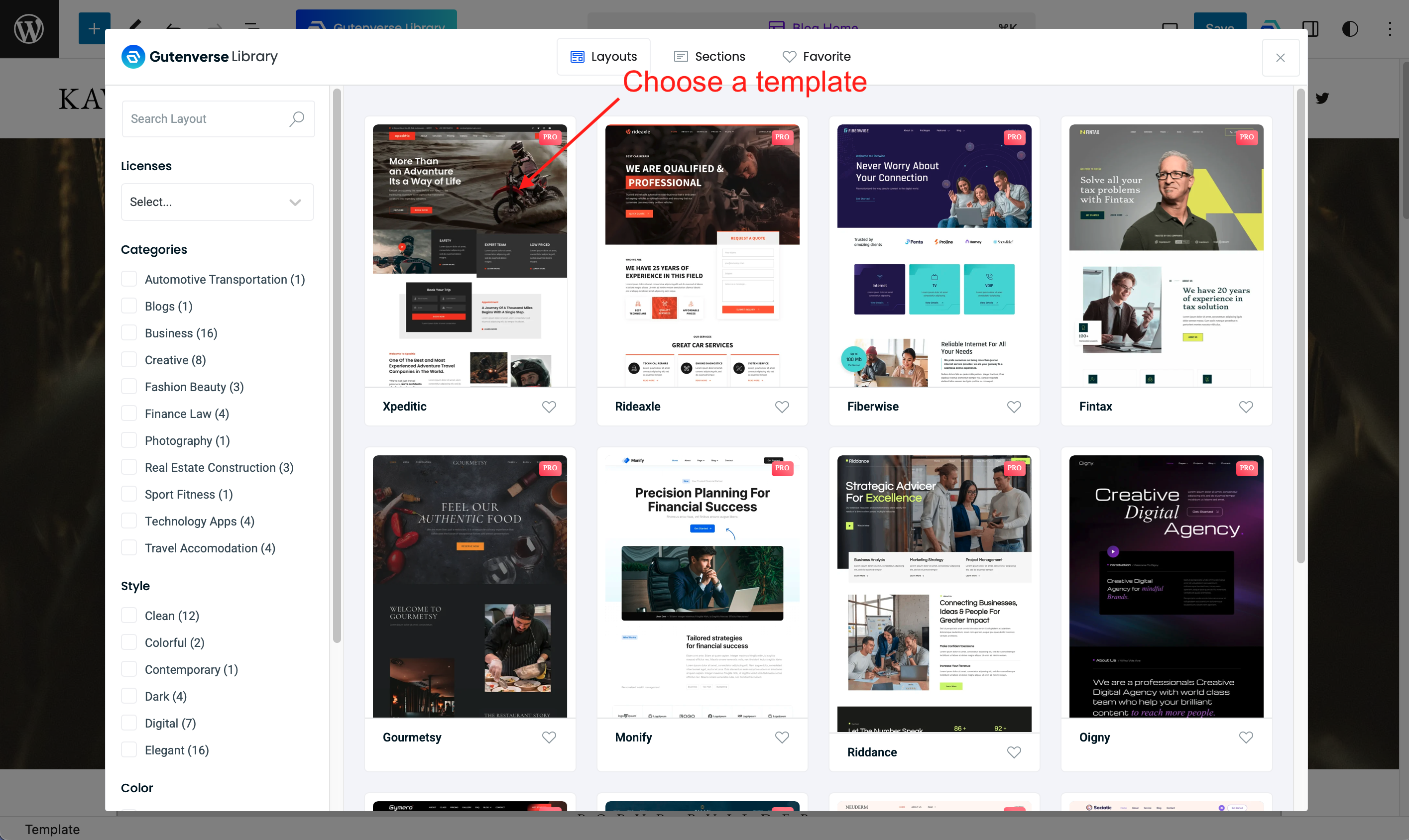 The template library is divided into Layout, Sections, and Favorites.