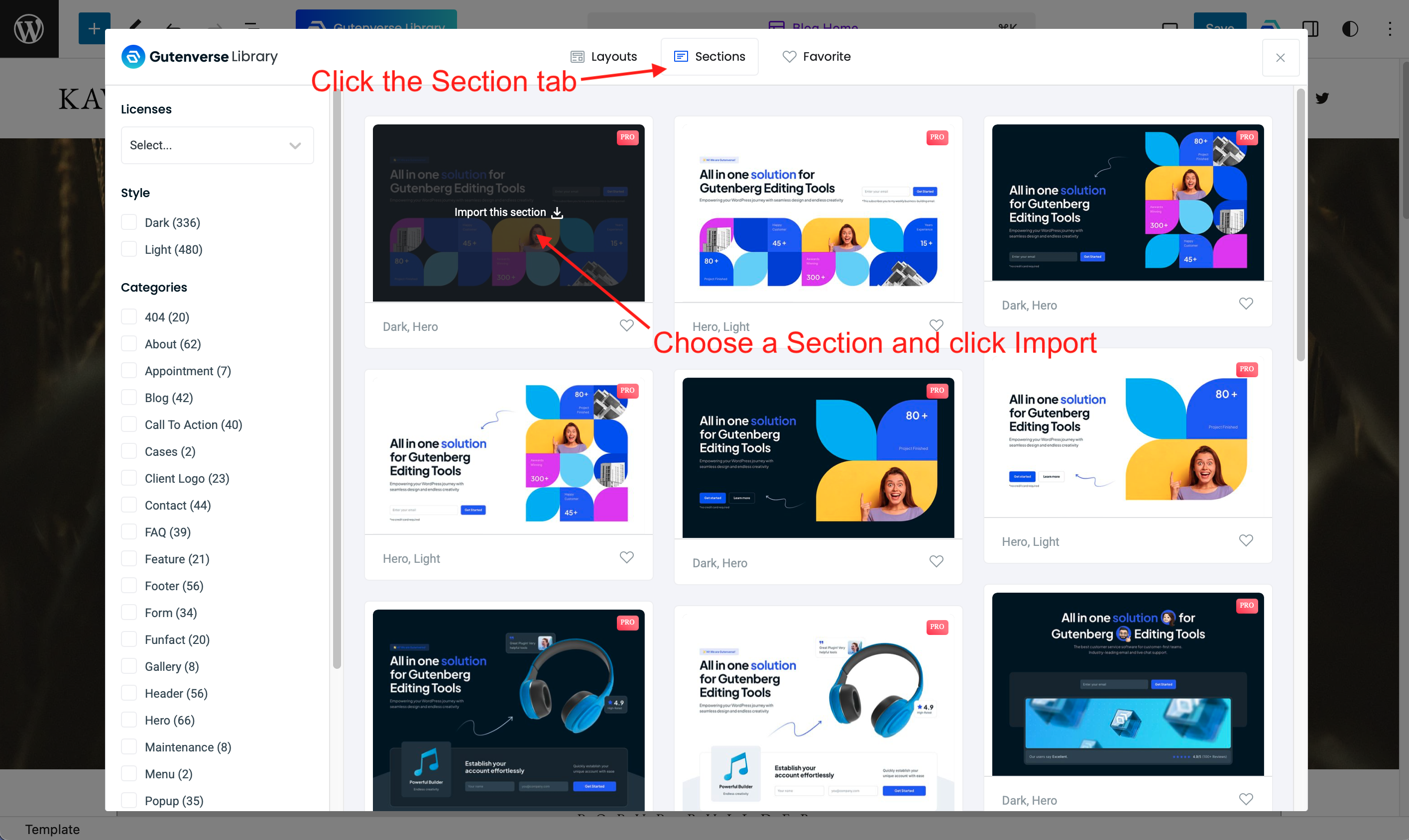 Then a list of sections will appear, click Import on the section you want to use.