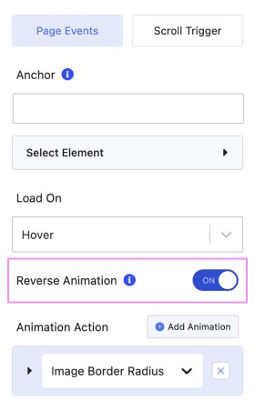 To make the element return to its original state when the mouse moves away, activate Reverse Animation by setting Reverse Animation -> ON.