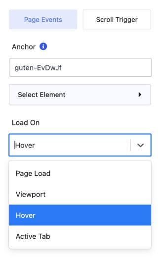On Page Events, you need to set an Anchor first to initiate the animation. Once the anchor is set, select the animations to Load On -> Hover.