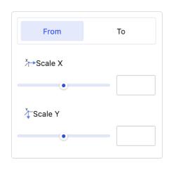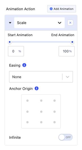 After selecting Scale, you must set Start or End Animation, and Easing. If you want the animation to repeat itself, you can set Toggle Infinite to On. In these settings there are From and To tabs, From to set the start of the animation position/condition and To to set the end of the animation position/condition..