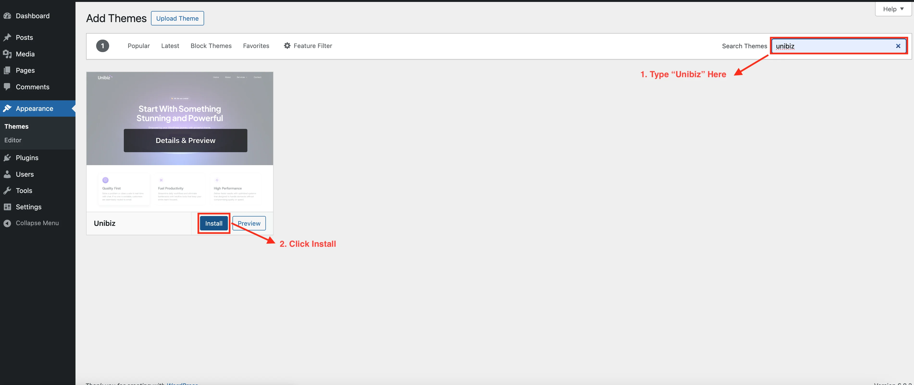 Next, you’ll see a search bar at the top-right corner of the page. Type Unibiz into the search field, and the theme will appear in the results. Click the blue Install button to begin the installation.