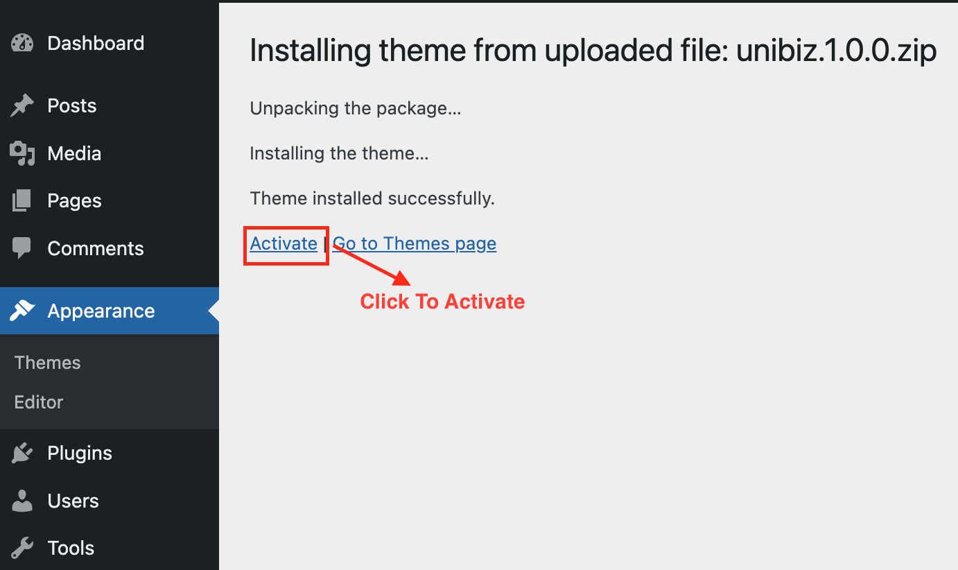 Once the theme file has been uploaded, click the Install Now button. After the installation is complete, click Activate link to enable the Unibiz theme.