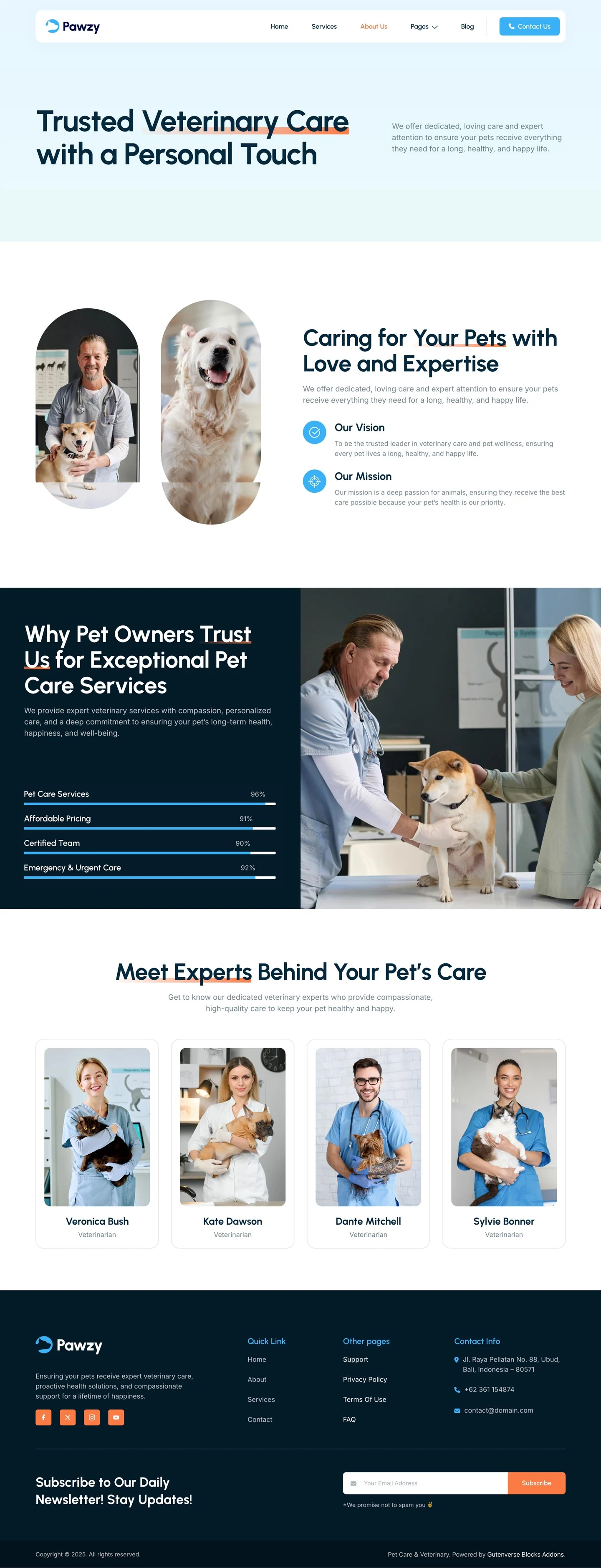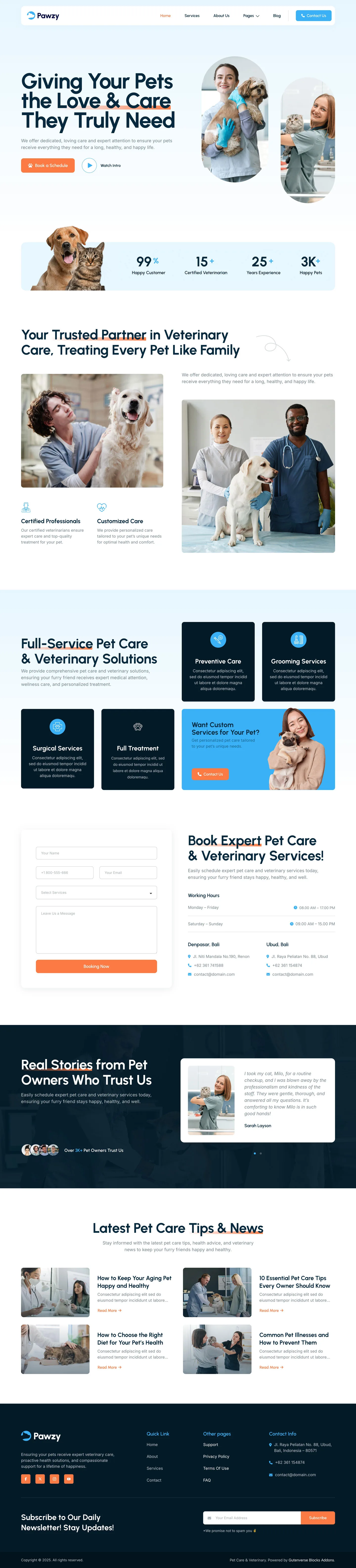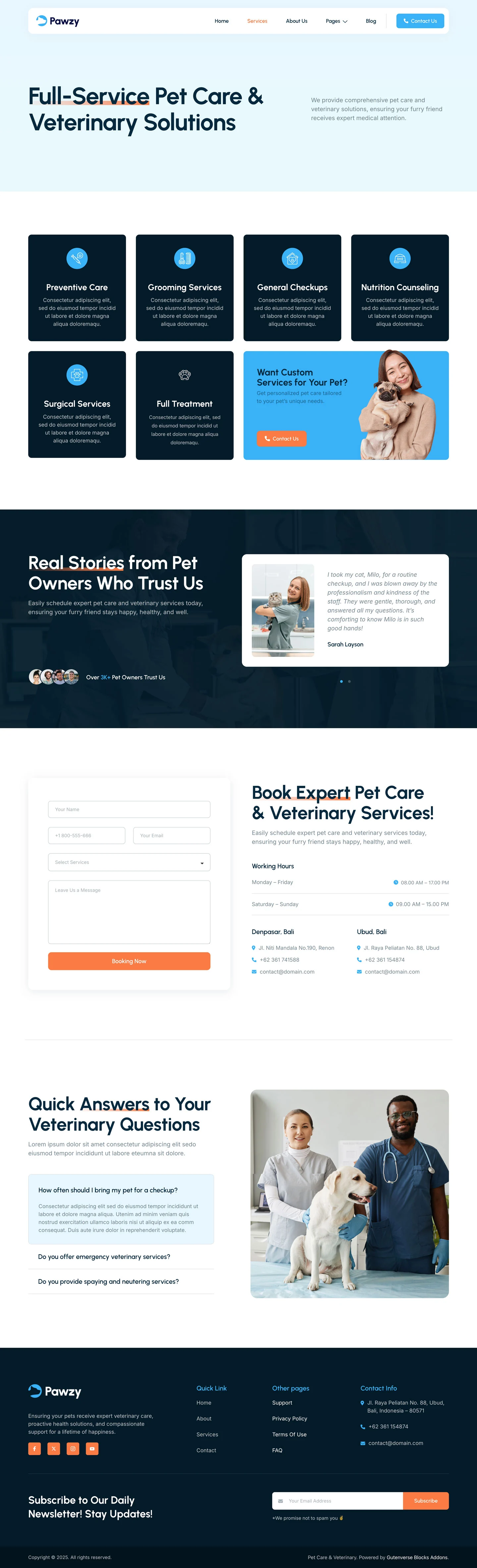 Pawzy offers a friendly and compassionate design, perfect for creating professional websites for pet care services and veterinary clinics. Ideal for veterinarians, pet groomers, animal shelters, pet boarding, and pet supply shops. Pawzy helps you build trust with pet owners, highlight your services, and create a warm online presence that animals and their humans will love.