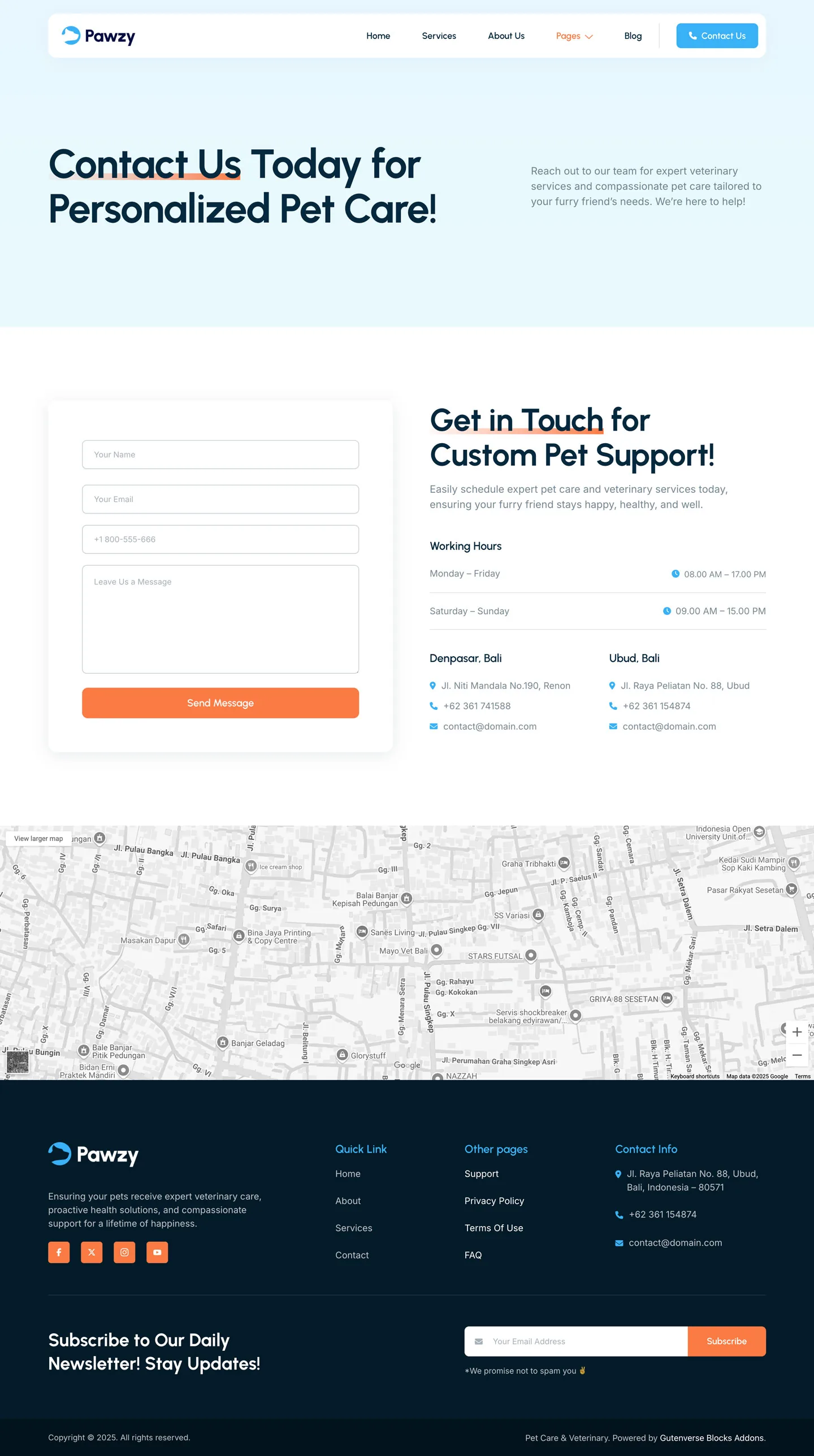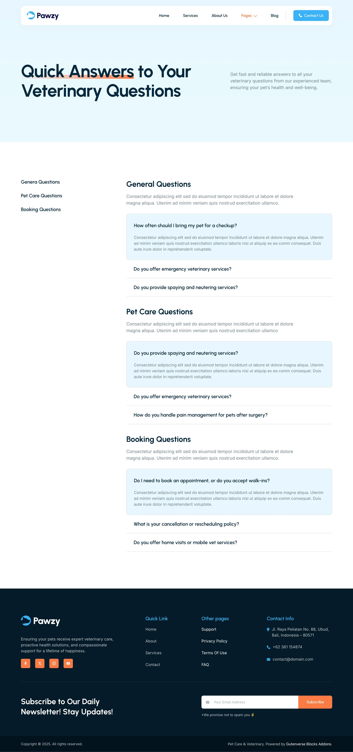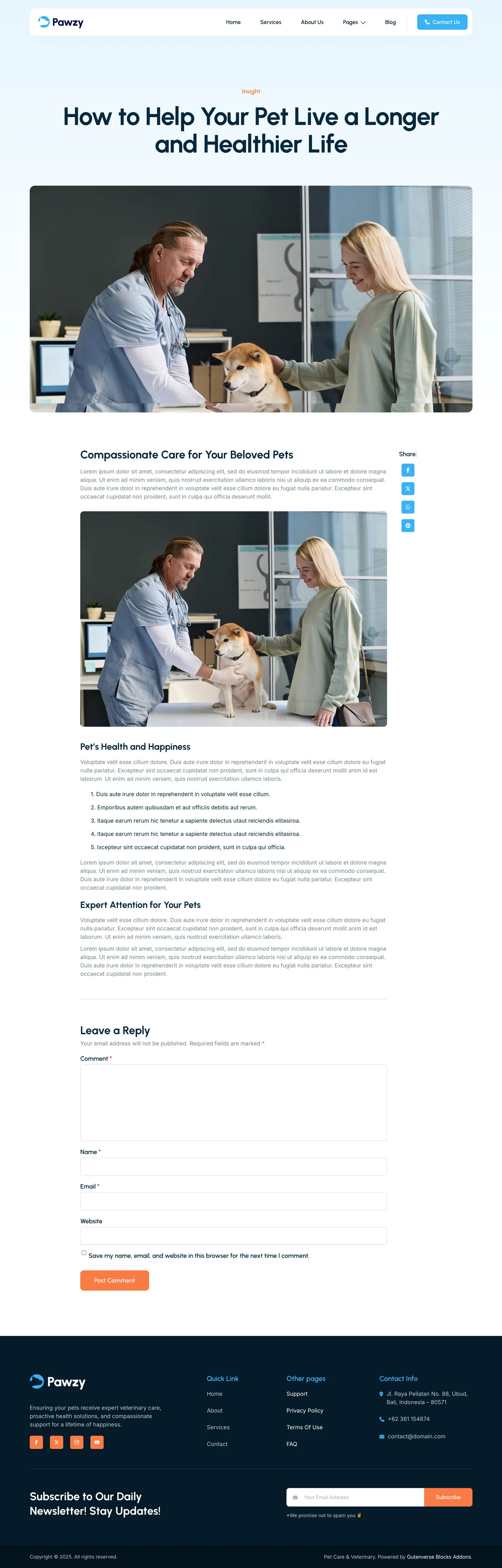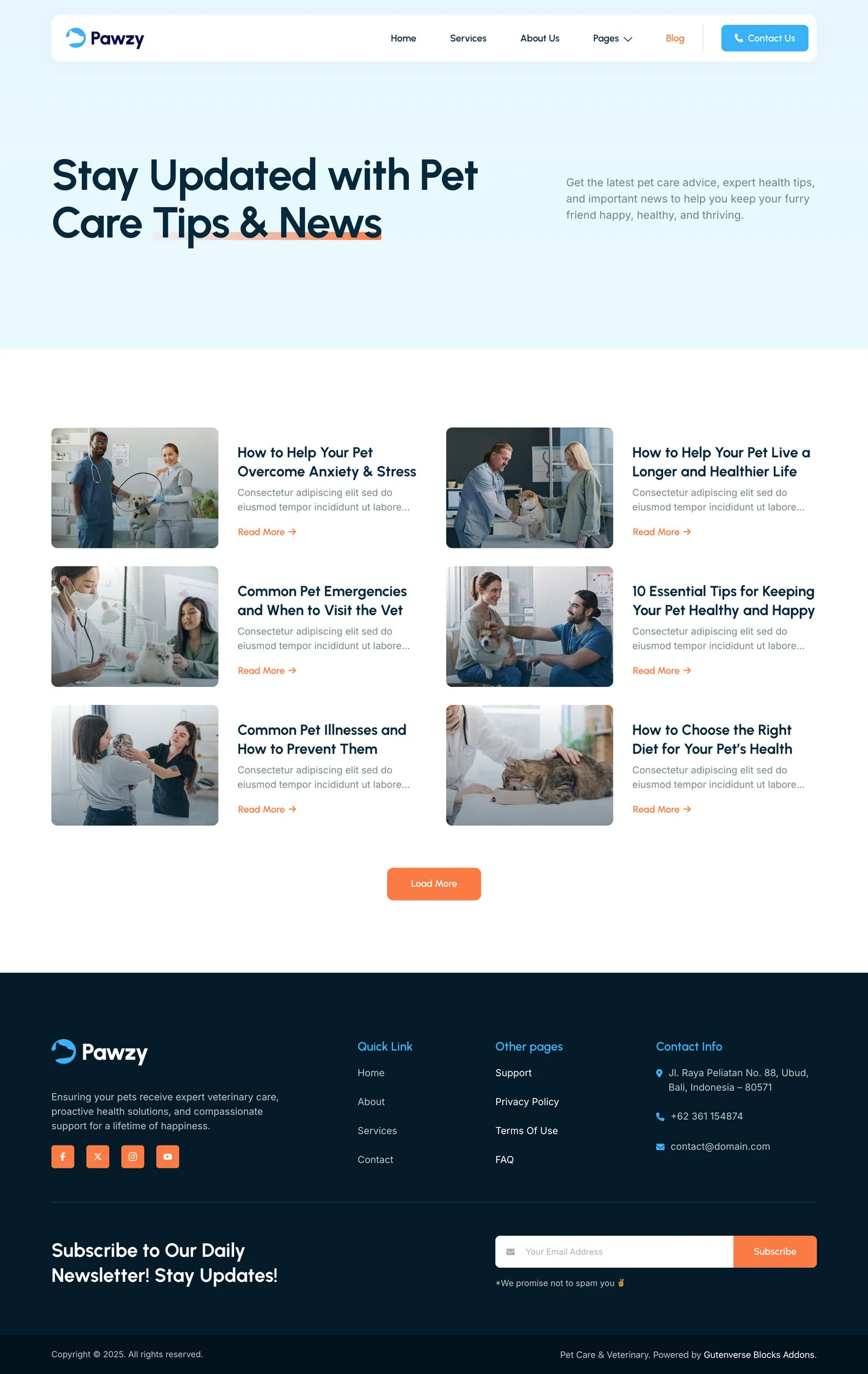 Pawzy offers a friendly and compassionate design, perfect for creating professional websites for pet care services and veterinary clinics. Ideal for veterinarians, pet groomers, animal shelters, pet boarding, and pet supply shops. Pawzy helps you build trust with pet owners, highlight your services, and create a warm online presence that animals and their humans will love.