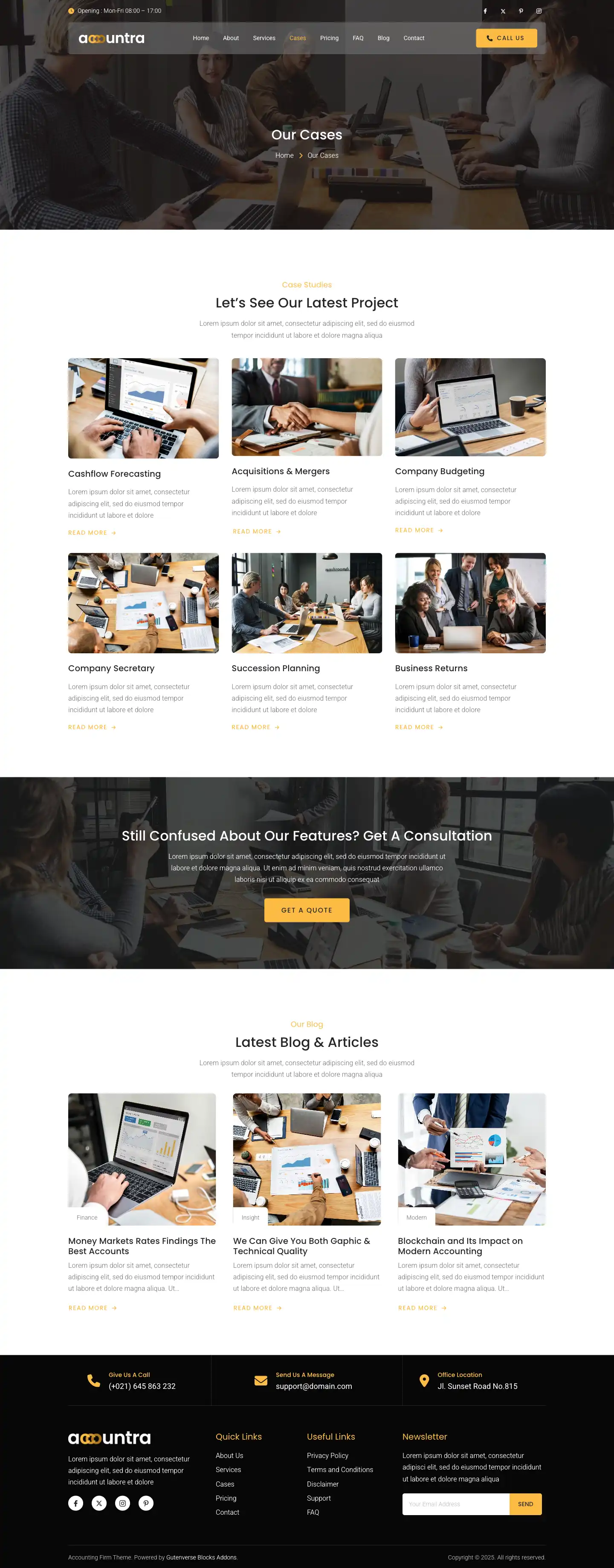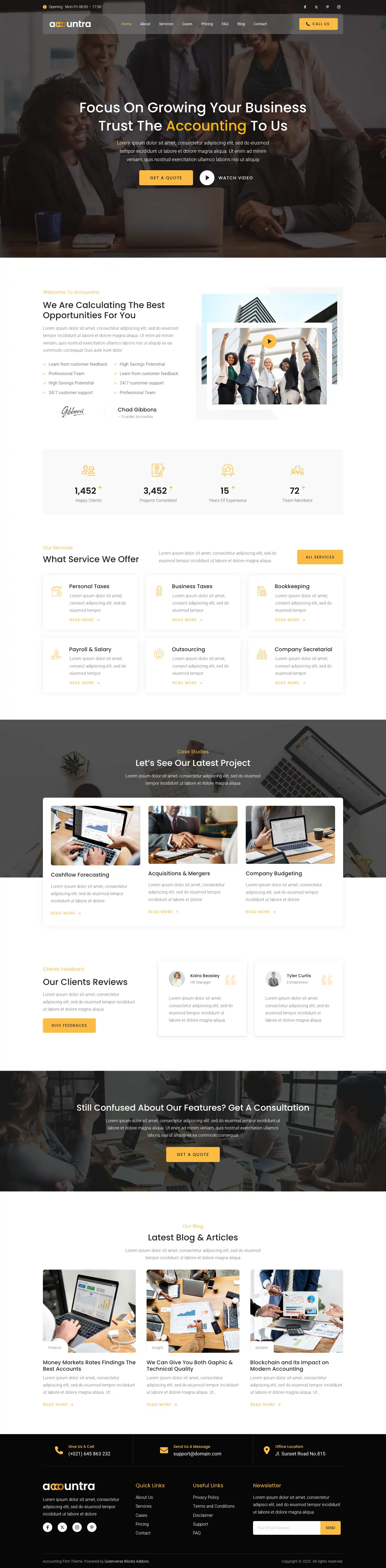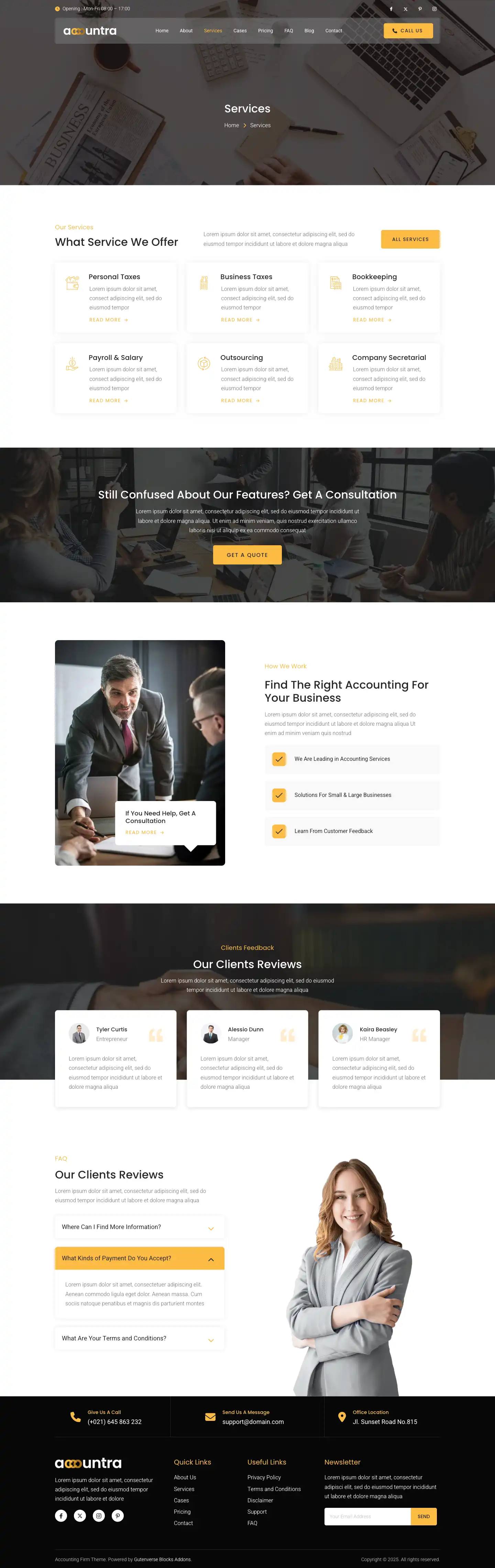 Accountra delivers a clean and professional design, perfect for building websites for accounting and financial service firms. Ideal for accountants, auditors, tax consultants, bookkeeping services, and corporate finance advisors. Accountra helps you present your expertise, highlight your services, and build client trust with a clear and reliable online presence.