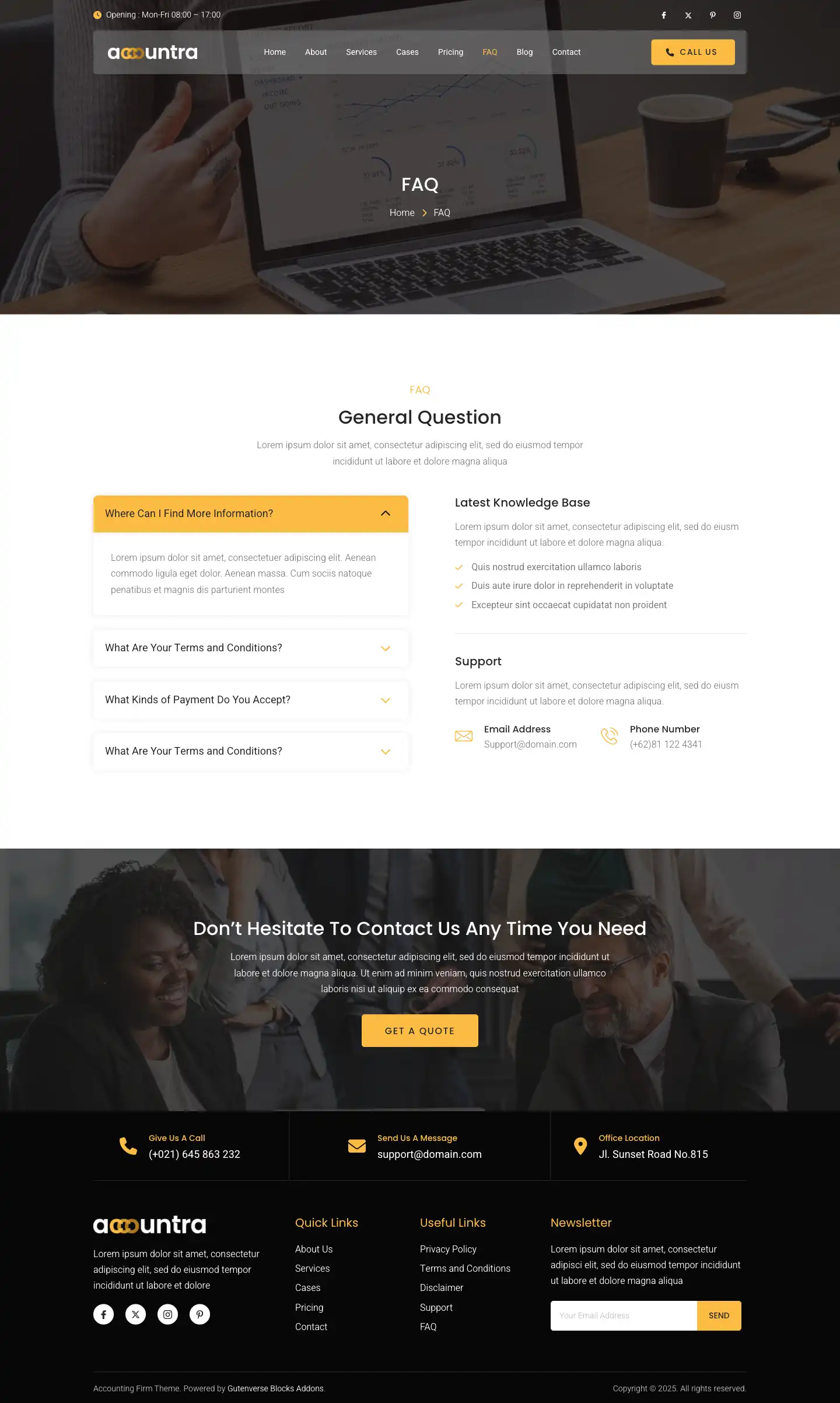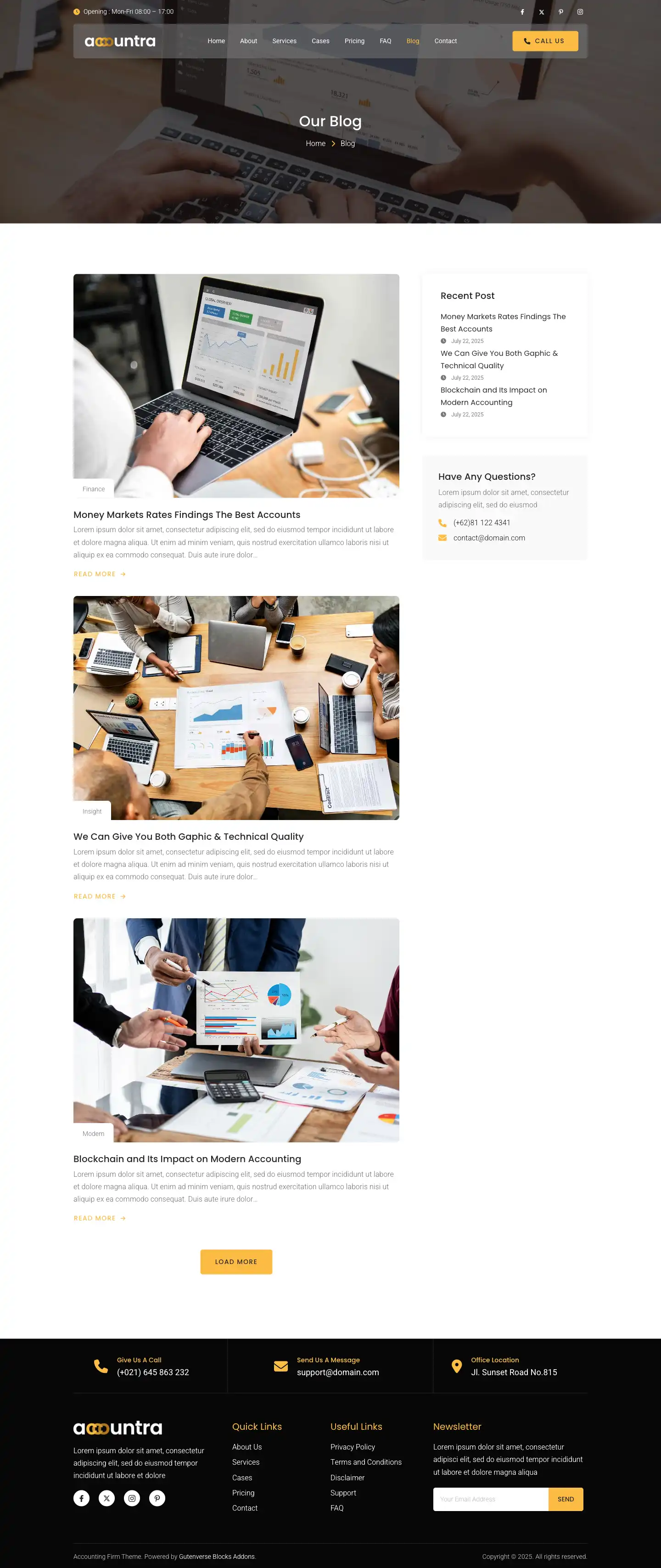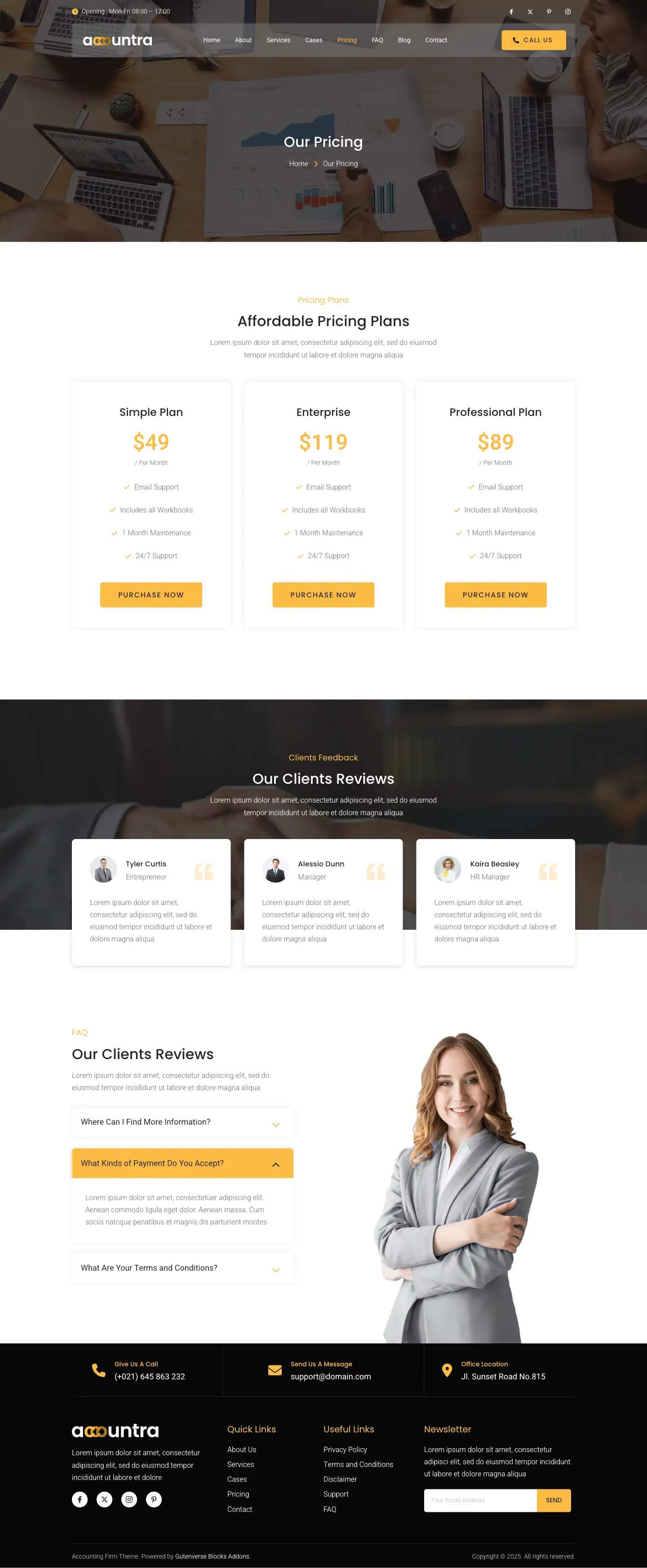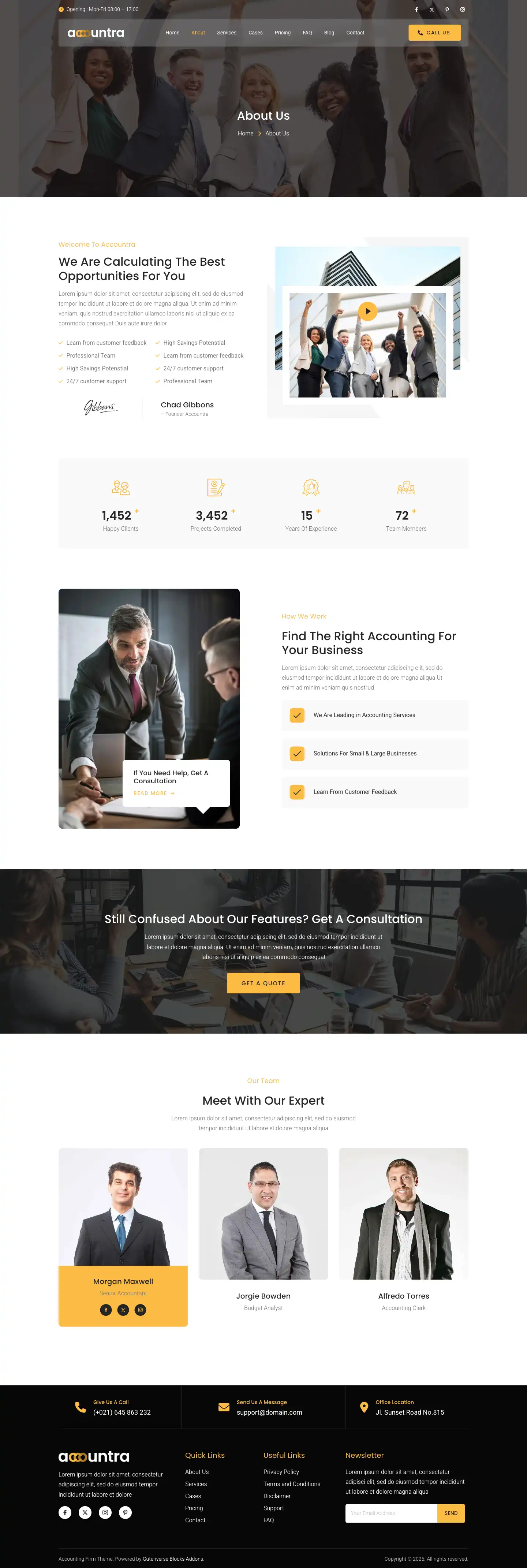 Accountra delivers a clean and professional design, perfect for building websites for accounting and financial service firms. Ideal for accountants, auditors, tax consultants, bookkeeping services, and corporate finance advisors. Accountra helps you present your expertise, highlight your services, and build client trust with a clear and reliable online presence.