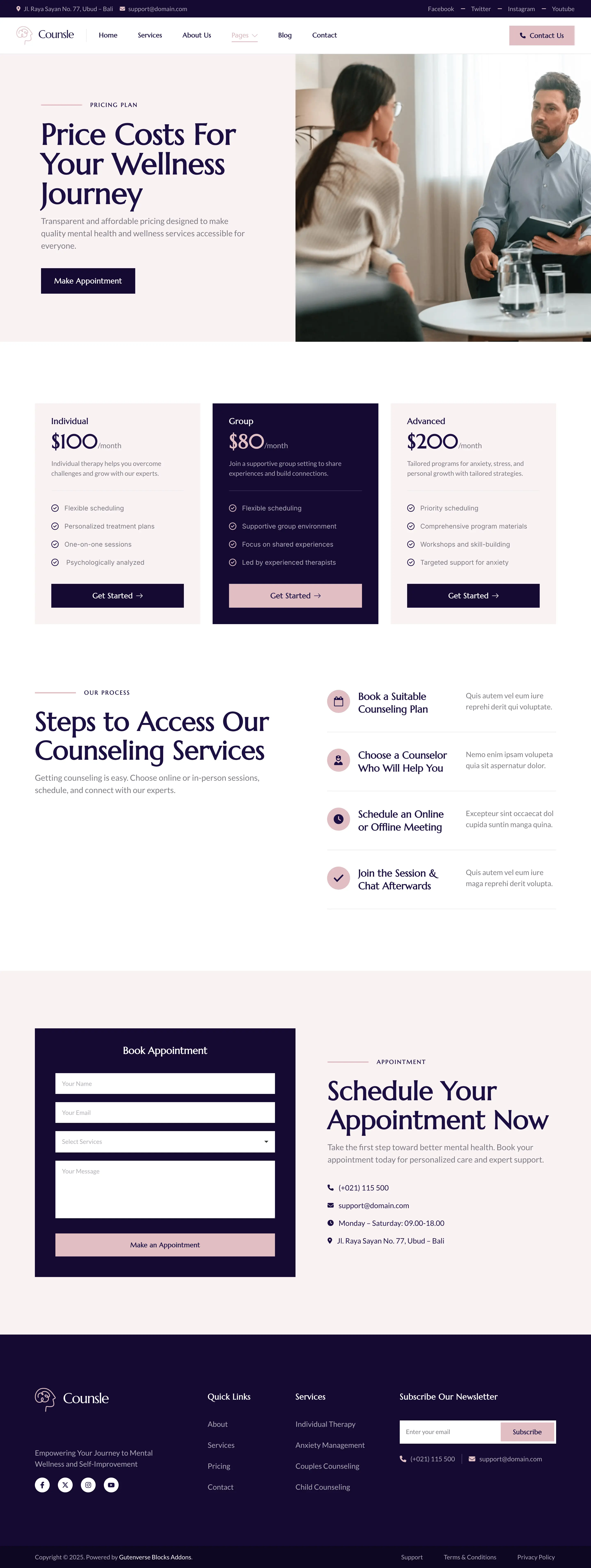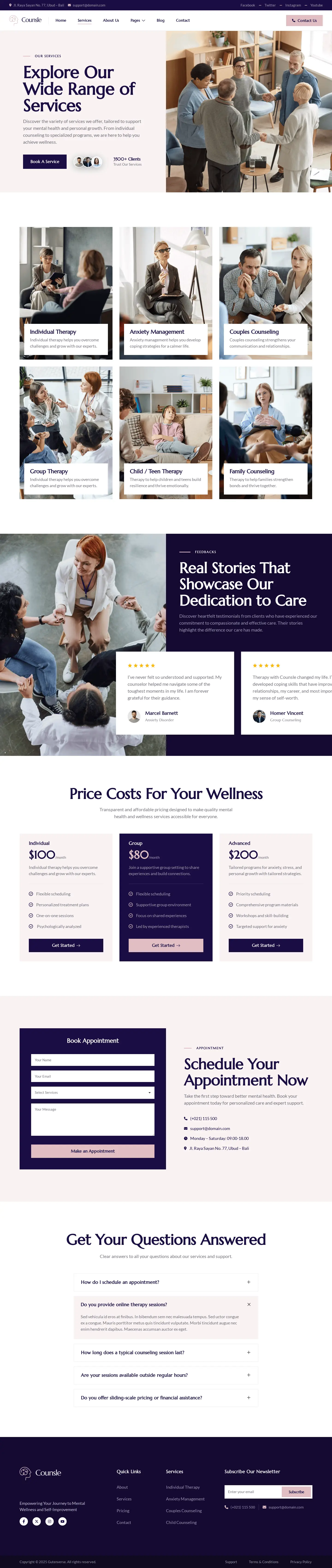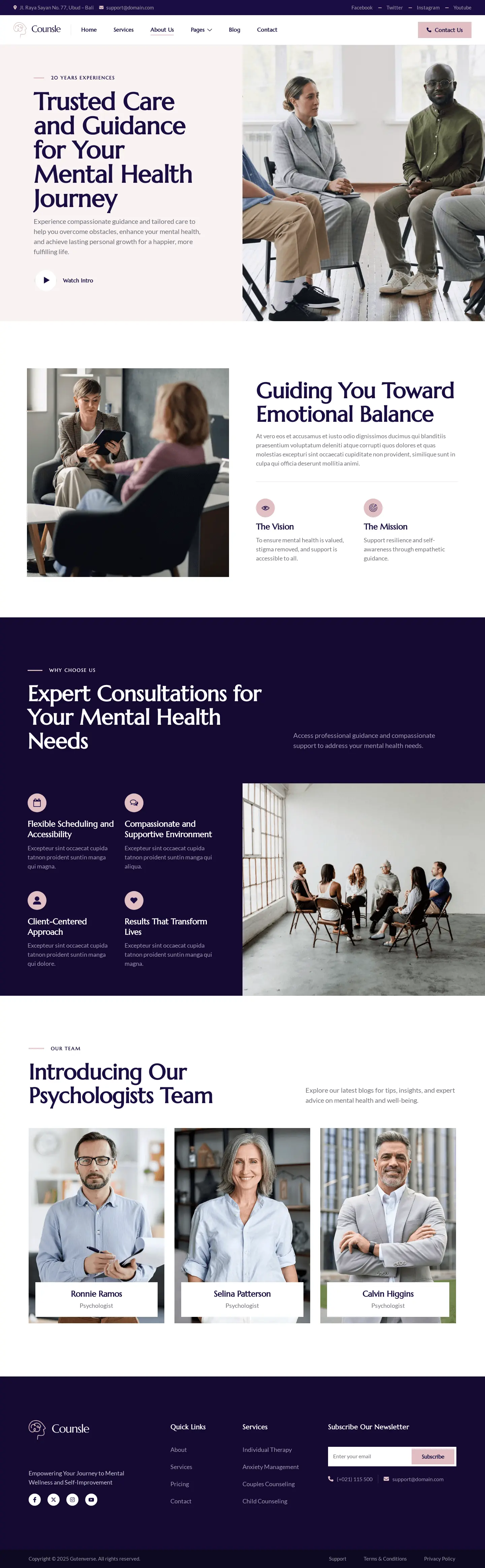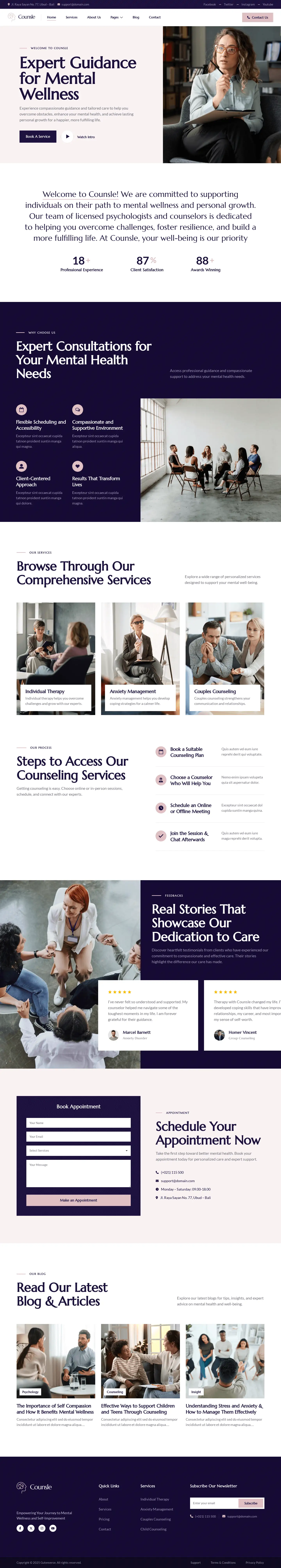 Counsle offers a warm and professional design, perfect for building websites in the field of psychology, therapy, and mental health services. Ideal for counselors, psychologists, therapists, life coaches, wellness clinics, and mental health organizations. Counsle helps you connect with clients, build trust, and provide a safe and supportive online presence.