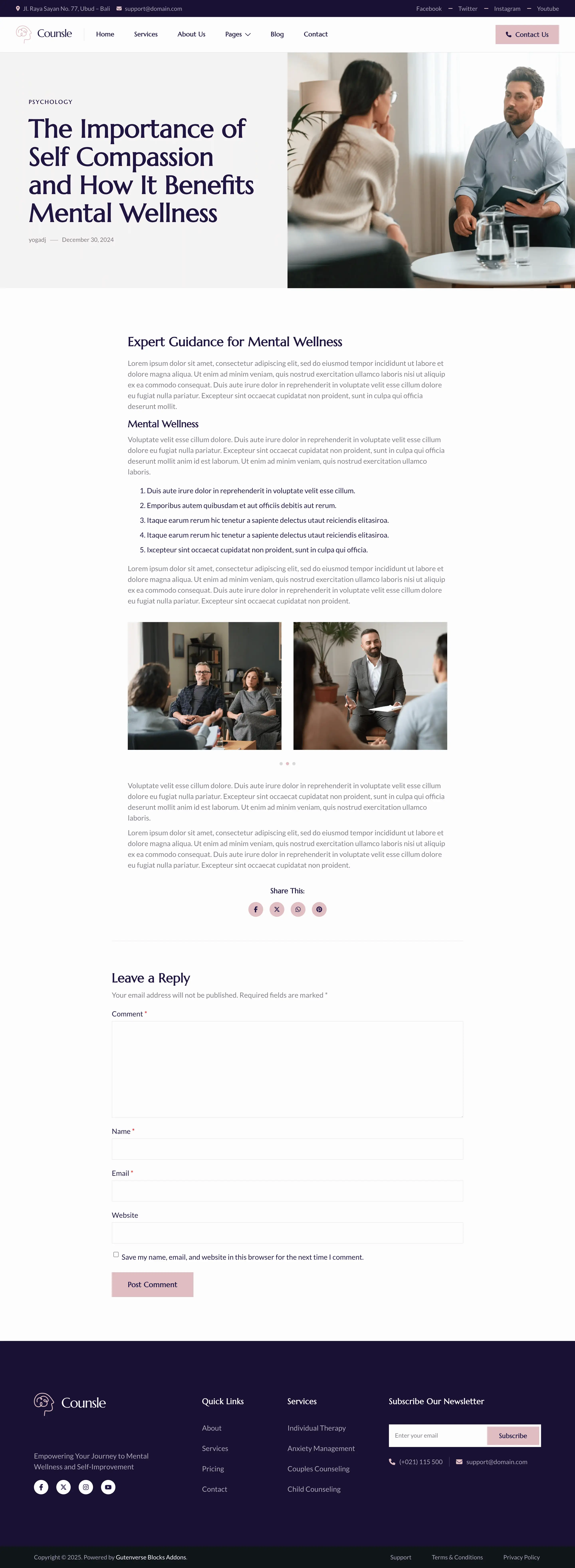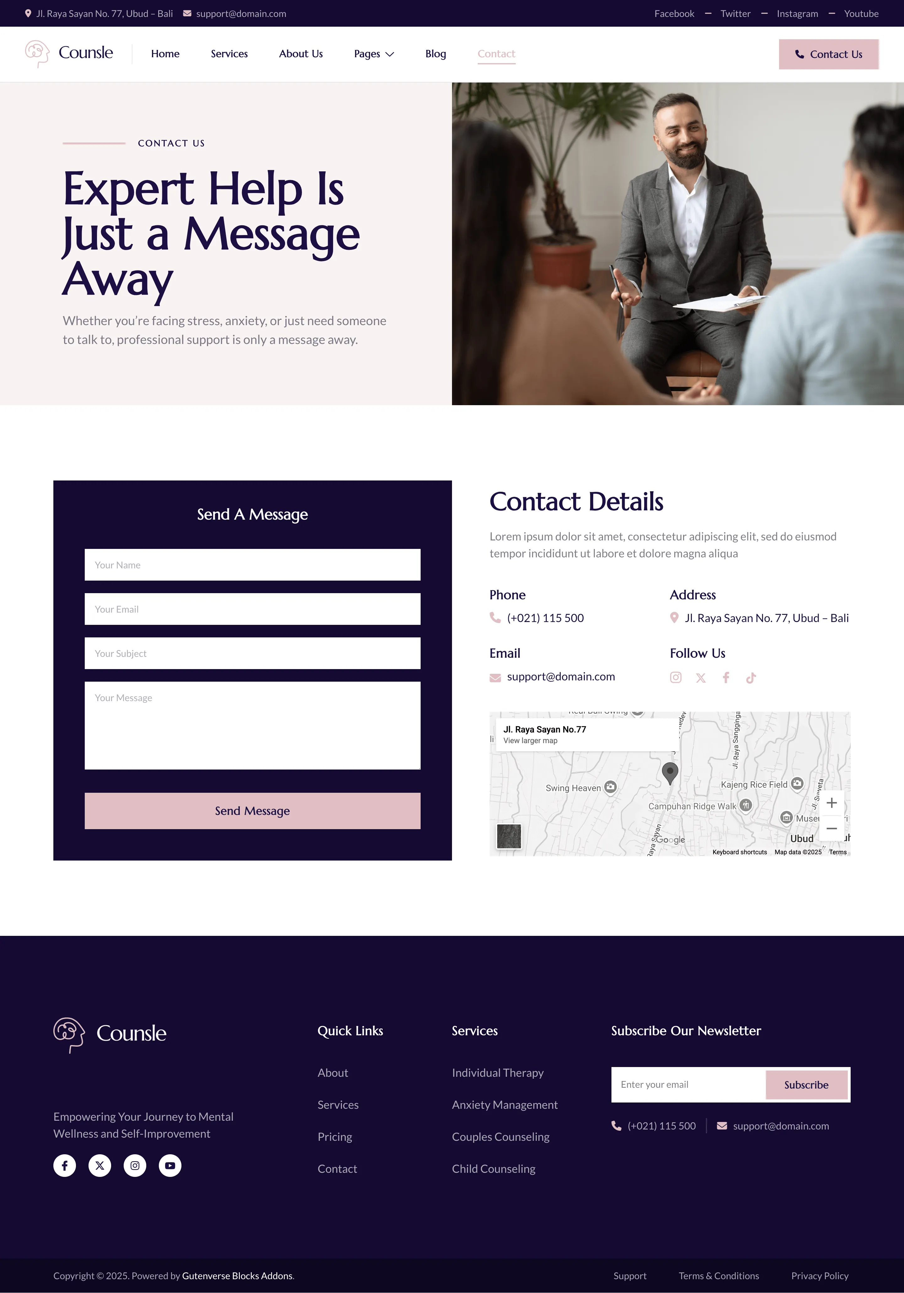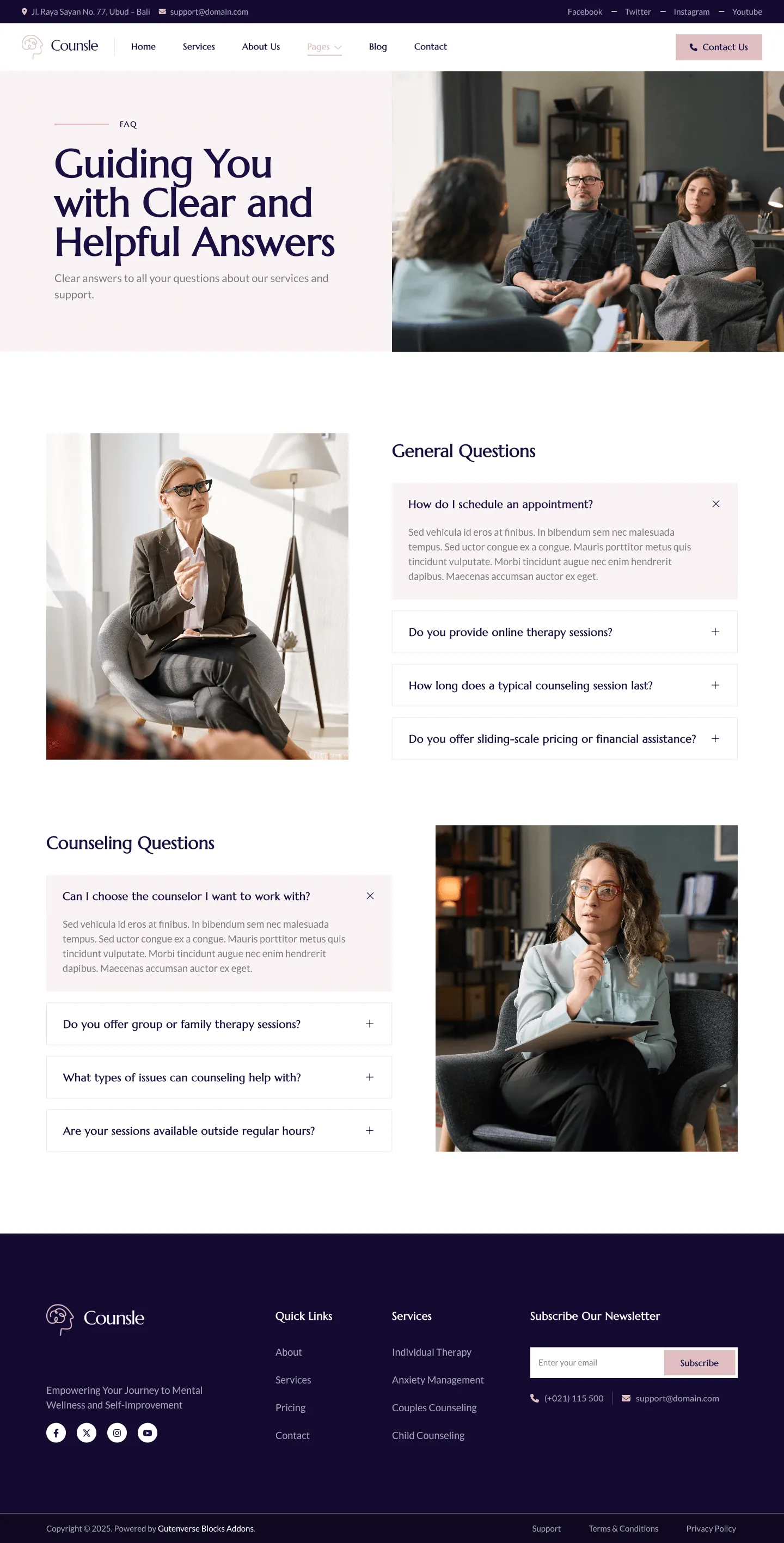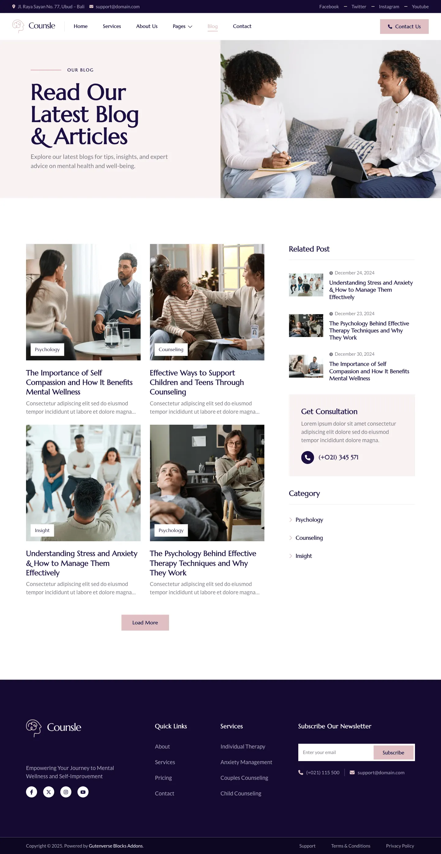 Counsle offers a warm and professional design, perfect for building websites in the field of psychology, therapy, and mental health services. Ideal for counselors, psychologists, therapists, life coaches, wellness clinics, and mental health organizations. Counsle helps you connect with clients, build trust, and provide a safe and supportive online presence.