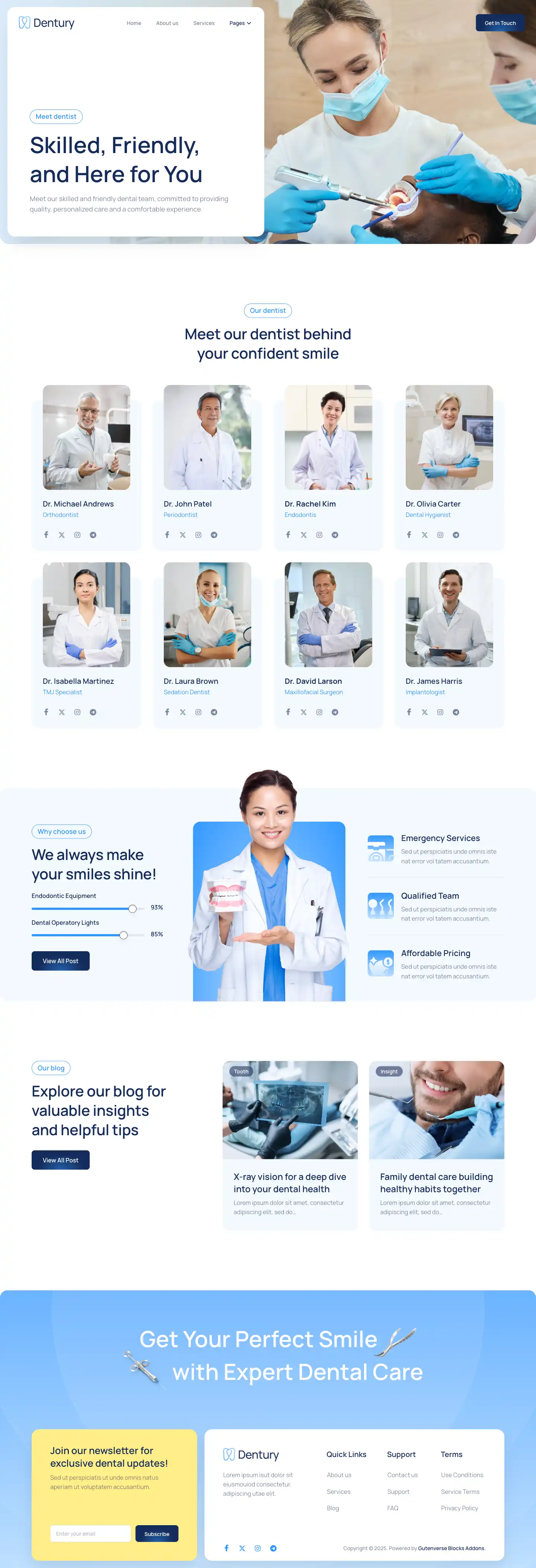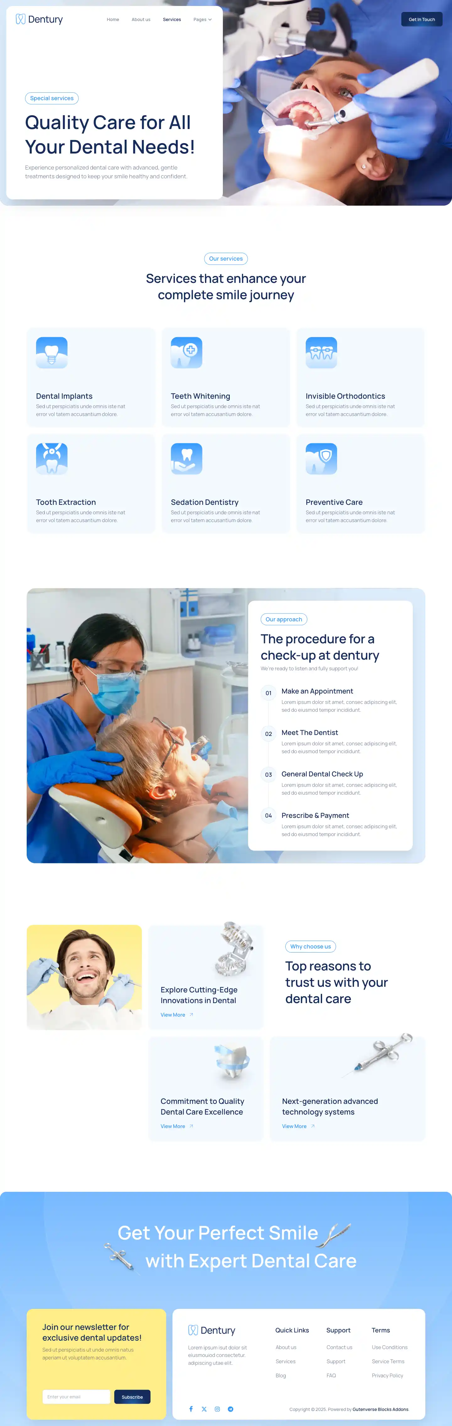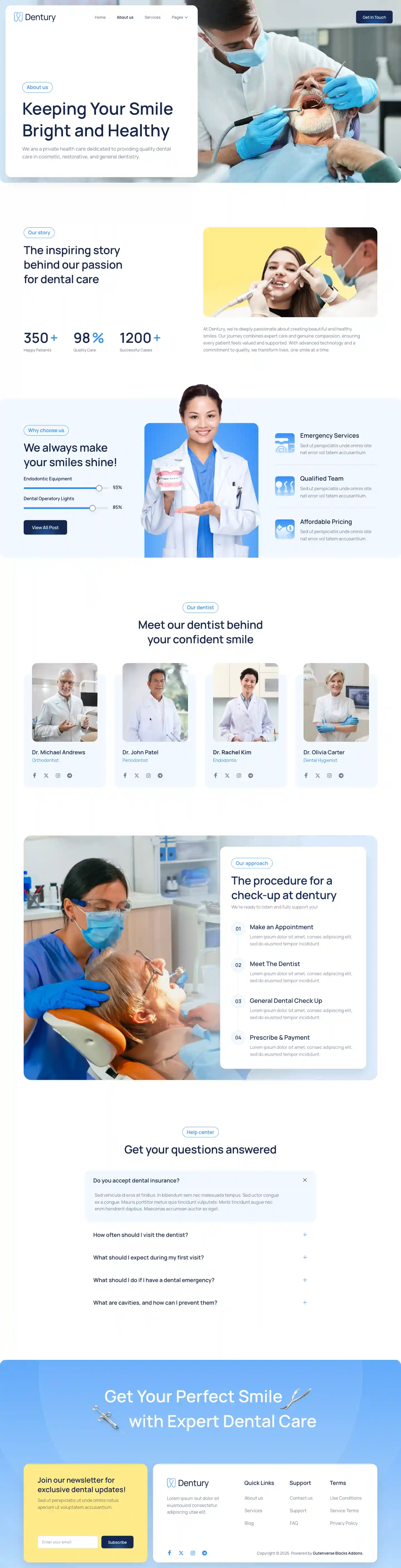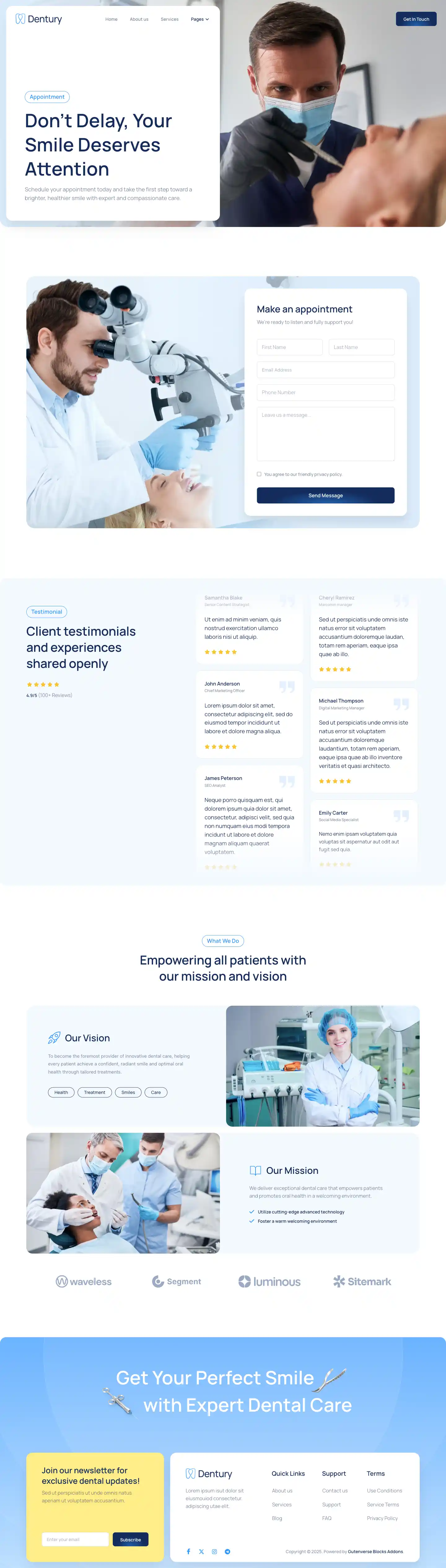 Dentury features a clean and welcoming design, perfect for building professional websites for dentists and dental clinics. Ideal for general dentists, orthodontists, cosmetic dentistry practices, and oral health specialists. Dentury helps you showcase your services, highlight your expertise, and create a trustworthy online presence that makes patients feel at ease.