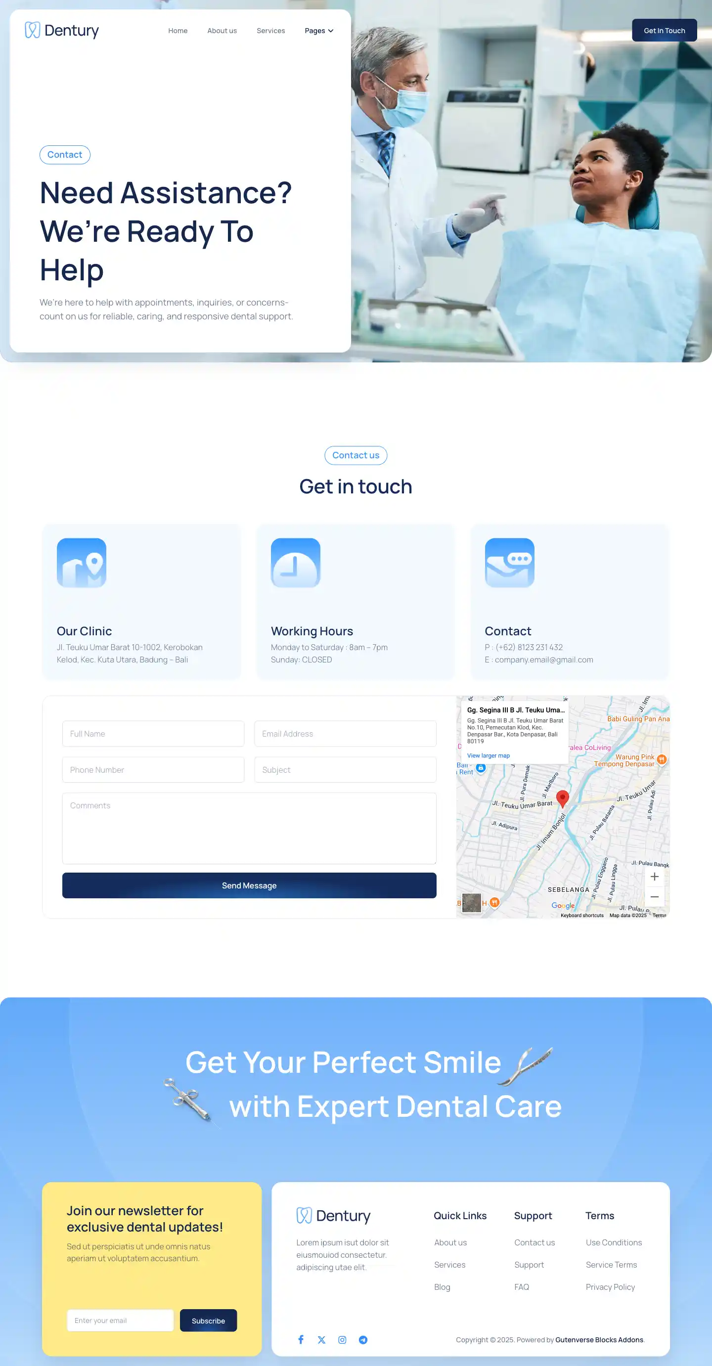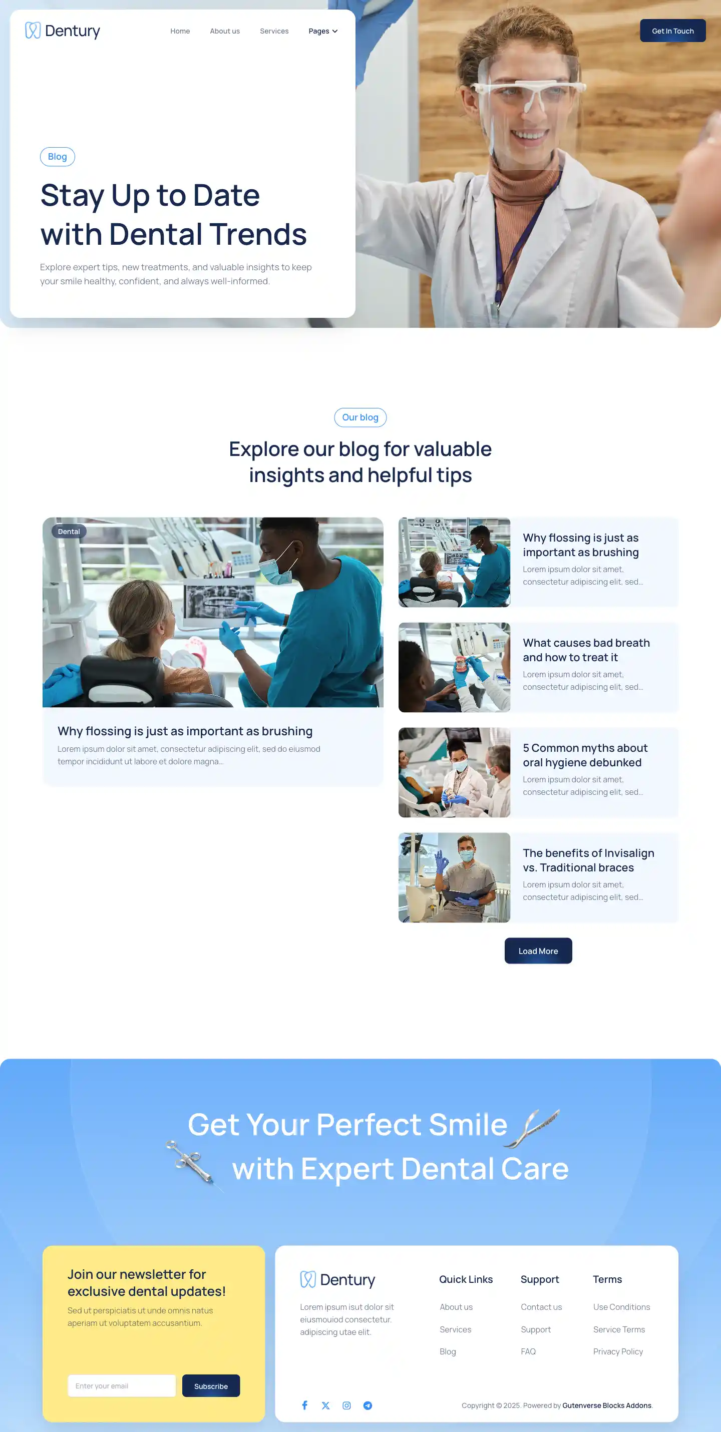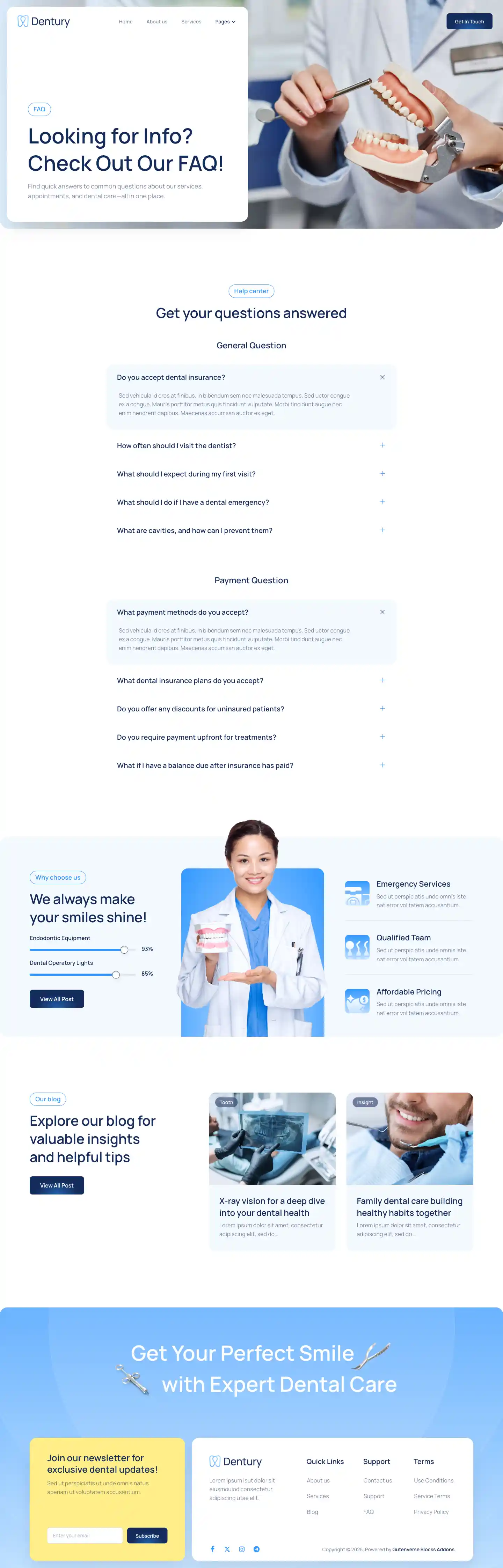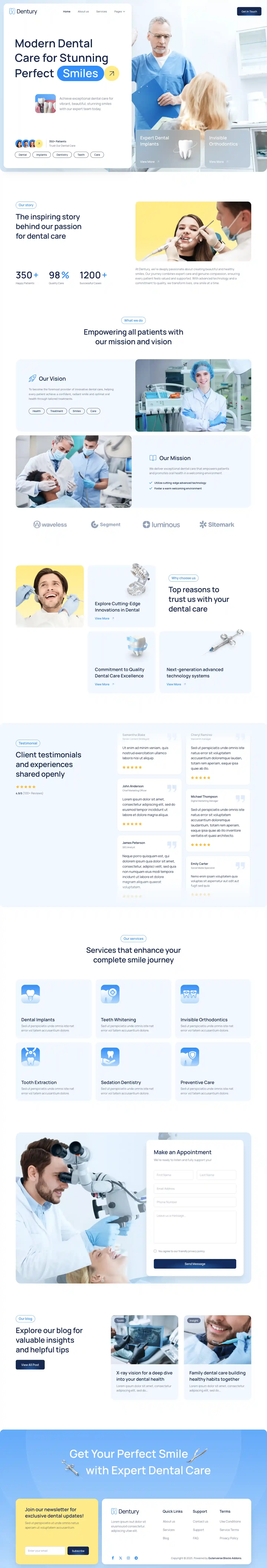 Dentury features a clean and welcoming design, perfect for building professional websites for dentists and dental clinics. Ideal for general dentists, orthodontists, cosmetic dentistry practices, and oral health specialists. Dentury helps you showcase your services, highlight your expertise, and create a trustworthy online presence that makes patients feel at ease.