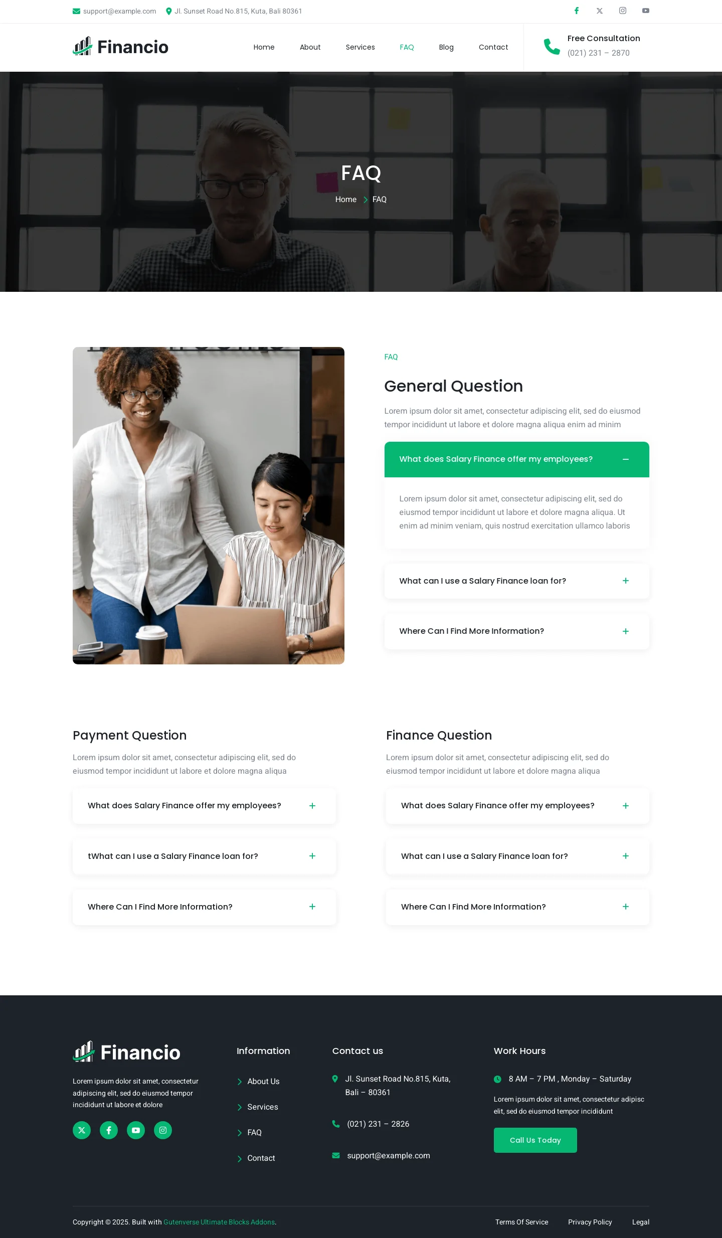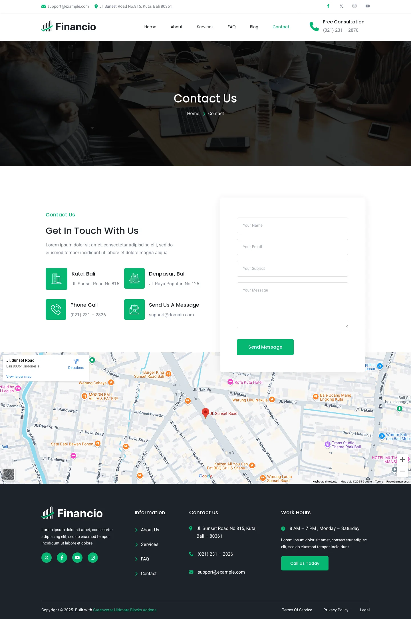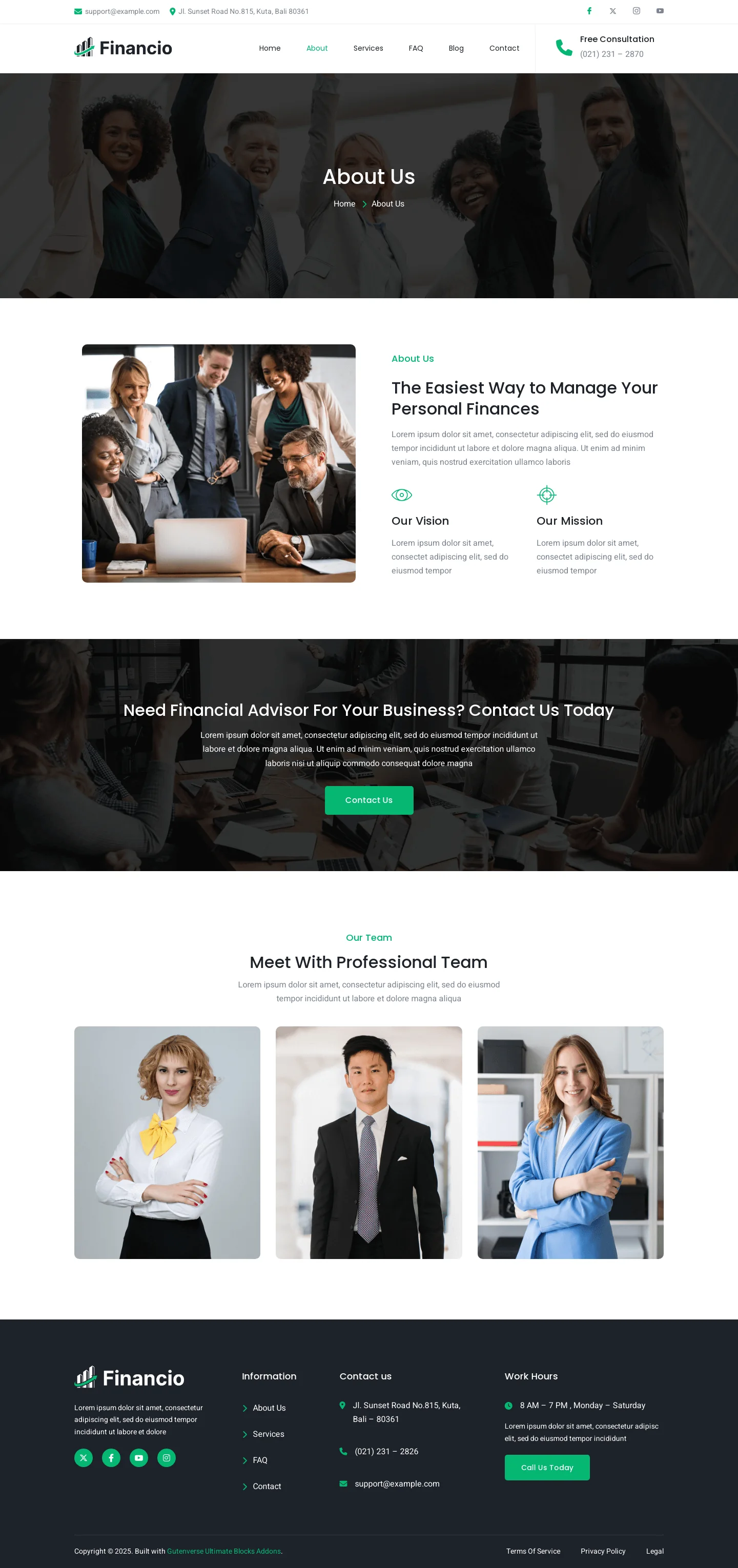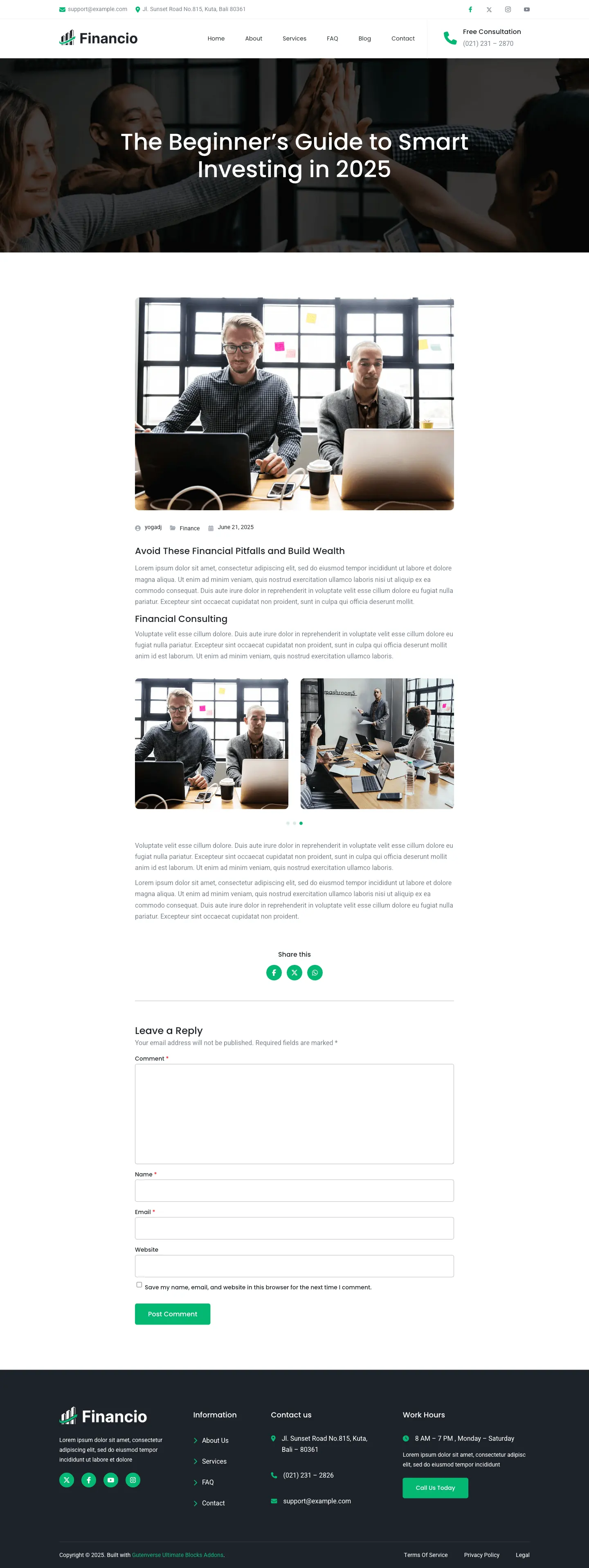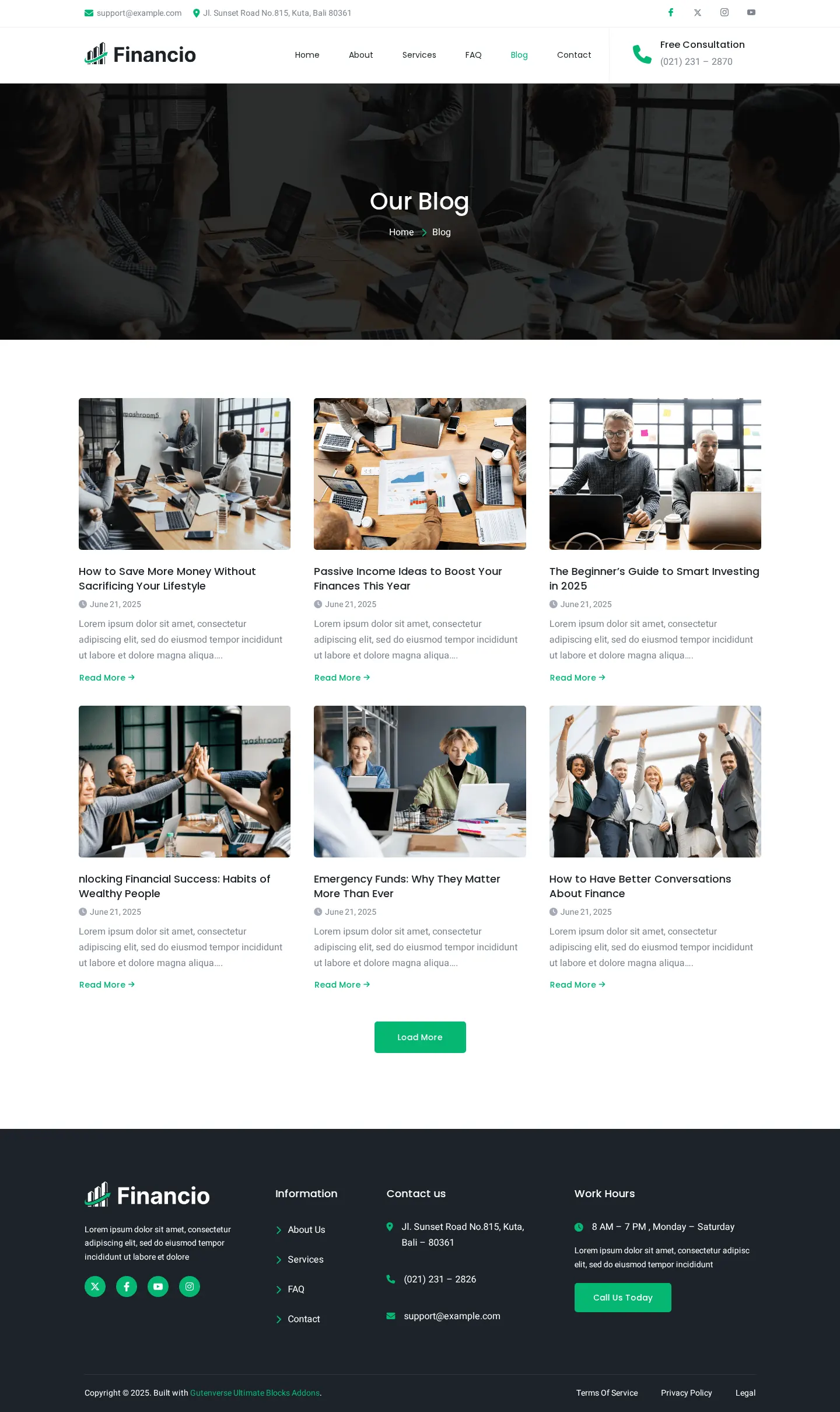Financio offers a sleek and professional design, perfect for building websites for finance and investment related services. Ideal for financial advisors, investment firms, accountants, tax consultants, and wealth management companies. Financio helps you present your expertise, build trust with clients, and showcase your financial solutions with clarity and confidence.