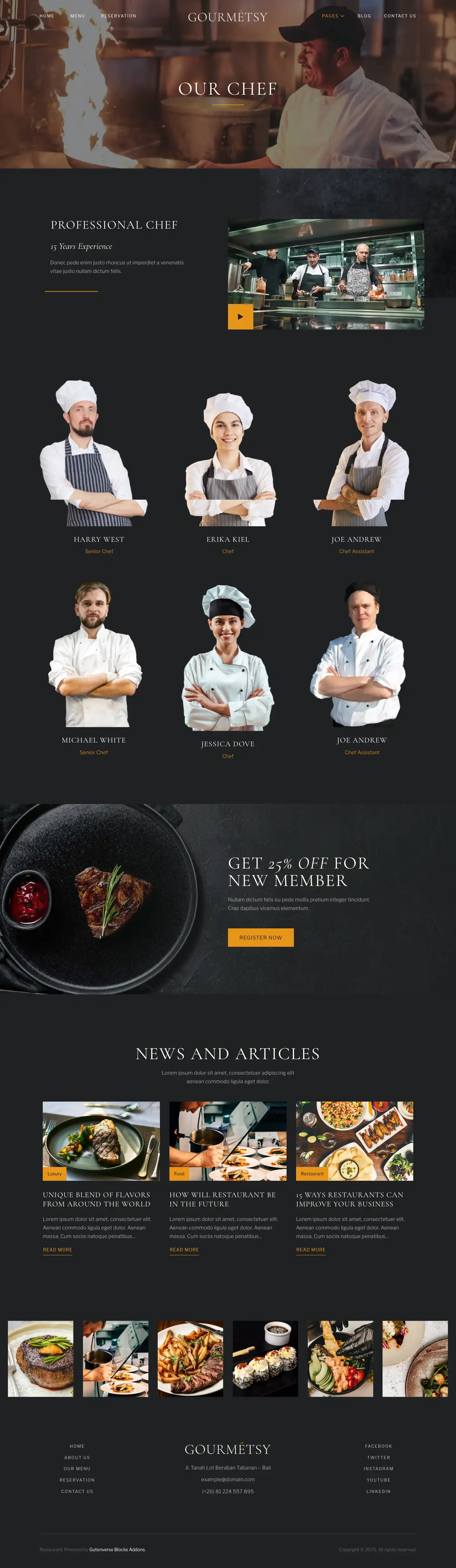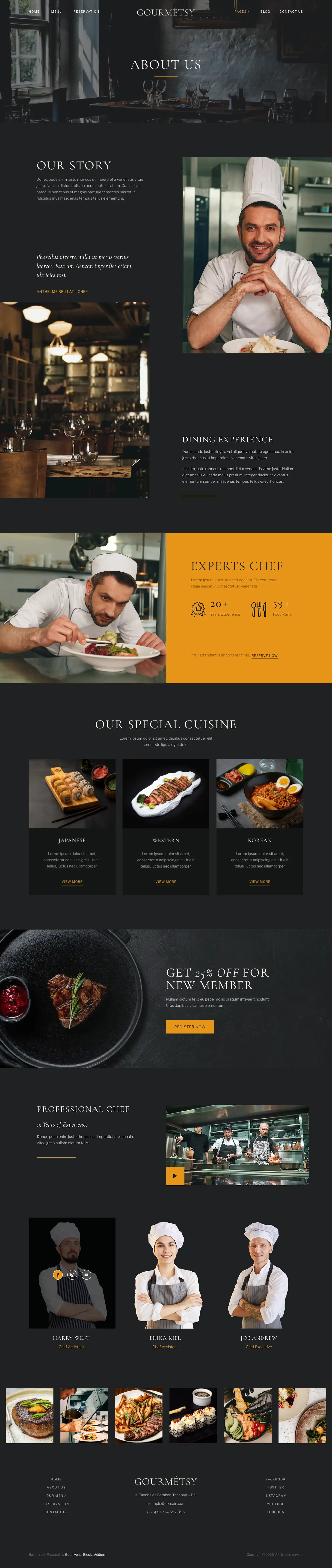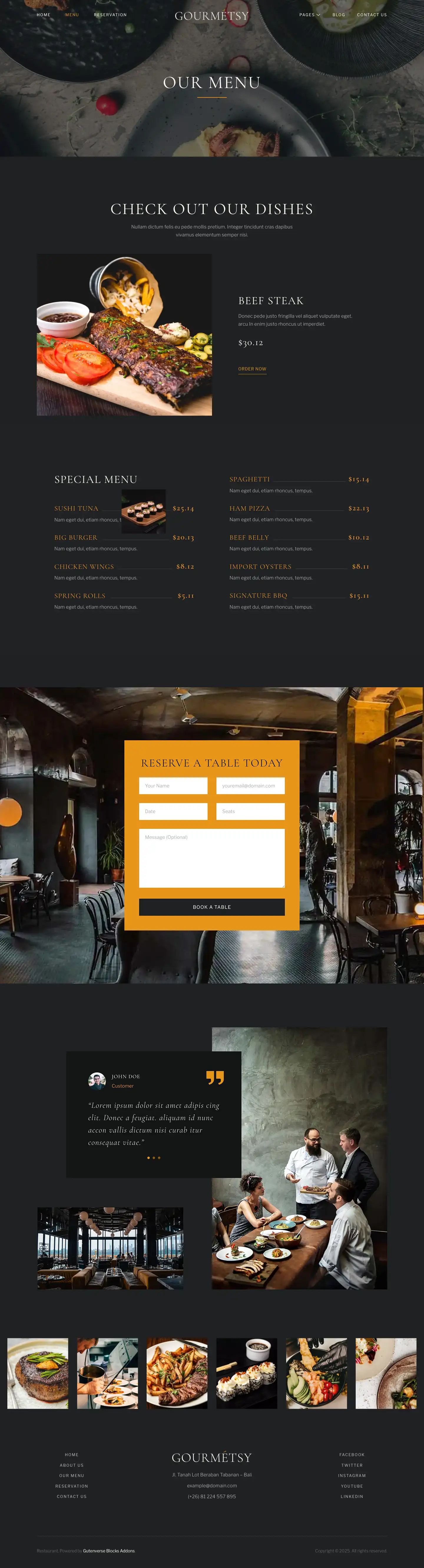 Gourmetsy delivers a sophisticated and elegant design, perfect for creating refined websites for luxury dining establishments, modern restaurants, cafes, bars, and other culinary ventures. Ideal for showcasing exquisite menus, highlighting chef expertise, and attracting discerning guests, Gourmetsy helps you present your brand with taste and style while making it effortless for customers to discover and book your dining experiences.