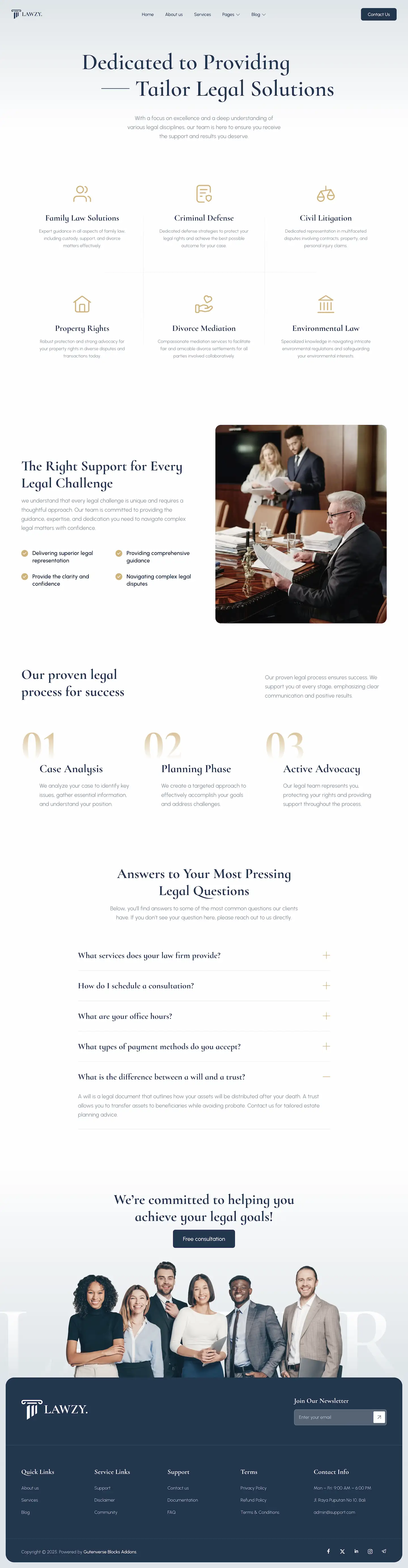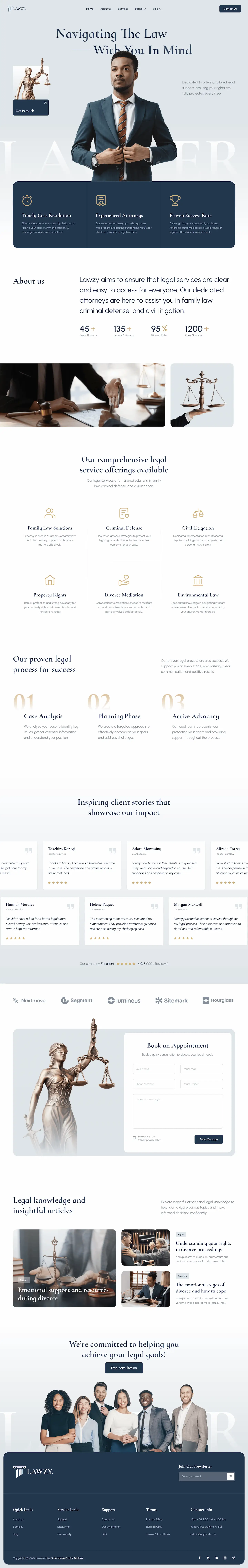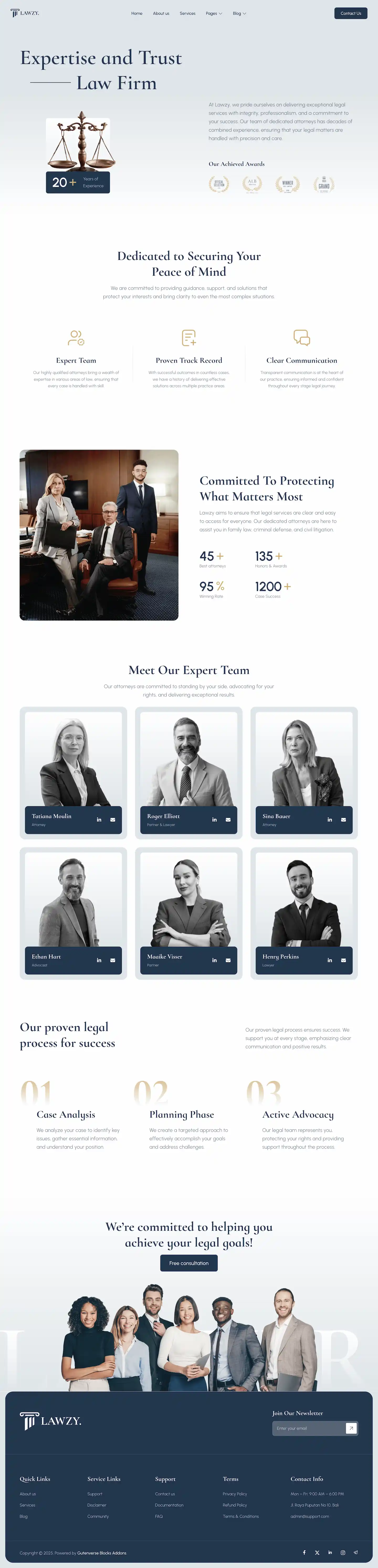 Lawzy offers a sleek and professional design perfect for creating websites for Law Firms, Legal Consultants, Attorneys, Advocates, Notaries, and other legal services. With its modern layout, Lawzy helps you build a credible online presence that inspires trust and reflects your legal expertise.