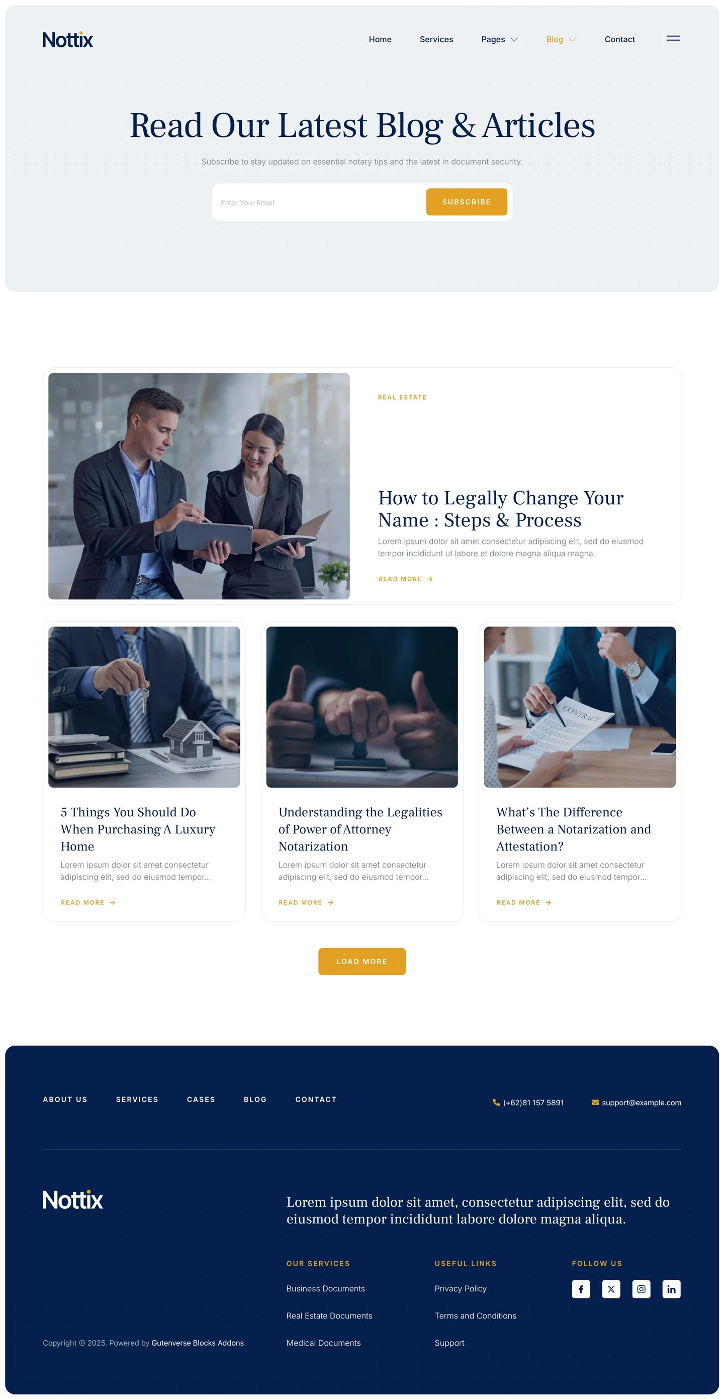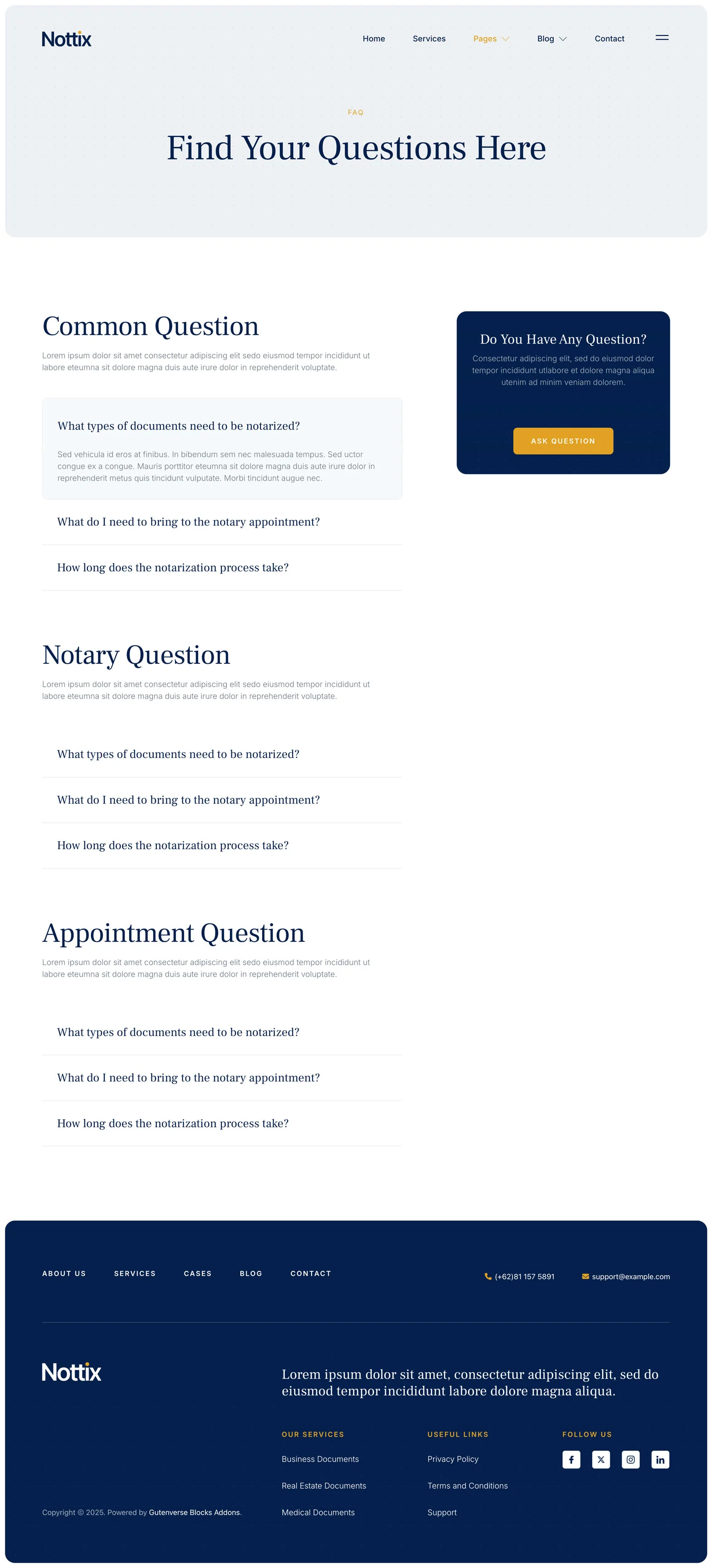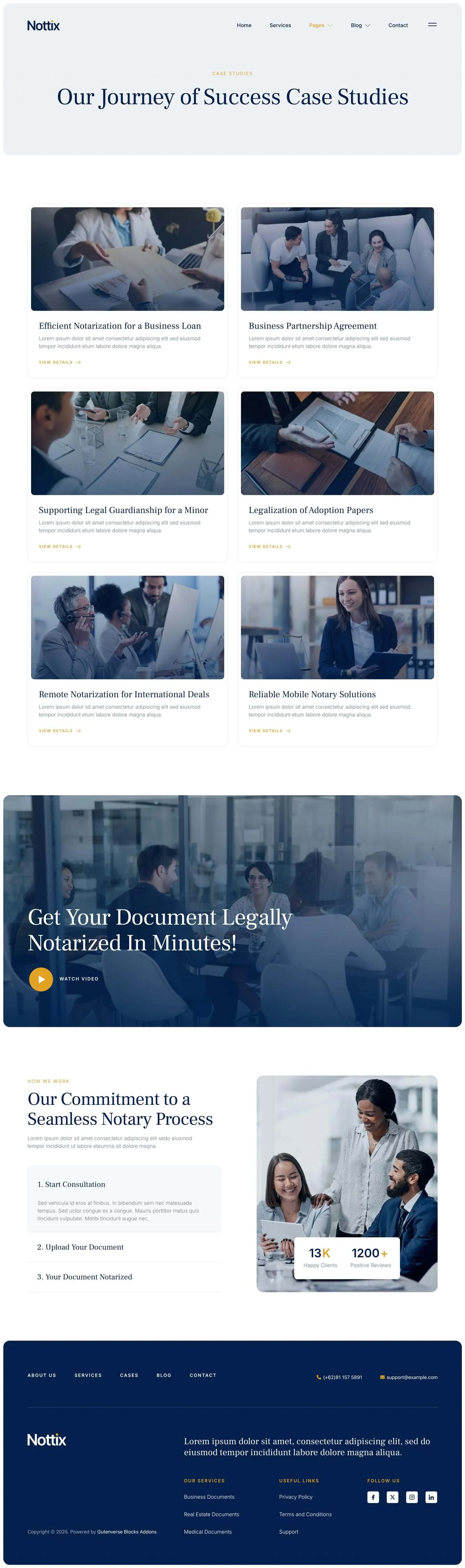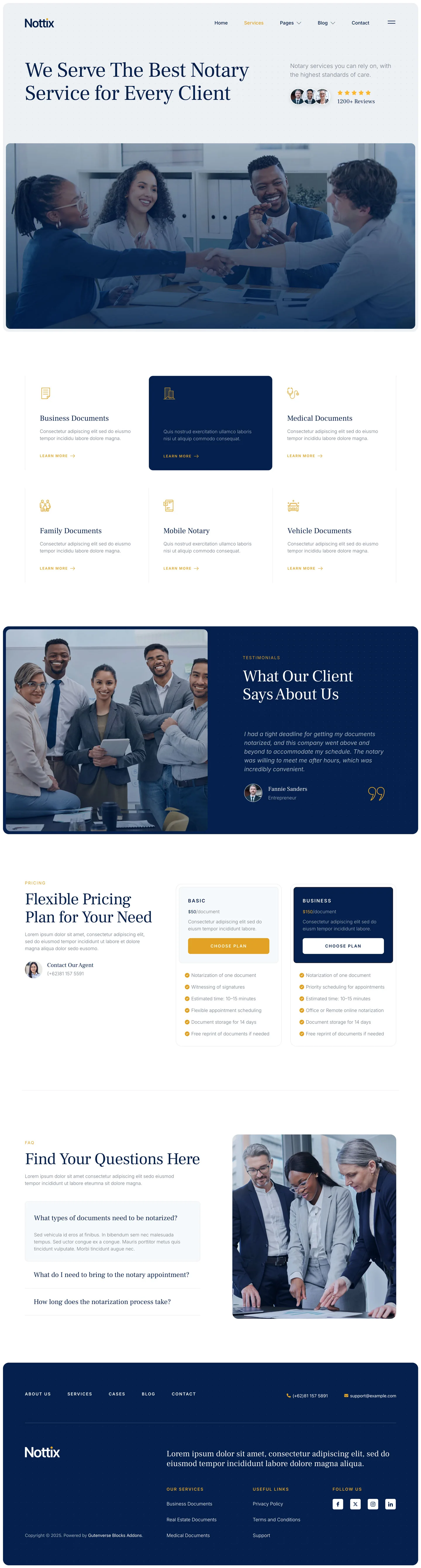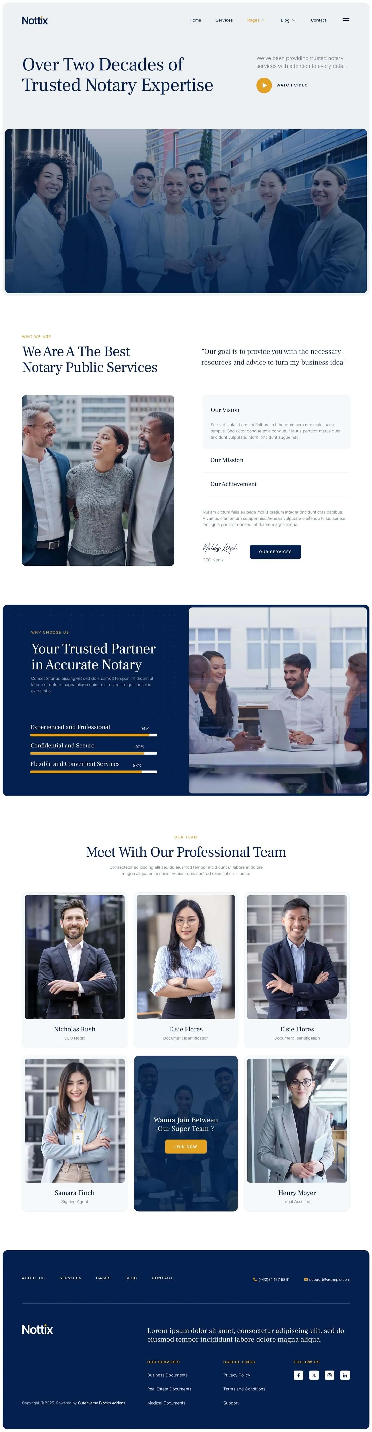 Nottix delivers a clean and professional design, perfect for building trustworthy websites for notary and legal documentation services. Ideal for notaries public, legal advisors, signing agents, law offices, and document certification providers. Nottix helps you present your credentials clearly, build client confidence, and make it easy for clients to access your services with ease.
