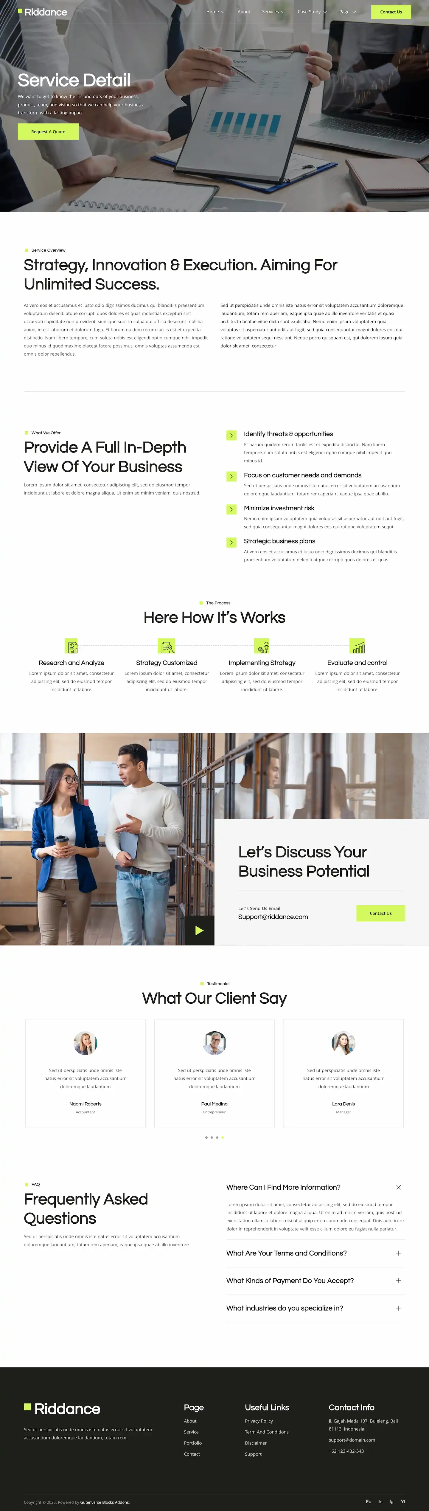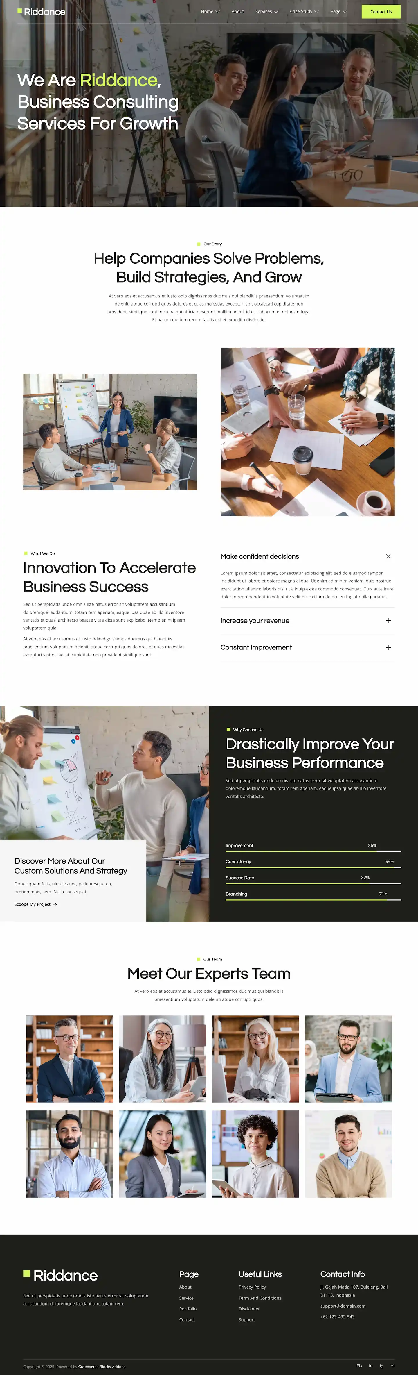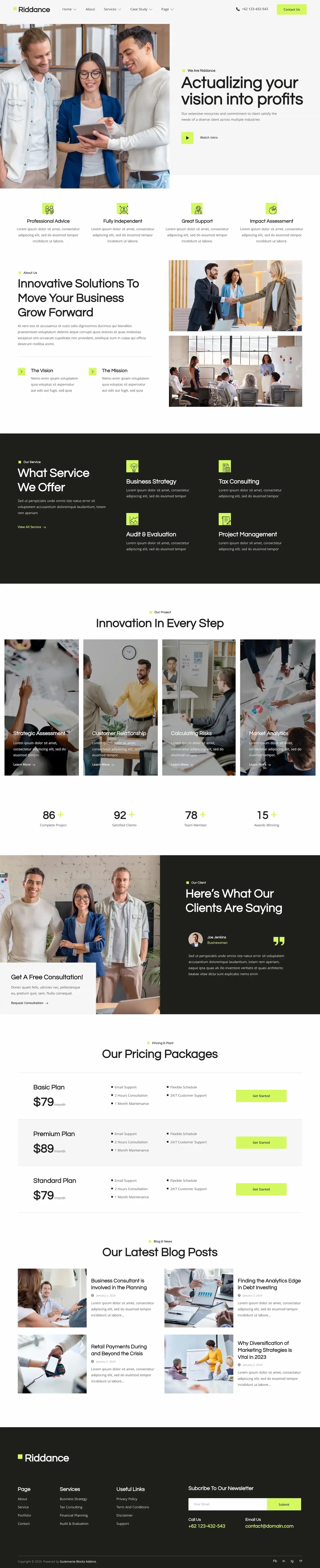Riddance offers a clean and modern design, perfect for building professional websites for consulting and business services. Ideal for consultants, financial advisors, corporate firms, accountants, insurance brokers, and digital agencies. Riddance helps you showcase your expertise, build trust, and grow your client base with confidence.