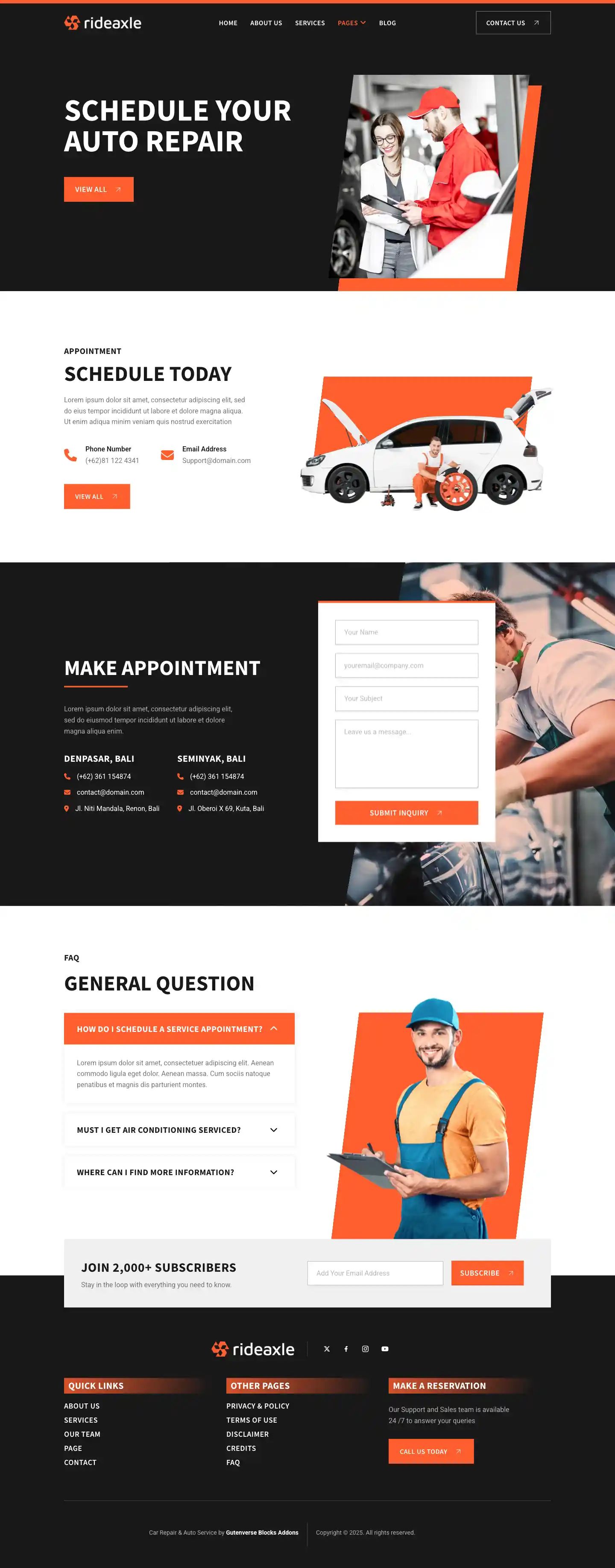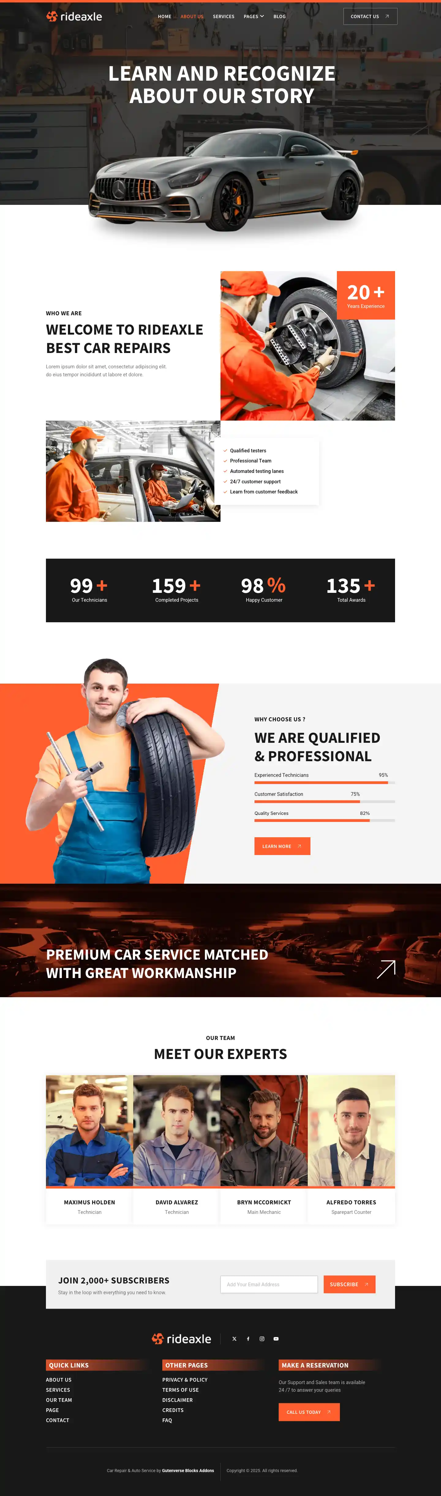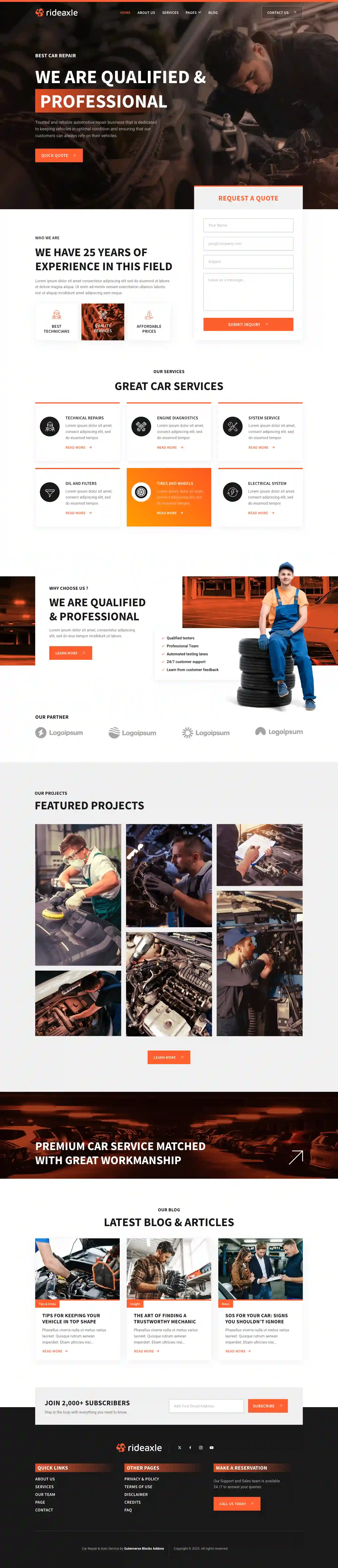 Rideaxle delivers a bold and professional design, perfect for creating websites for automotive repair and maintenance services. Ideal for auto repair shops, car service centers, mechanics, tire shops, and vehicle inspection services. Rideaxle helps you showcase your expertise, promote your services, and build trust with customers looking for reliable automotive care.