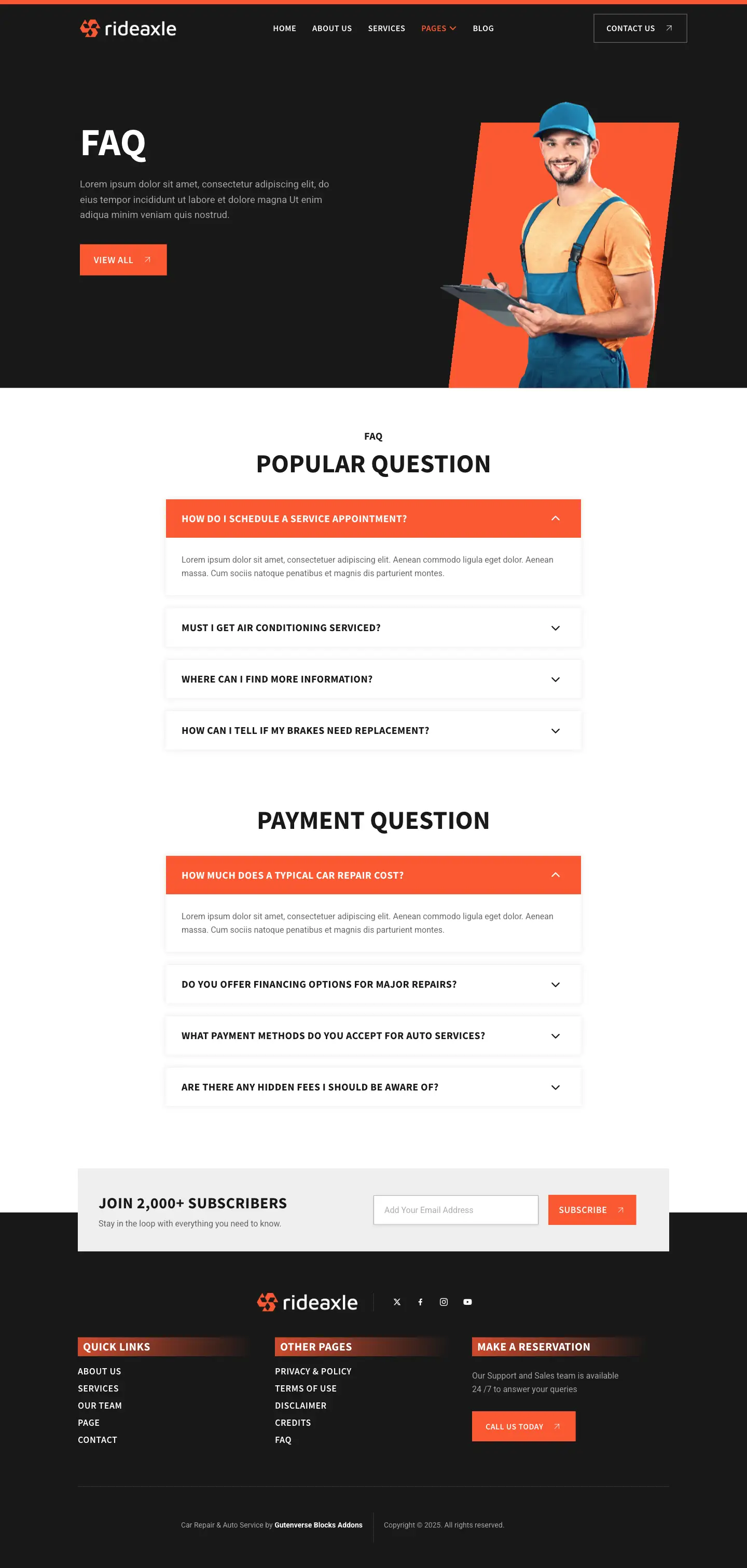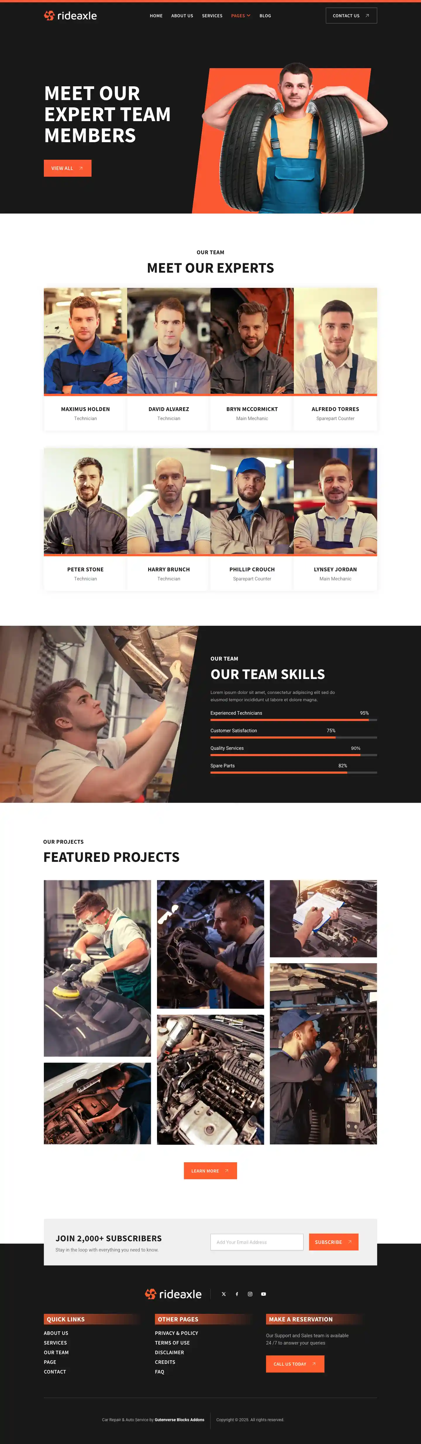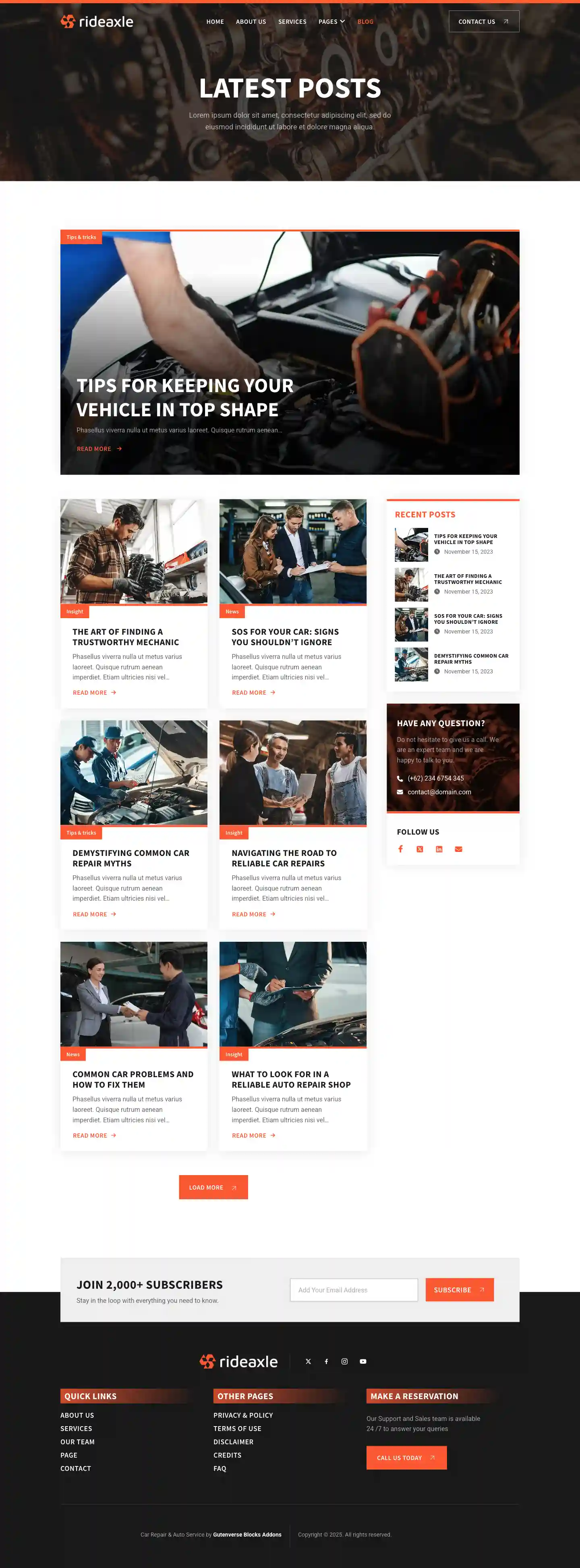 Rideaxle delivers a bold and professional design, perfect for creating websites for automotive repair and maintenance services. Ideal for auto repair shops, car service centers, mechanics, tire shops, and vehicle inspection services. Rideaxle helps you showcase your expertise, promote your services, and build trust with customers looking for reliable automotive care.