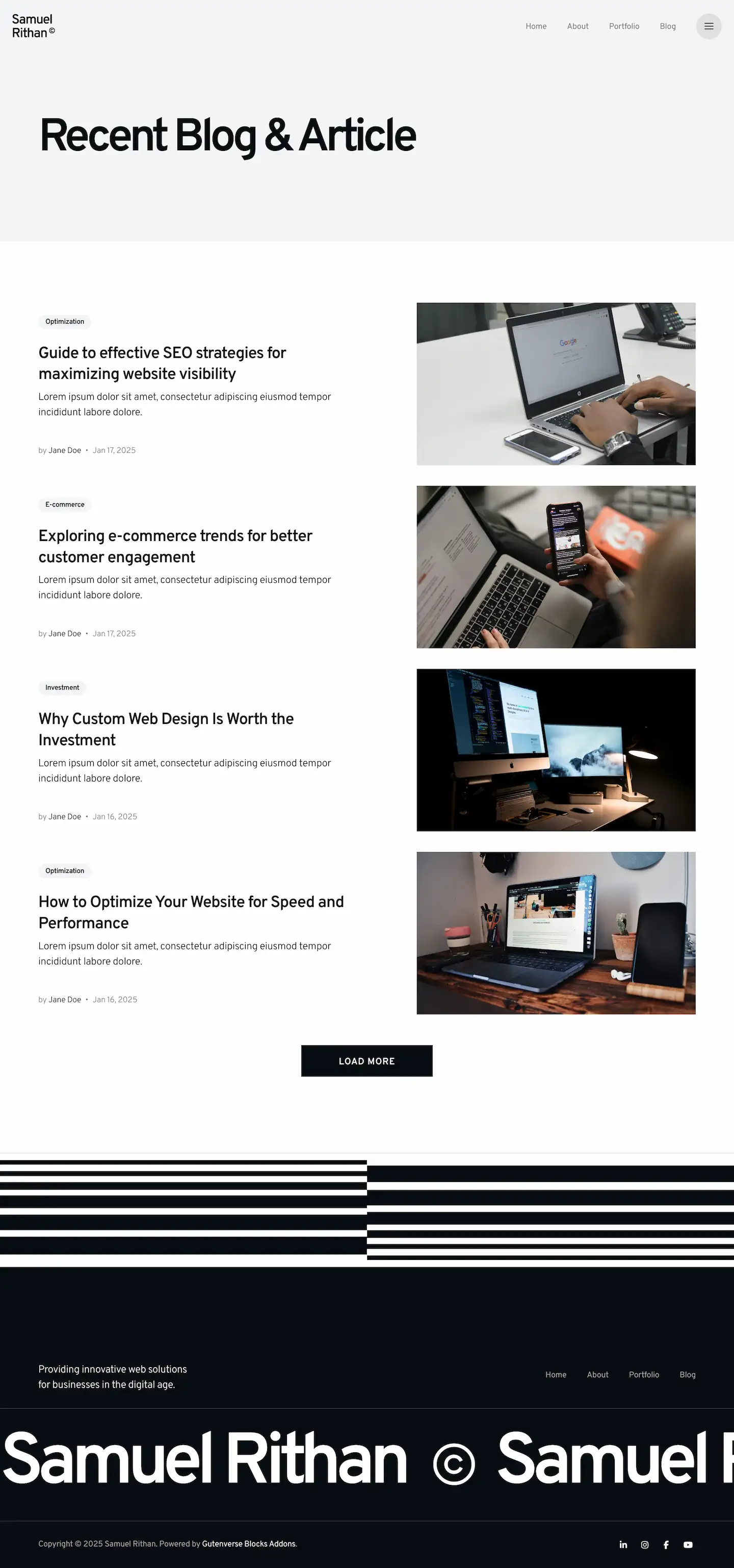 Samuel Rithan is a clean and modern personal portfolio, ideal for freelance web designers and creative professionals. Whether you're showcasing your portfolio, sharing your story, or attracting new clients, Samuel Rithan is the perfect choice for building a strong personal brand and professional online presence.