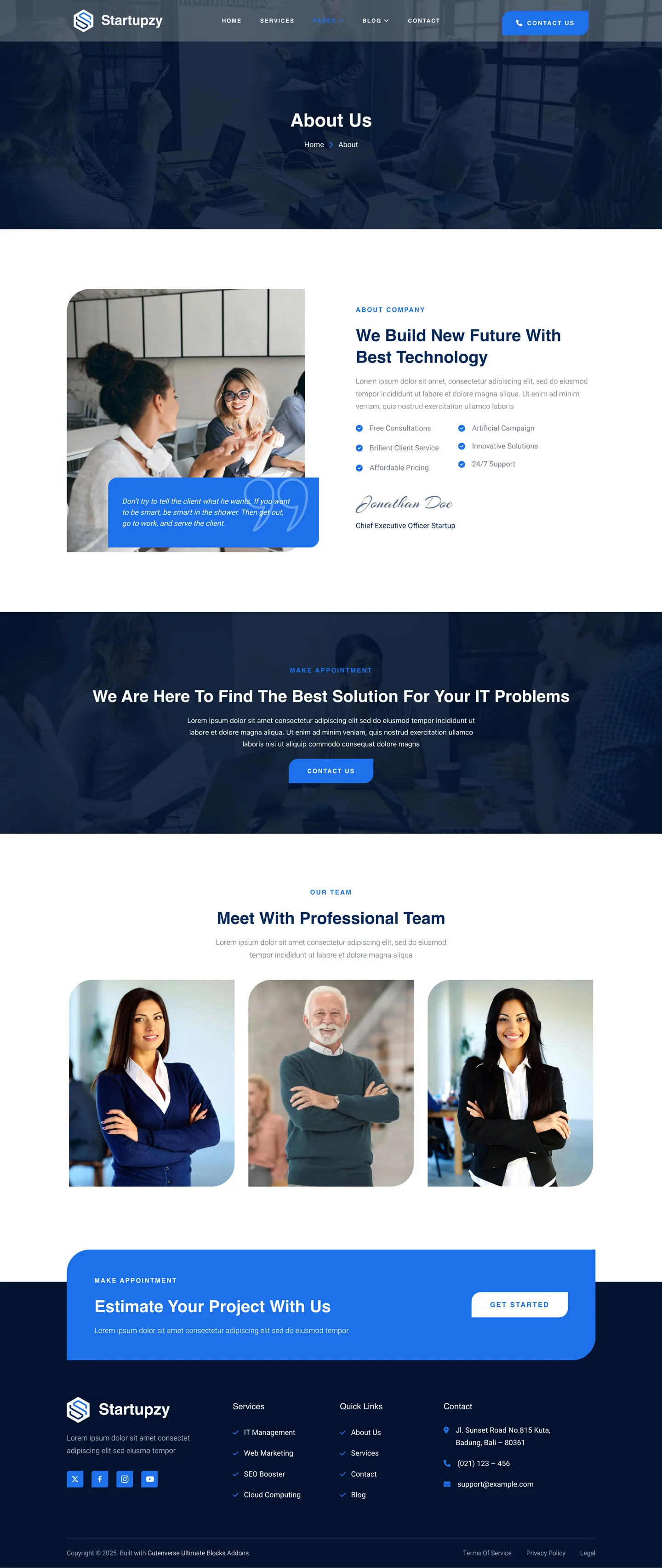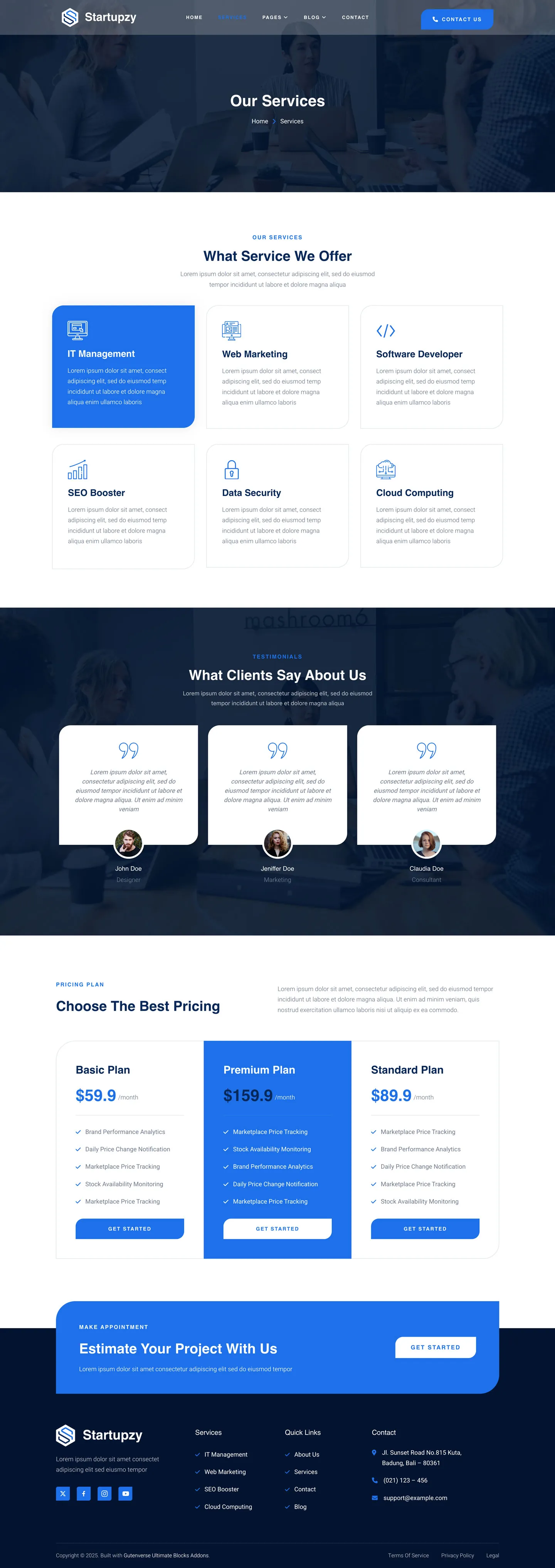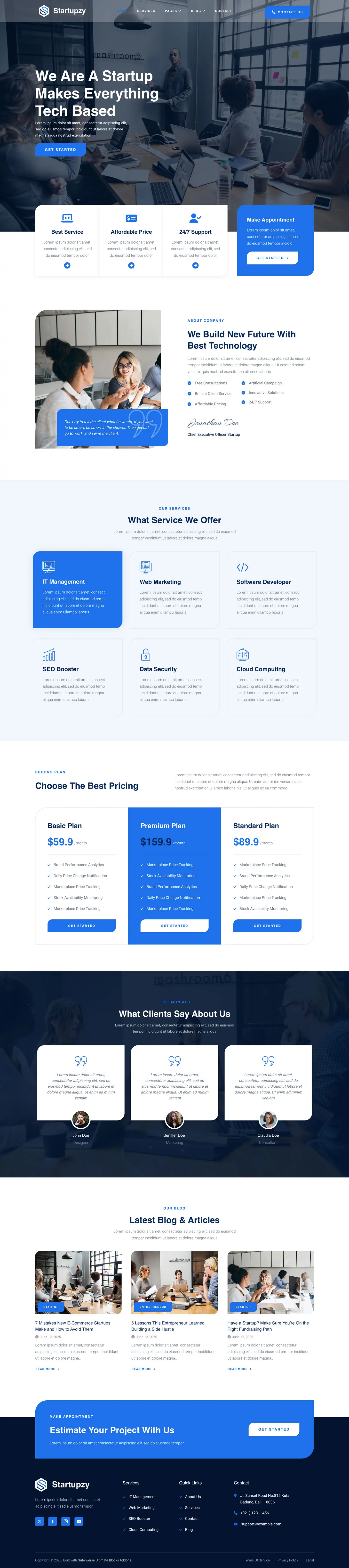 Startupzy features a bold and modern design, perfect for building websites for tech startups and innovative digital ventures. Ideal for SaaS companies, app developers, tech incubators, product teams, and early stage startups. Startupzy helps you showcase your product, share your vision, and build credibility with investors, partners, and users alike.