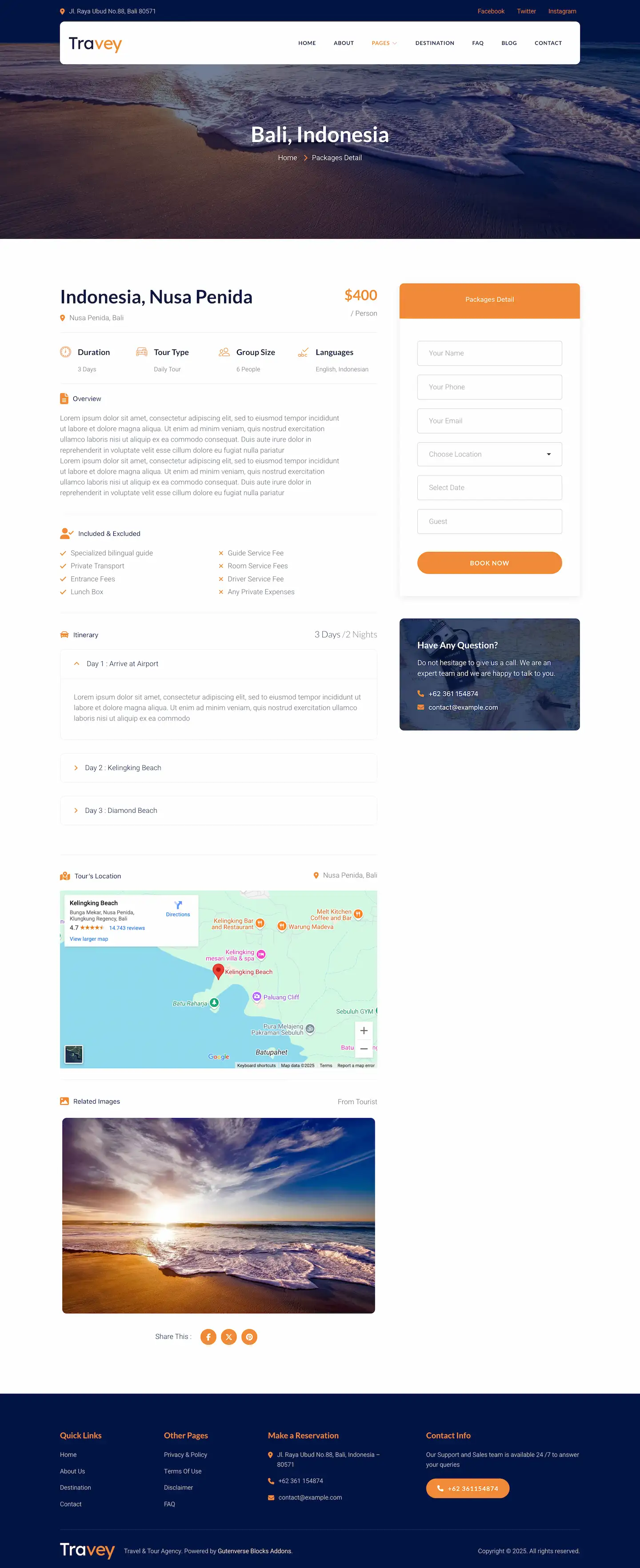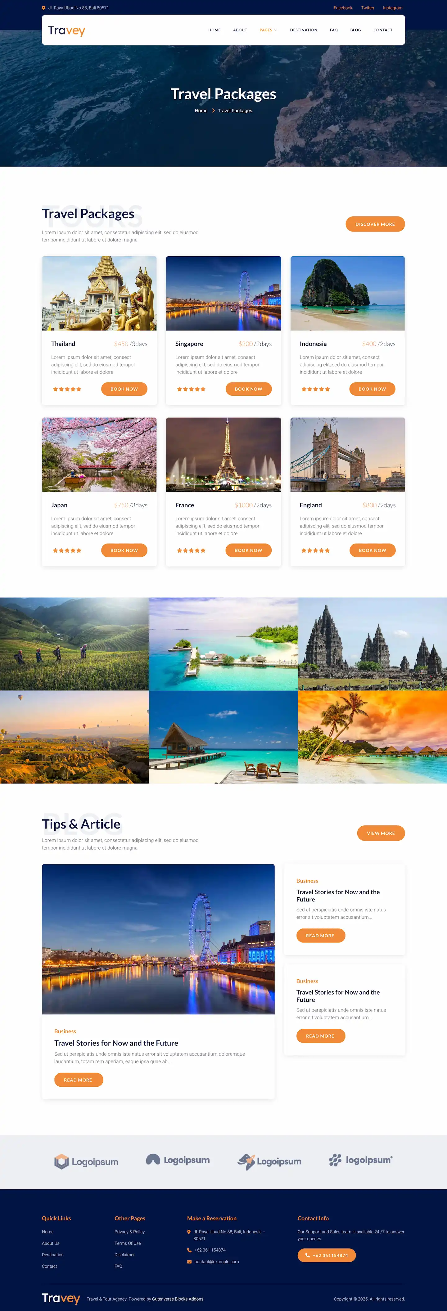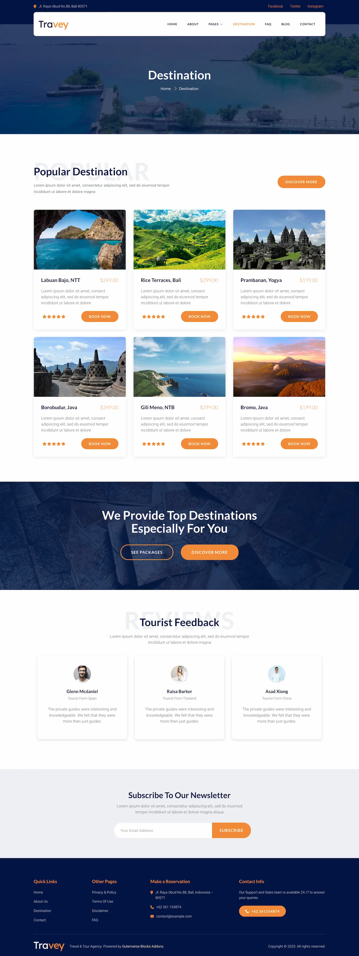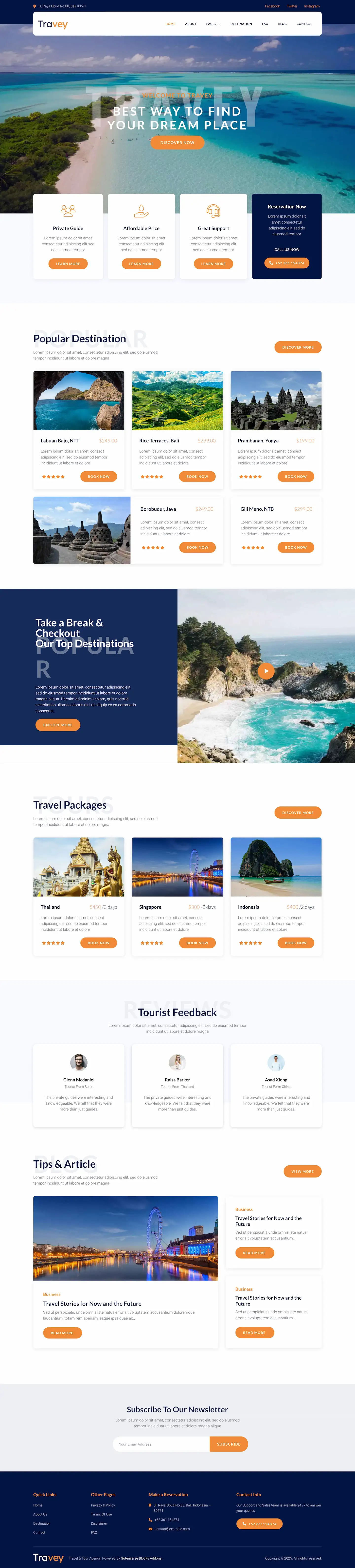 Travey features a simple, responsive, and elegant design perfect for travel agencies, tour operators, adventure guides, and tourism related businesses. Whether you're showcasing destinations, promoting holiday packages, or offering curated trips, Travey helps you create an inspiring online presence that excites and engages travelers.