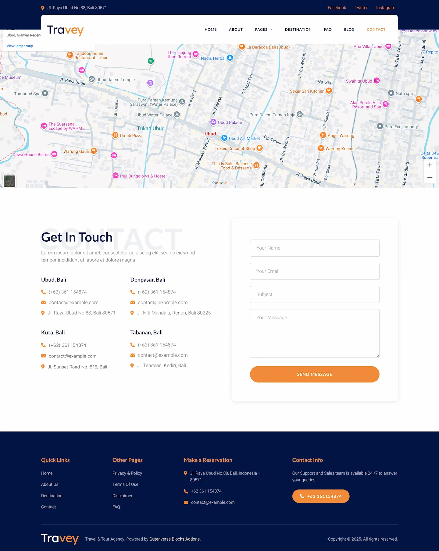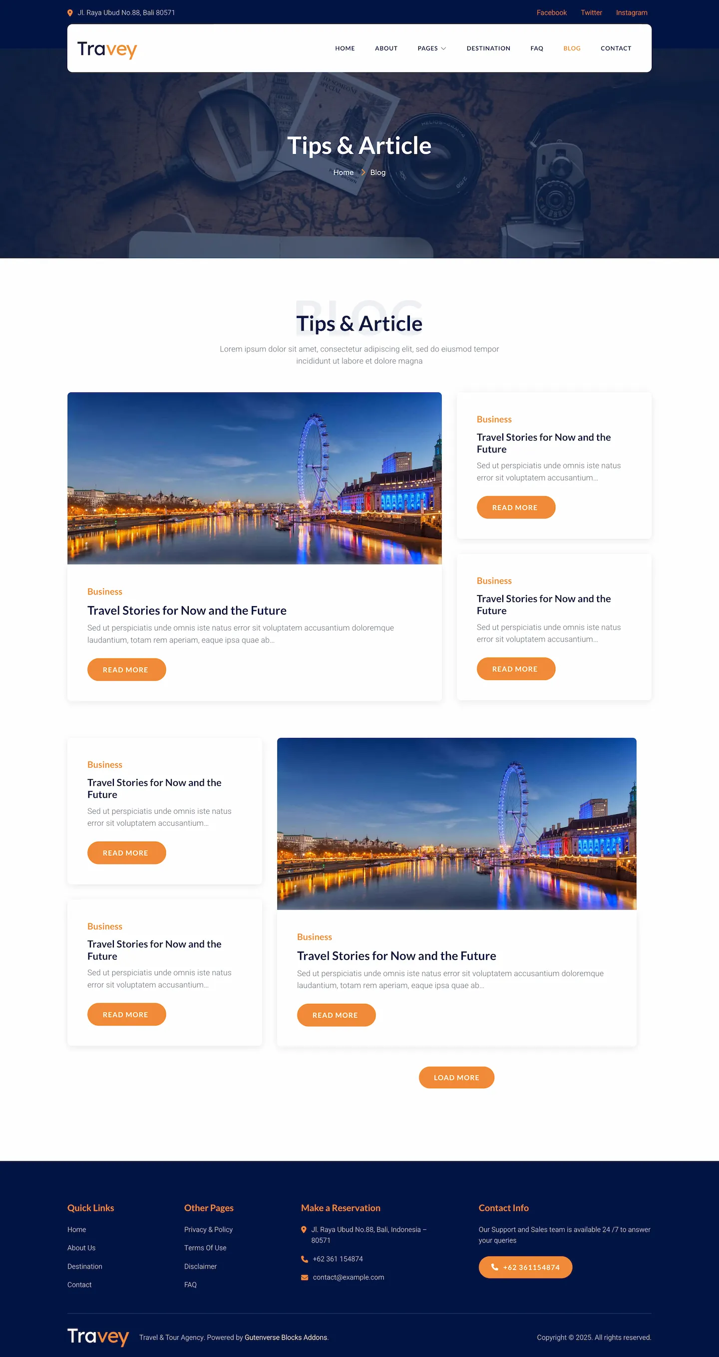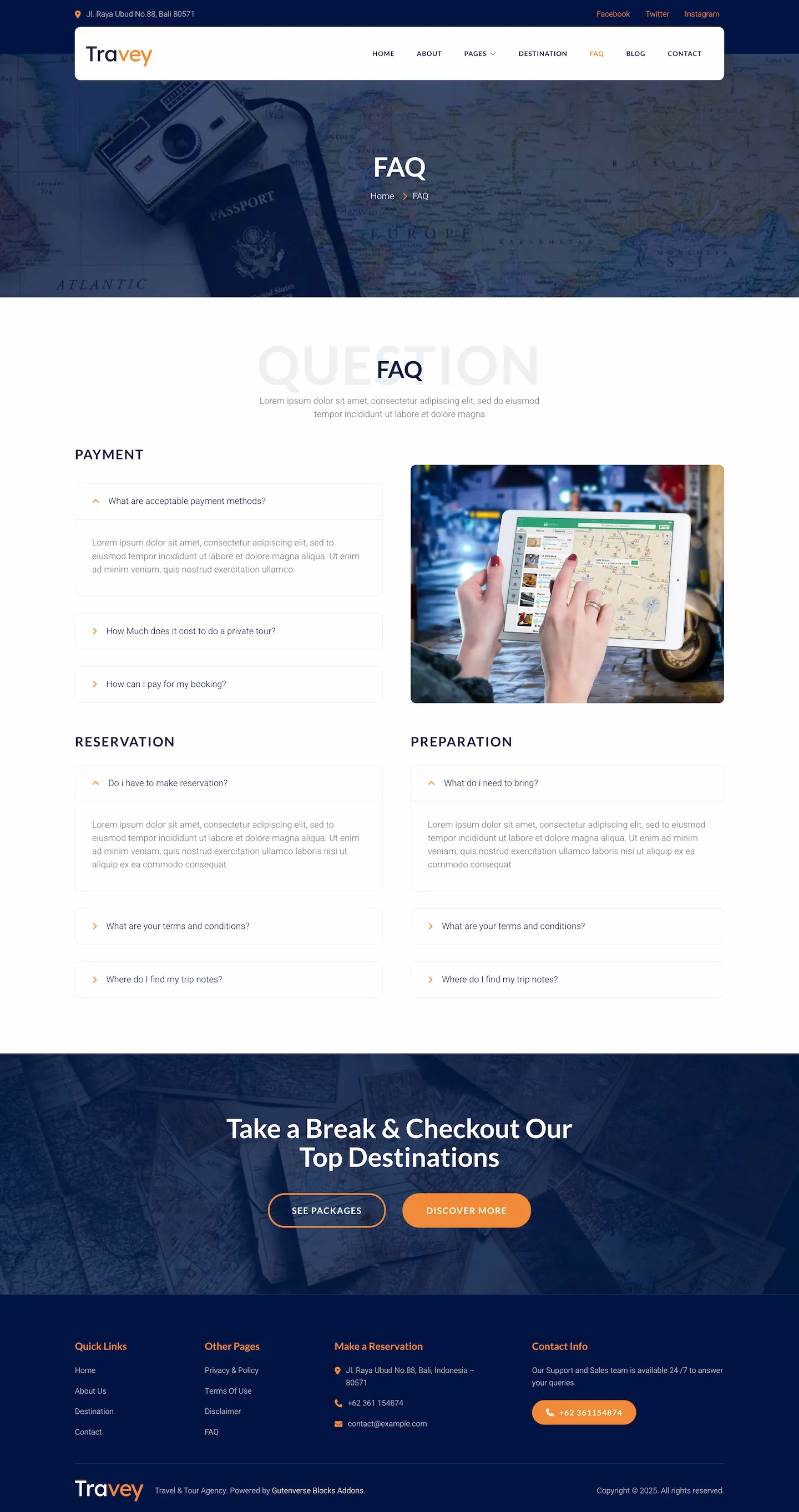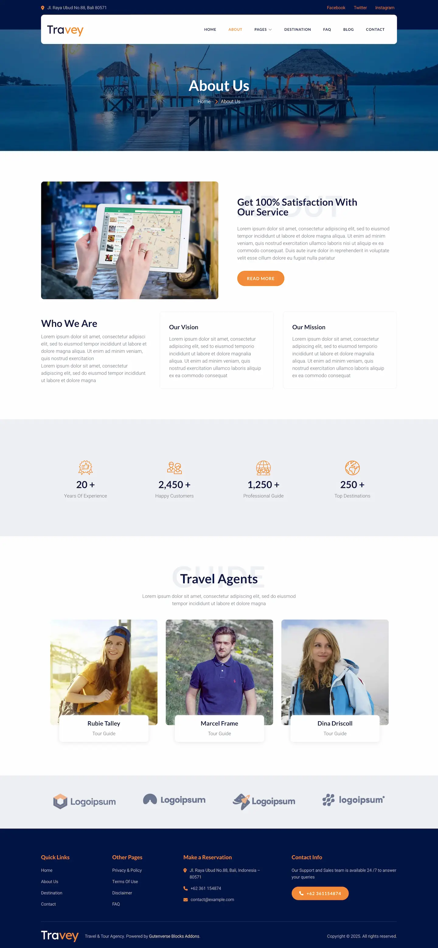 Travey features a simple, responsive, and elegant design perfect for travel agencies, tour operators, adventure guides, and tourism related businesses. Whether you're showcasing destinations, promoting holiday packages, or offering curated trips, Travey helps you create an inspiring online presence that excites and engages travelers.