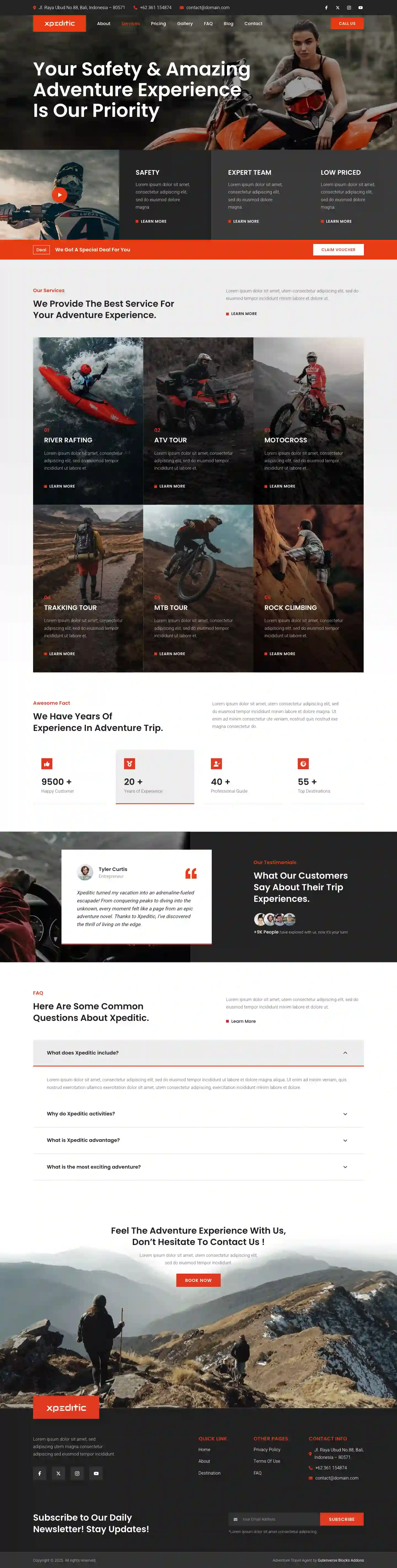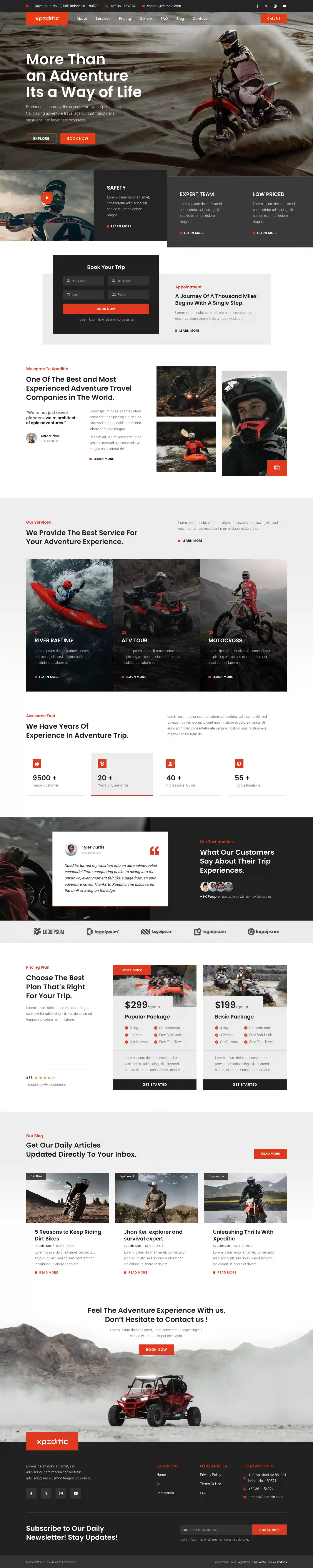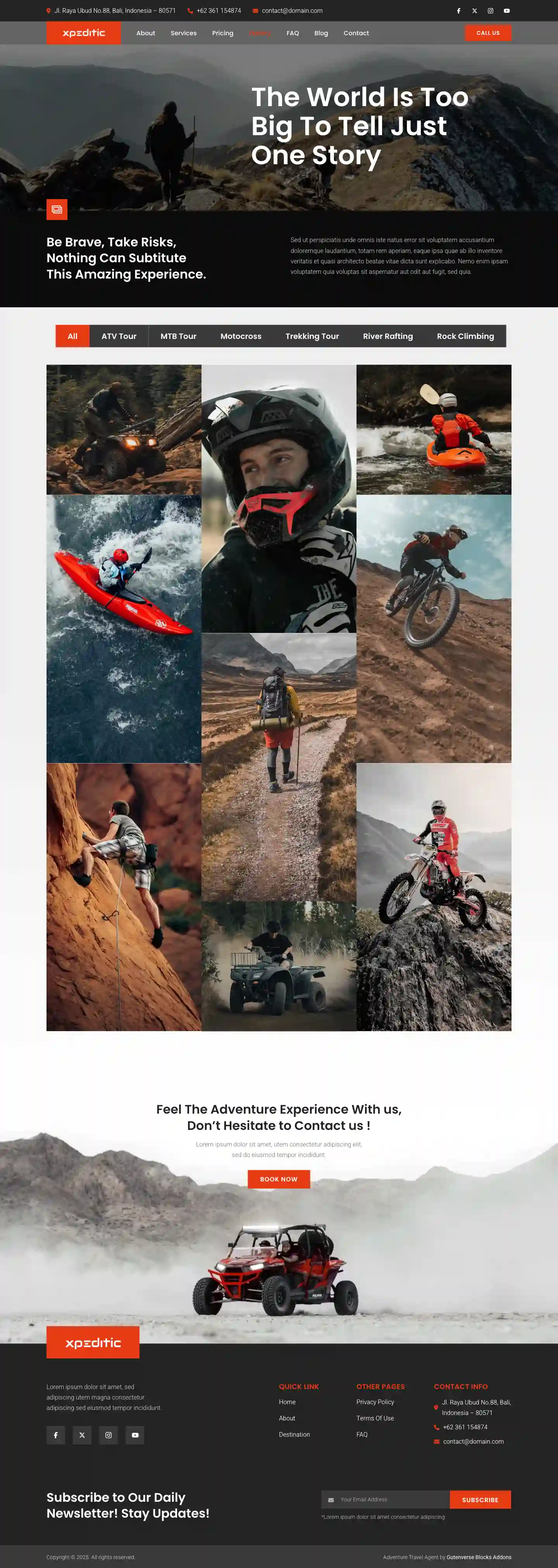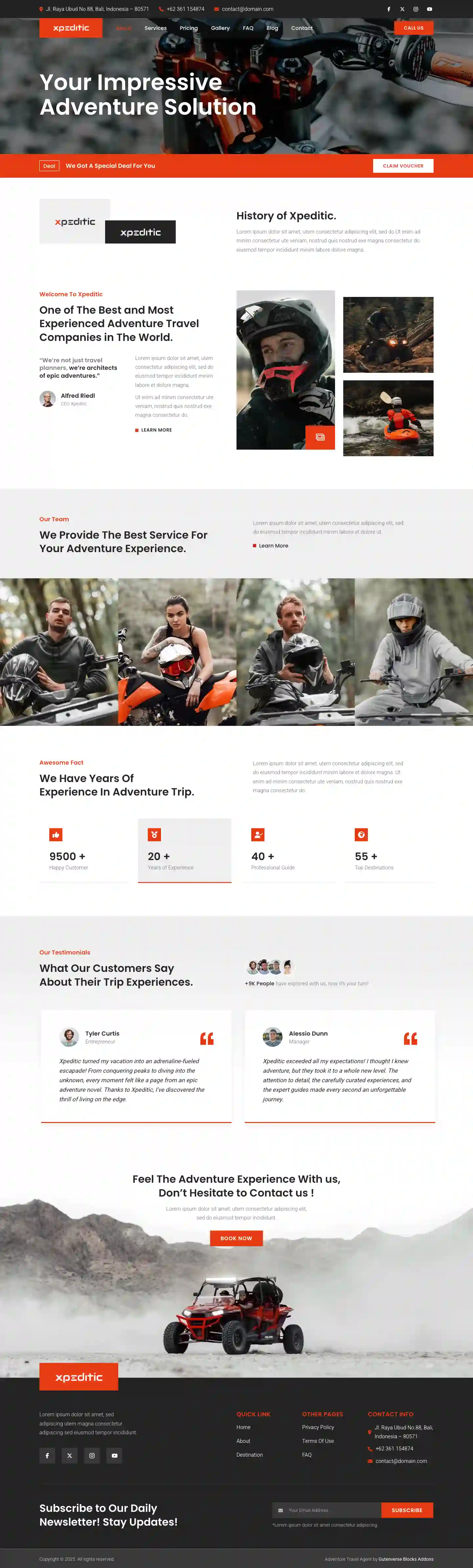 Xpeditic offers a bold and dynamic design, perfect for building websites for adventure travel agencies and tour operators. Ideal for outdoor explorers, trekking companies, eco-tourism providers, and adventure guides. Xpeditic helps you showcase thrilling trips, inspire wanderlust, and connect with travelers seeking unforgettable experiences.