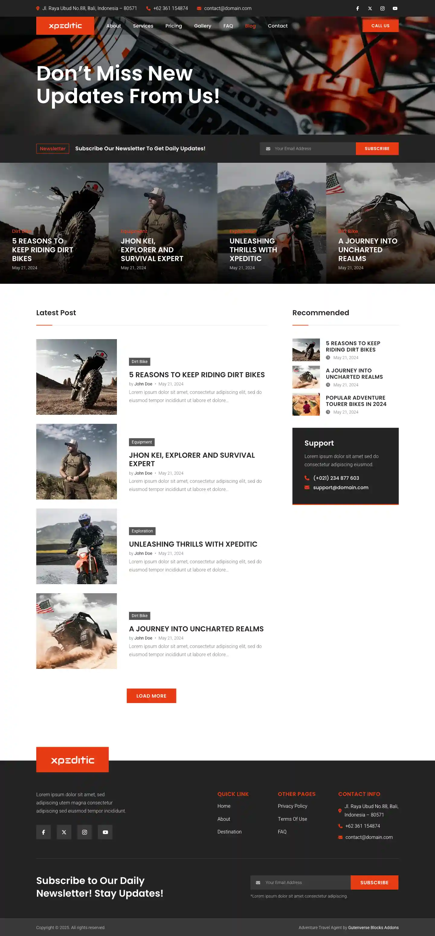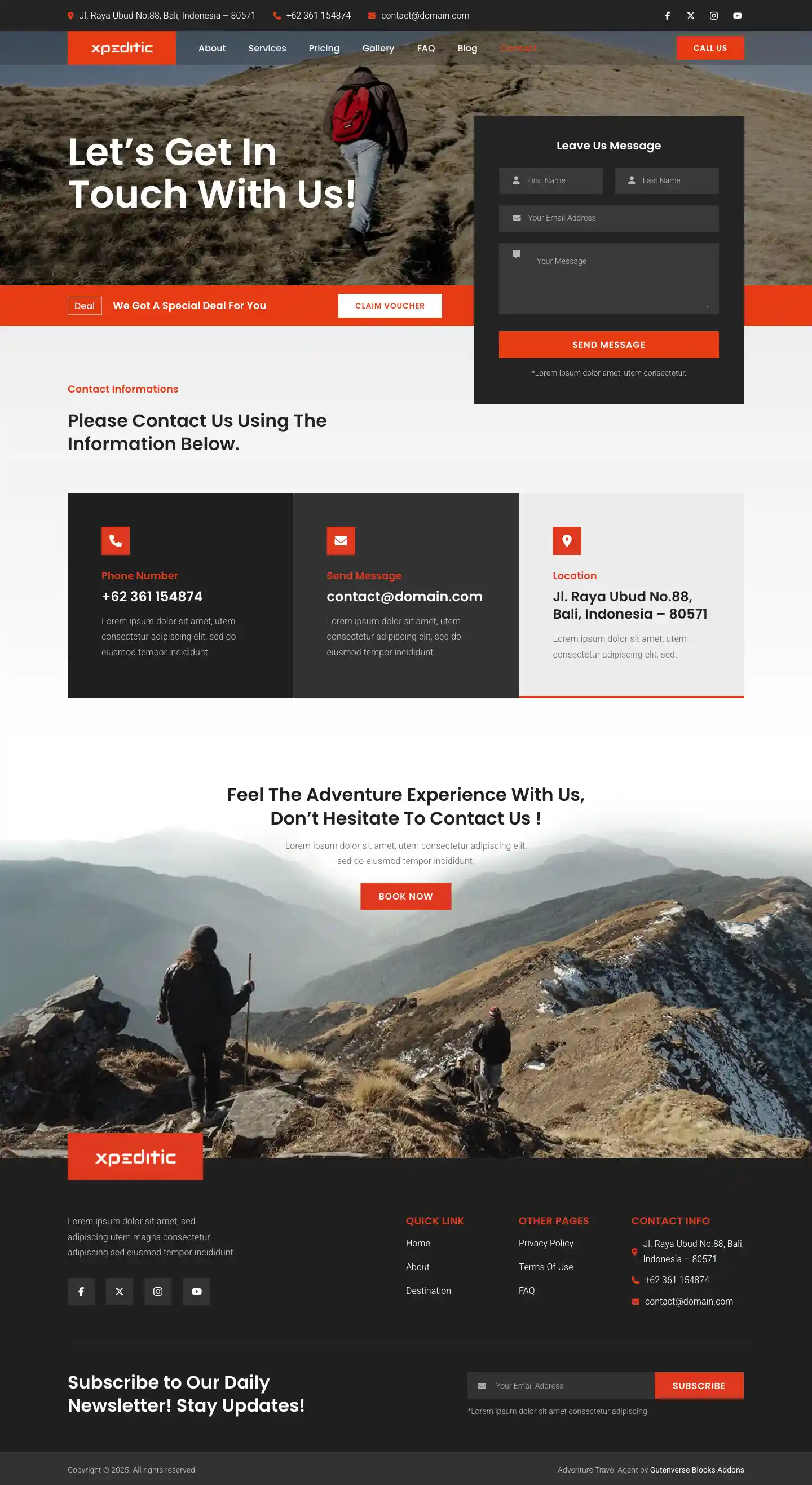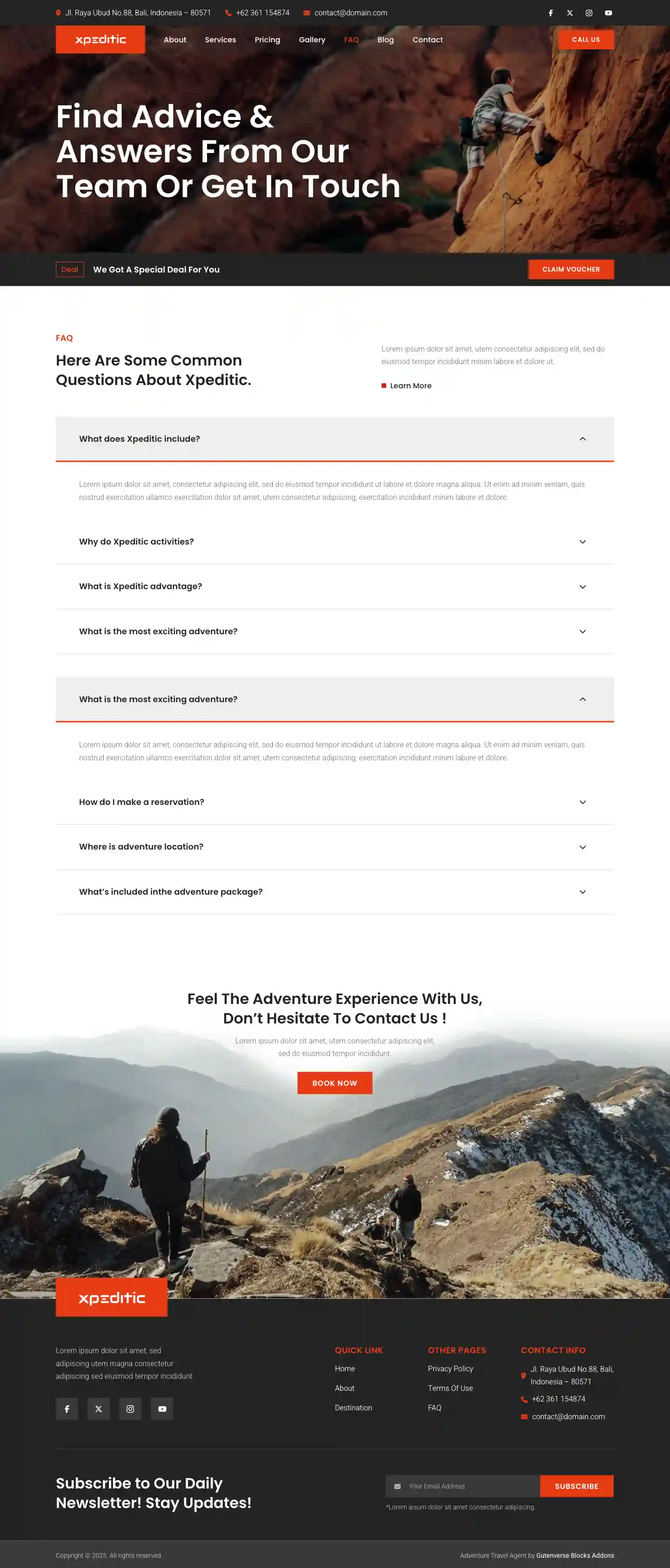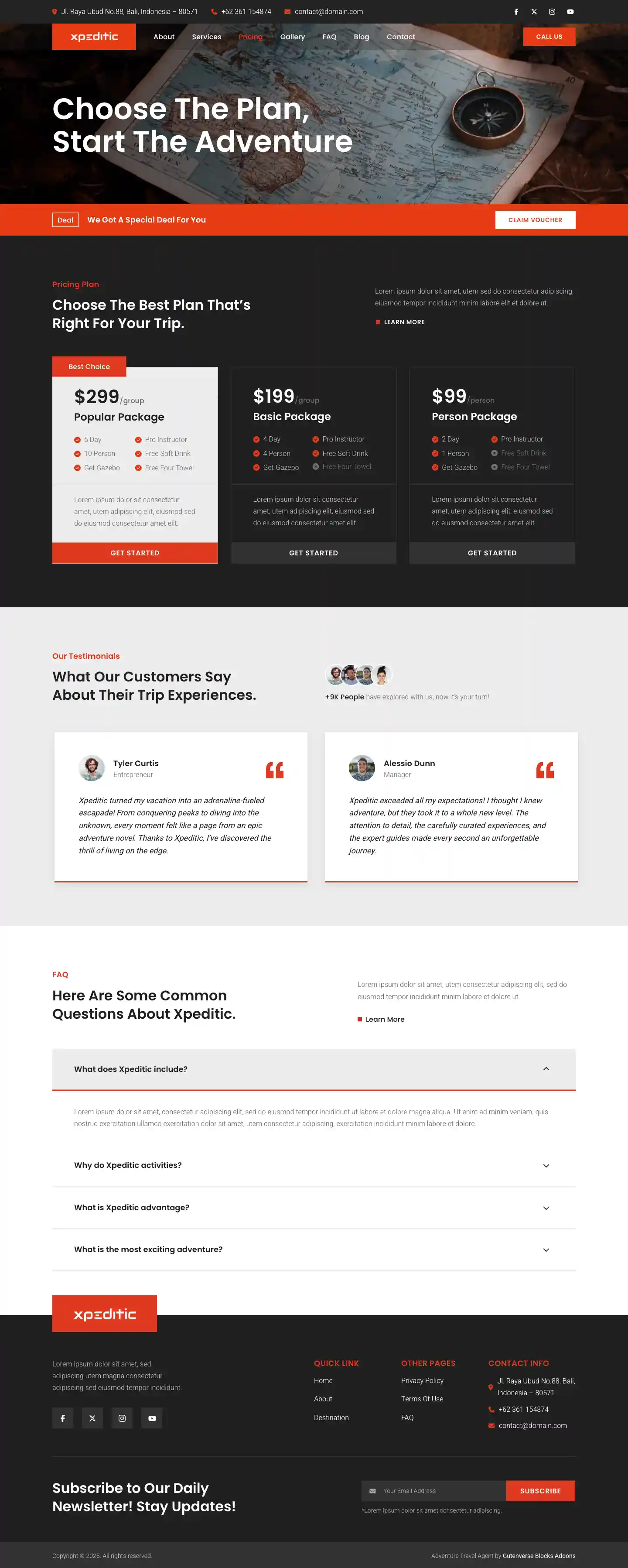 Xpeditic offers a bold and dynamic design, perfect for building websites for adventure travel agencies and tour operators. Ideal for outdoor explorers, trekking companies, eco-tourism providers, and adventure guides. Xpeditic helps you showcase thrilling trips, inspire wanderlust, and connect with travelers seeking unforgettable experiences.